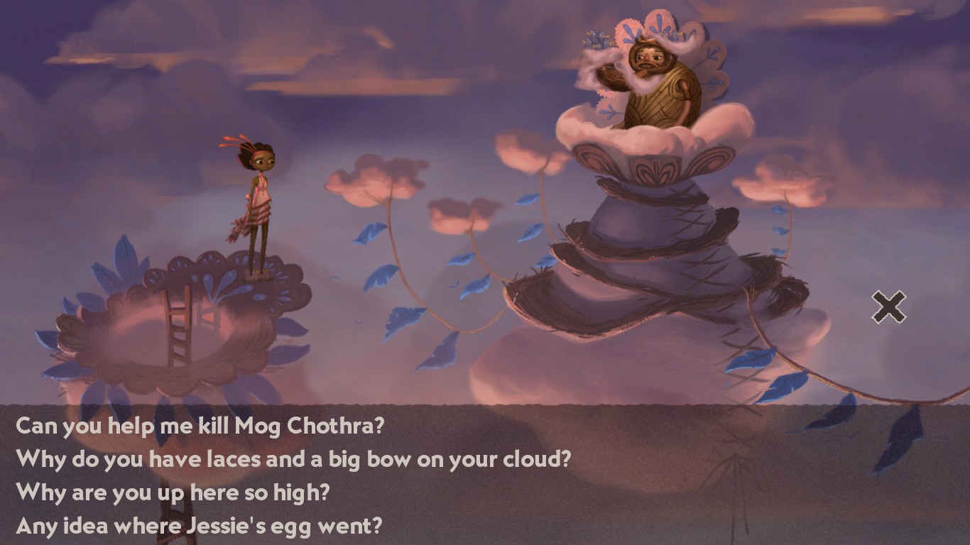 When you start the game you’ll have the option straight away of choosing between Vella or Shay’s tale — both of which can be swapped interchangeably any time you feel like a change of pace. Shay’s story is a bit more exploration and puzzle-heavy, where as Vella’s is more dialogue-heavy with many cutscenes in between traditional fetch-quest segments often found in typical adventure games. You’ll find yourself playing through both characters to get the whole picture here but that’s where Broken Age really shines. Its writing is clever and its characters are done through with a good amount of depth and occasional silliness. Double Fine’s work here is top notch and the various twists and reveals throughout the story kept me reaching for more.