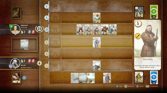 There’s no clear black and white here. Anything that Geralt does could have far reaching consequences or be completely inert, but the game makes no indication of which choices are which. The player will have to discover the consequences of their actions over the course of the 50+ hour story and the 150+ hours of additional quests. Yes, The Witcher 3 is an enormous game, and there is so much content to devour. My current player stats show me having played more than two days’ worth of time, yet my quest list is still massively filled with missions and contracts that I can take on, with many more points of interest showing up on the world map. There’s also the huge distraction Gwent, a full featured card game that has entire quest lines devoted to playing it and collecting cards, which I found myself getting extremely caught up in at any chance I could get.