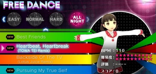 The story is never so good that you forget how contrived it is, but it gets some points for actually trying to be consistent with Persona 4‘s main theme. Most importantly, it gives the characters you know and love ample opportunity to interact and play off of each other. That’s what we’re here for, right? Nearly all songs are unlockable in Free Dance Mode, but beating the story mode will net you the ability to play a stage over the end credit movie, and unlocks some items in the store, including a worthwhile bonus stage.
