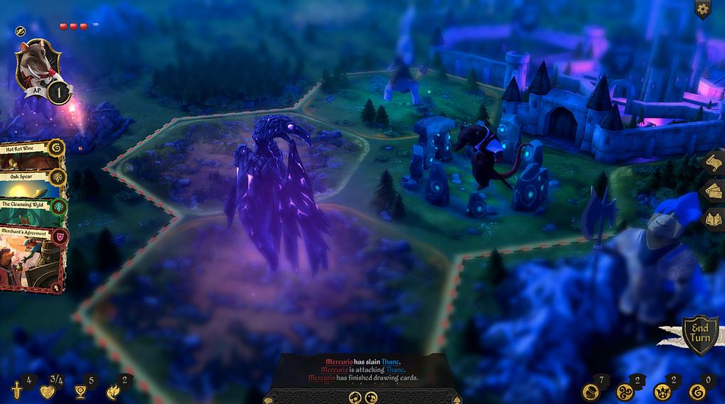 The attacks aren’t simply two woodland furries stabbing one and another with sticks either, aforementioned cards and their stunning articles of artwork like to stir things up. Cards are divided into three decks: “Items” (weapons, armor and tools) “Tricks” (traps and moves aimed at hindering your opponent’s movement) and “Spells” (buffs for defense or the offensive curses) reminding you that this is in fact a deep and well-constructed digital board game. There are over 120 cards in Armello and for the most part seem exceptionally well-balanced, they’re nifty little extras that are blindingly nice to look at and go a long way to promote Armello’s fantastical themes and lore.