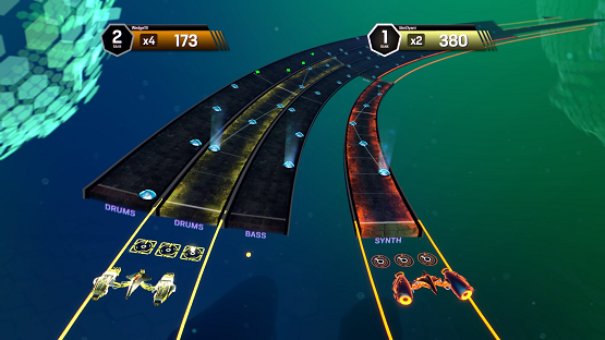 Of course there’s Amplitude’s four-person local multiplayer mode as well, pitting players in free-for-all or team based matches against one another. Power ups can be used to disrupt other players or help your own team and things start getting really crazy when you have four nanoblasters (the things that hit the nodes) each vying for space on the track.