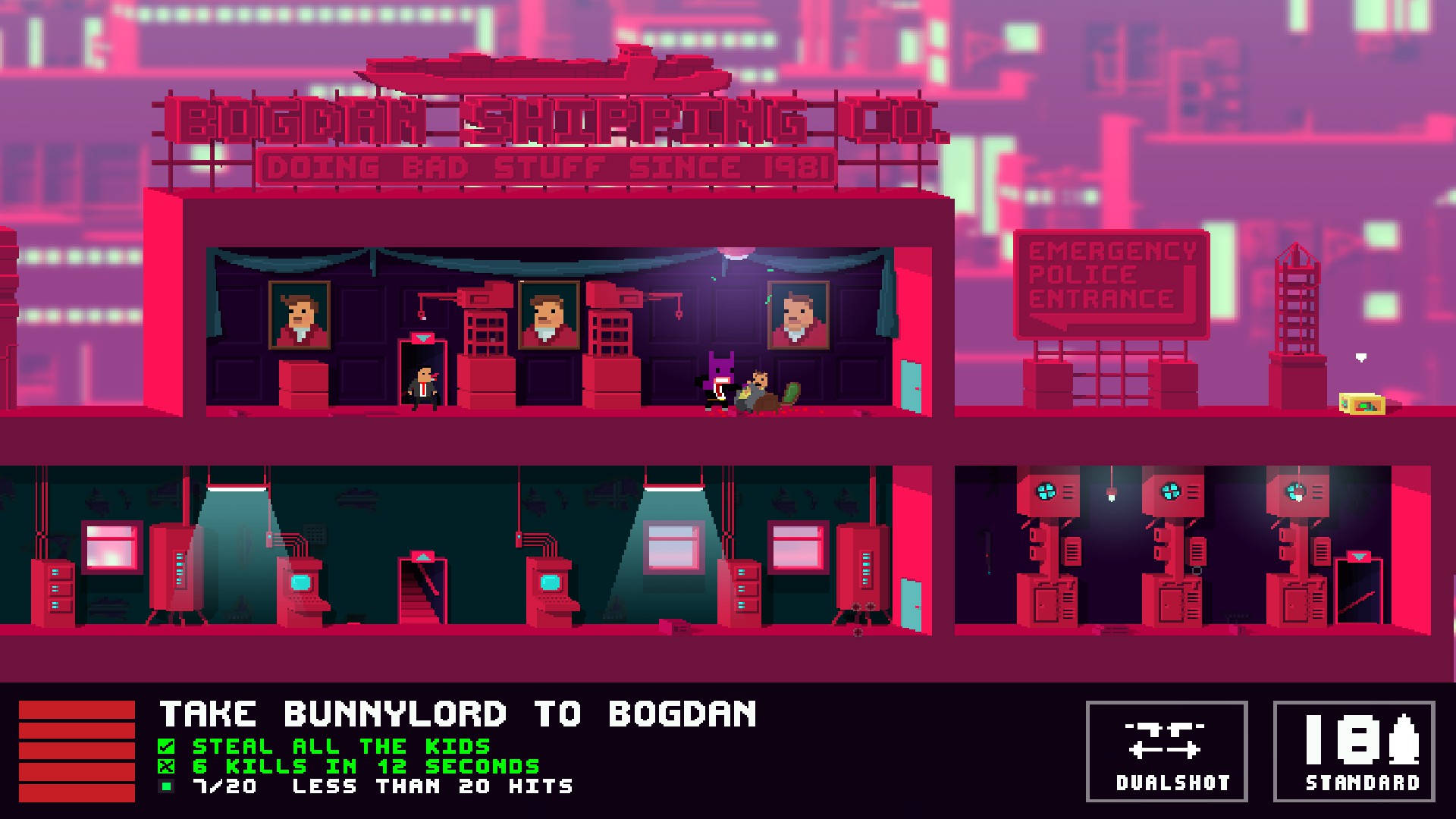 Picking which mercenary to hire to aid Bunnylord is a fun affair, as each possesses a distinct array of abilities that compliment play. They’re little twists and improvements on the basic control scheme, such as increased movement speed, but add that little dash of variety that’s usually welcome but actually unnecessary in such an otherwise stimulating romp through town. Peripheral secondary objectives are often present too, much like its predecessors skillful tasks, and play on things like bullet consumption and object retrieval to cause thought for more than just blind murdering. These provide basic yet enticing reasons to dip into the pixel storm post-completion, simple and effective.