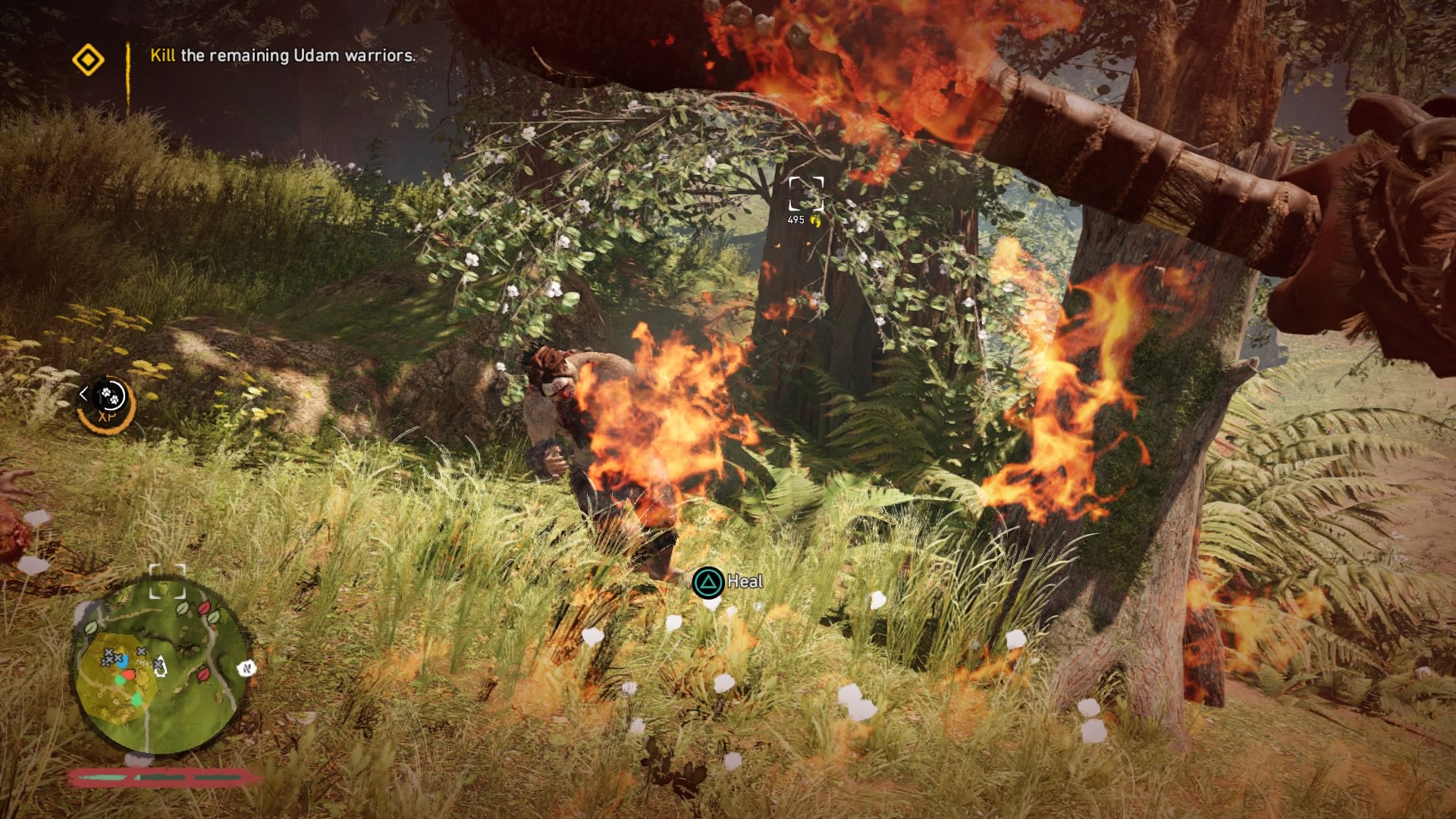 Well, not everyone. Takkar escapes and and this is where Far Cry Primal begins, with absolutely nothing. Takkar must build his way up from this nothing, starting with crafting a bow, hunting for food, and then reuniting the Wenja together to defeat two rival tribes, the Udam — a vicious tribe of flesh eaters — and the Izila — an agile tribe with a fire fetish. This is the intrinsic narrative to Primal, and it doesn’t get any more complex, which both lends credence to the primitive feel and makes the entire thing feel like it’s missing something.