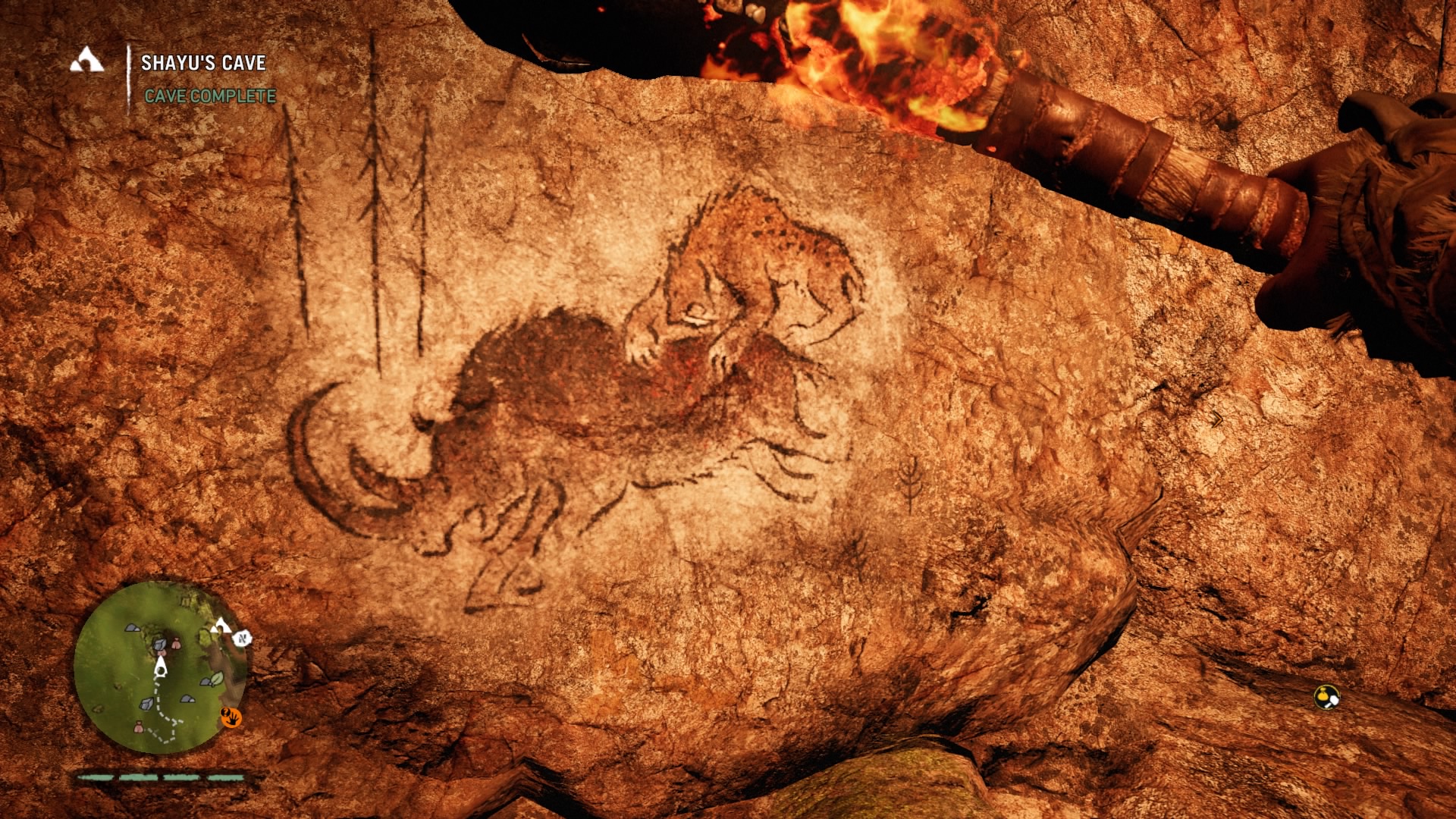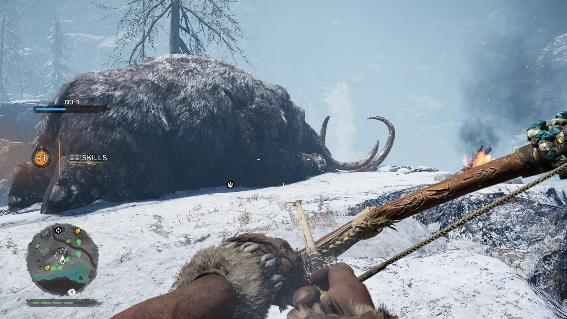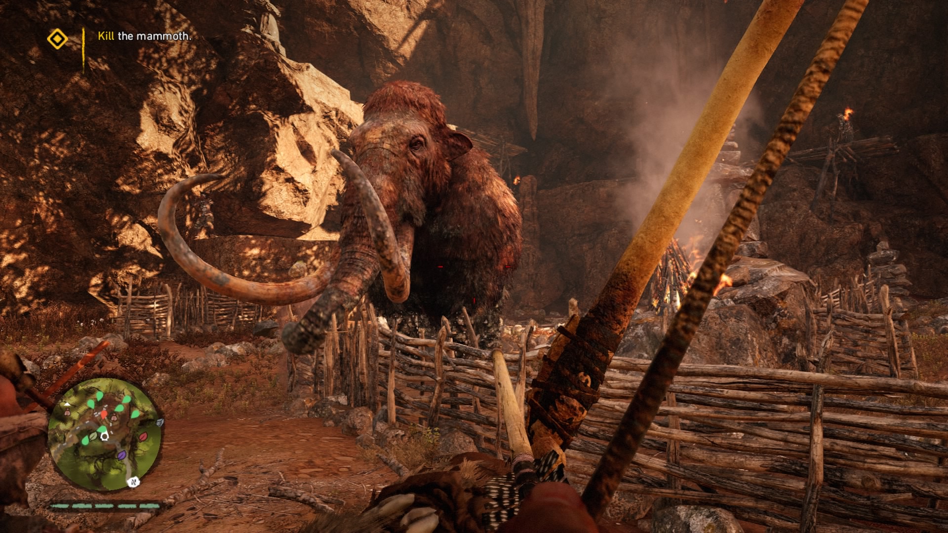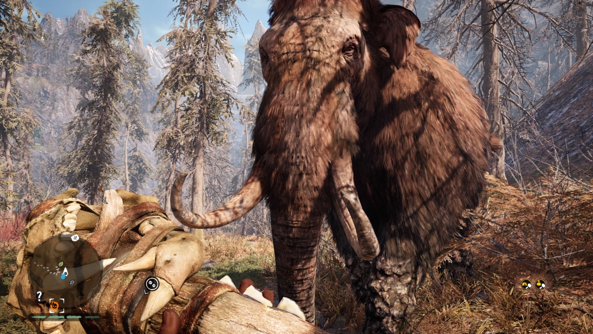 If you played Far Cry 4, it quickly becomes apparent that someone hurled that Blu-ray disc 12,000 years into the past to gather some prehistoric cave paint. Bows have always been a staple of the Far Cry games (arguable the most fun weapon to use). The woolly mammoths are essentially just Far Cry 4’s elephants. The animations of skinning animals and looting bodies haven’t changed, but they can be thankfully turned off in Primal. Even mission types are basically reskinned versions of the 2014 model. Underneath the shifting glaciers and mud huts, much of Far Cry as we know it has been copied over. Primal maintains a good disguise, but riding a mammoth through an Izila fort would have more impact if we didn’t do the exact same thing in Kyrat a little more than a year ago.