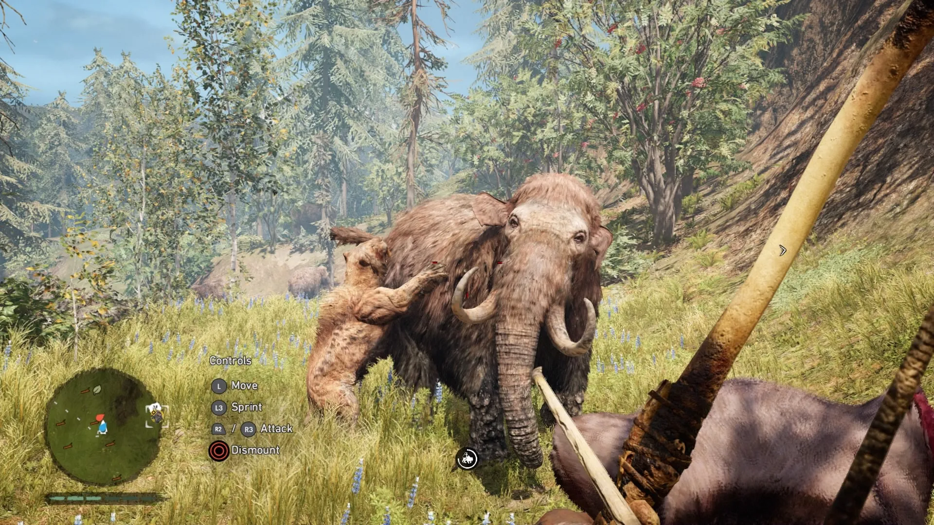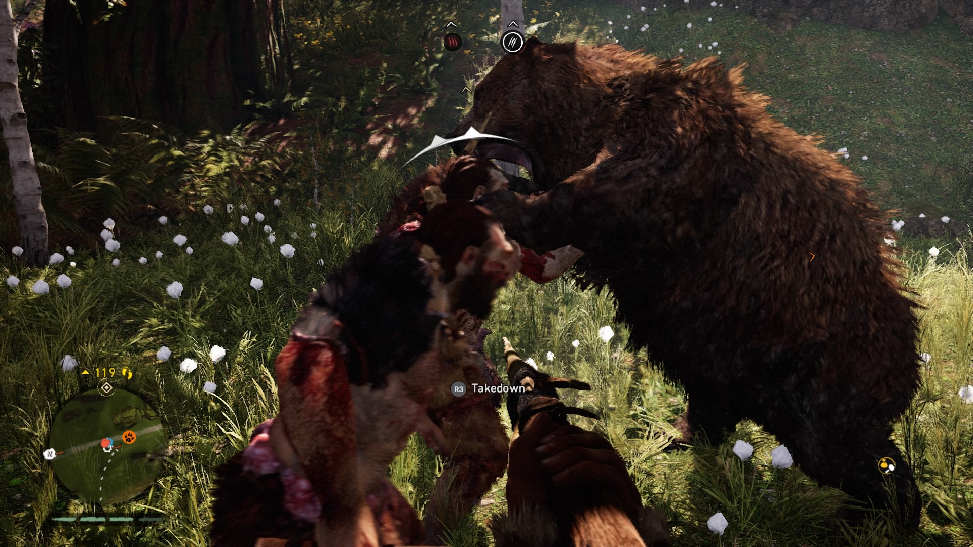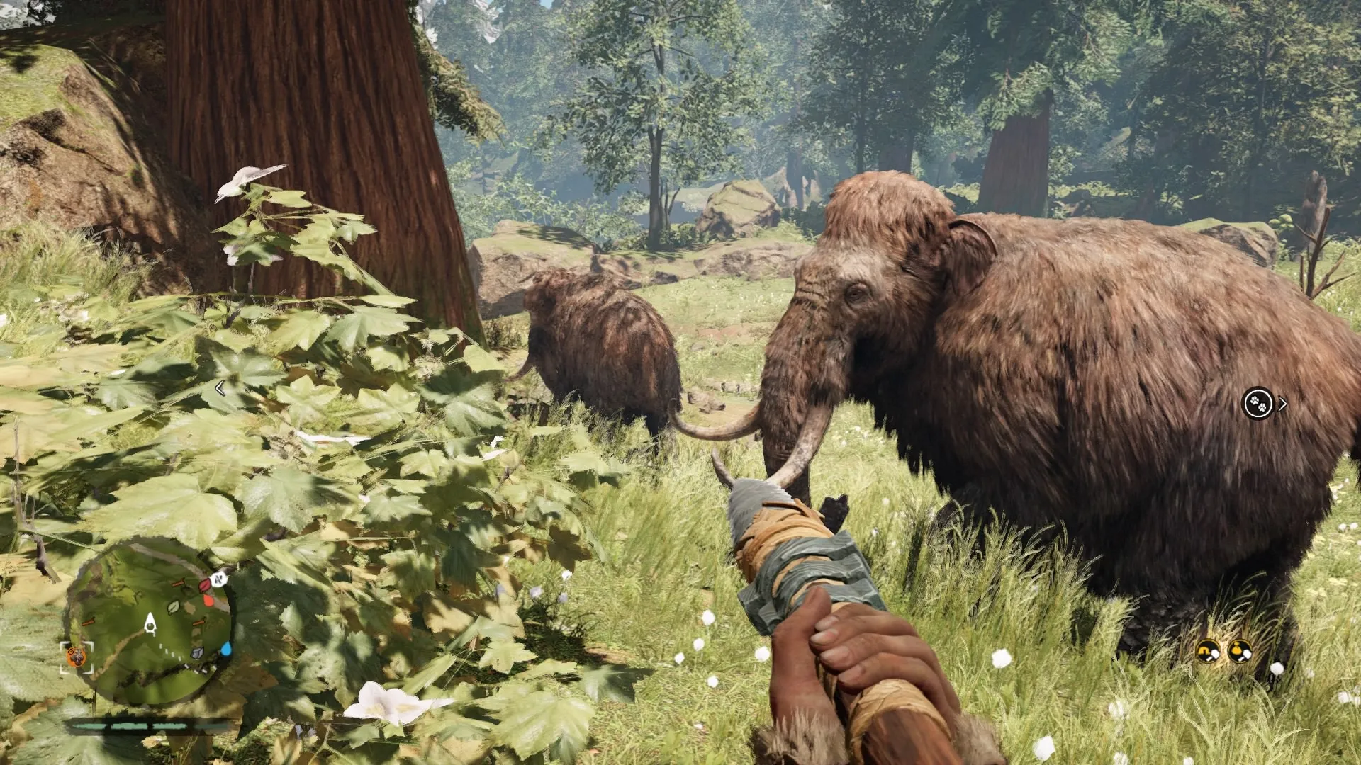 If you played Far Cry 4, it quickly becomes apparent that someone hurled that Blu-ray disc 12,000 years into the past to gather some prehistoric cave paint. Bows have always been a staple of the Far Cry games (arguable the most fun weapon to use). The woolly mammoths are essentially just Far Cry 4’s elephants. The animations of skinning animals and looting bodies haven’t changed, but they can be thankfully turned off in Primal. Even mission types are basically reskinned versions of the 2014 model. Underneath the shifting glaciers and mud huts, much of Far Cry as we know it has been copied over. Primal maintains a good disguise, but riding a mammoth through an Izila fort would have more impact if we didn’t do the exact same thing in Kyrat a little more than a year ago.