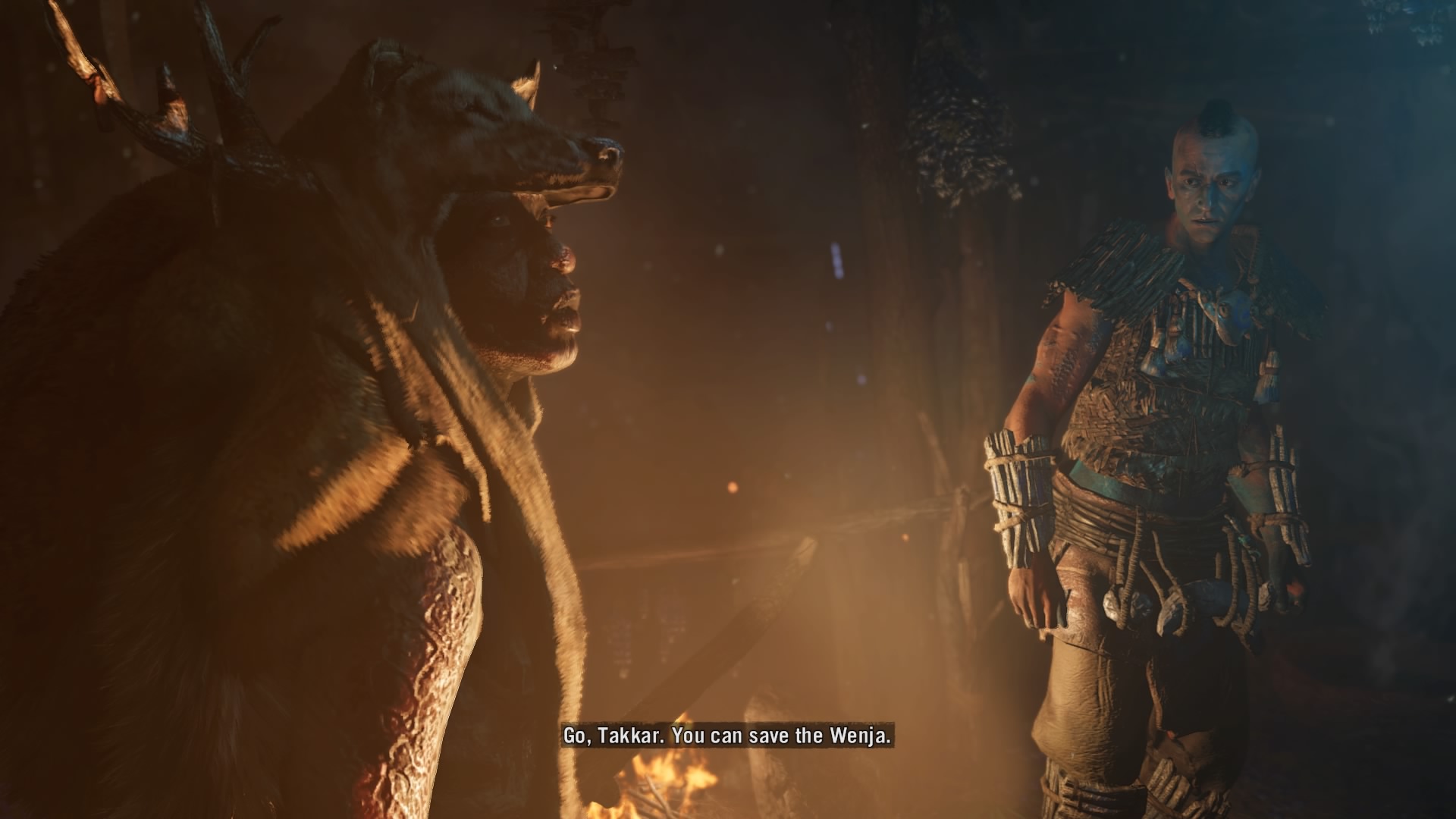 Primal’s mission structure was designed to be more open and to avoid a narrowly told story, but it undermines the ability to have an engaging narrative. To help sell the primitive world, Ubisoft created a language for the Wenja, and it is spoken throughout the entire game, with English subtitles for those of us who failed to study fictitious dead languages. The language barrier creates authenticity, but also pushes the player out. We’re not given anything to relate to Takkar. The basal set up for the rest of the game is thin and we know next to nothing about Takkar, his history, or the Wenja as a people.
