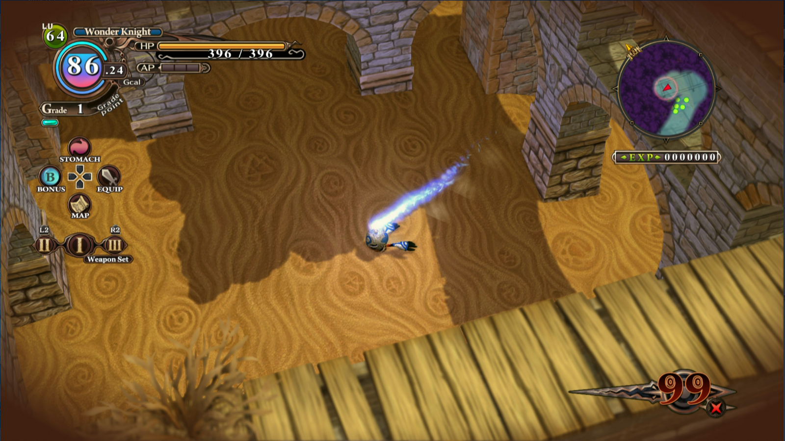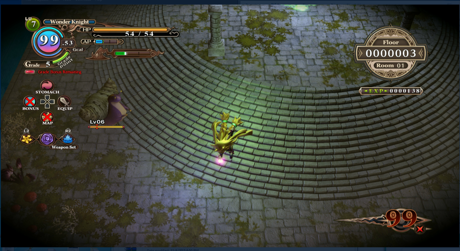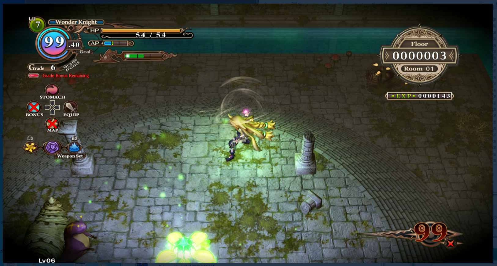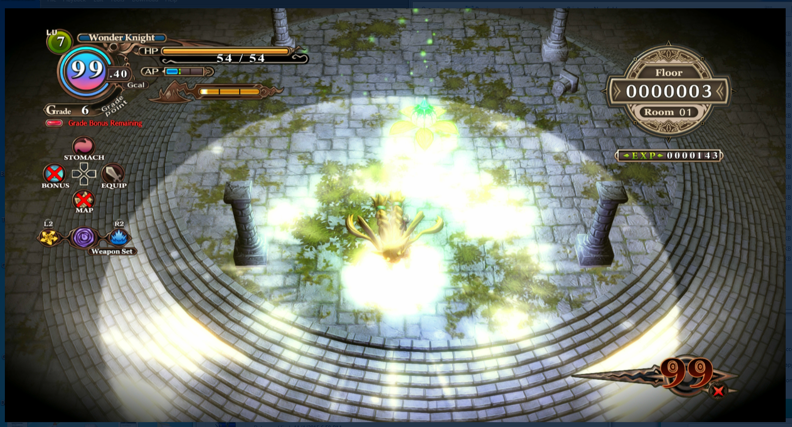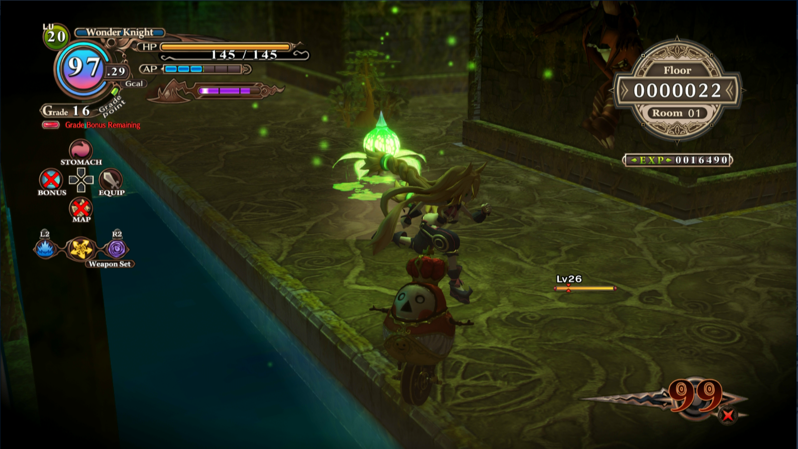 One unique aspect to combat in TWatHK is the combo system. You can equip up to five weapons at a time, in slots 1 through 5. Each time you press Square in quick succession, you use the next weapon in the chain. It’s the mix and mash of weapon number and type (there are three) that determines how much of a damage multiplier each weapon receives. Get the right weapons in a row, and your damage will quickly rise. Beyond that, you can also change which Facet, or version of the Hundred Knight you will use. Once they are unlocked, Facets change which attributes of the Hundred Knight are enhanced, such as extra HP and ATK in exchange for reduced mobility. Tochkas, or support units, are unlocked after a few hours, and begin to open up options to the player.