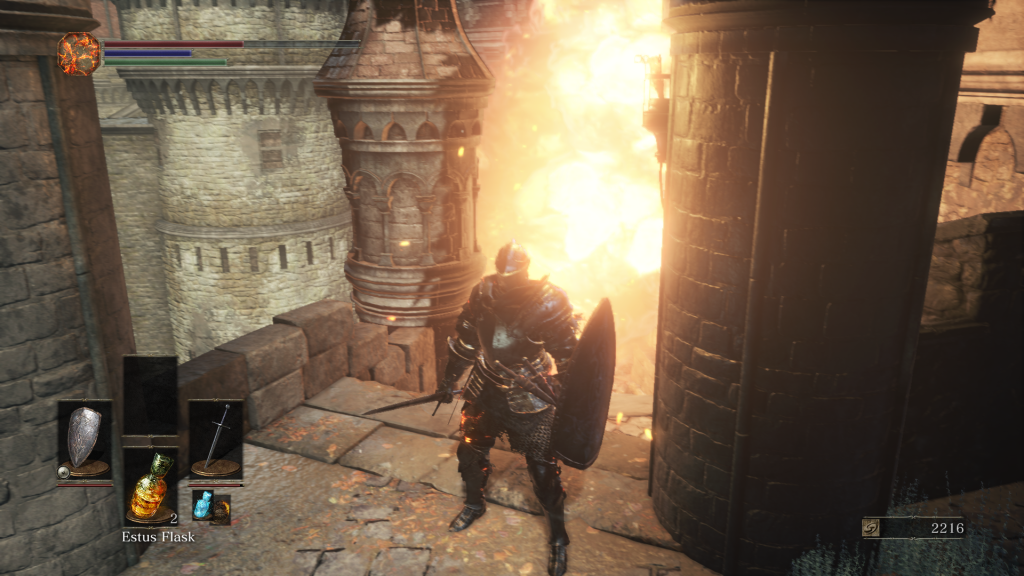 In-game bonfires serve as checkpoints, in a series mainstay. You use these checkpoints to rest, which will instantly heal you. Estus flasks, which you drink from to regain health and/or mana, are also filled at this time. However, any enemies that you have killed in the area are also instantly reset to their original positions. Any bosses killed or items destroyed are not reset, though, which can lead to a somewhat different playthrough of the area the second time and beyond. The only time the maps completely reset are when you travel back to the Firelink Shrine, which serves as your main base of operations.