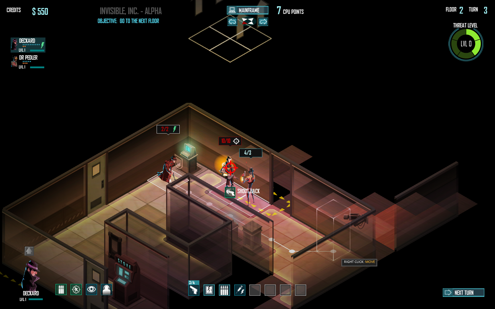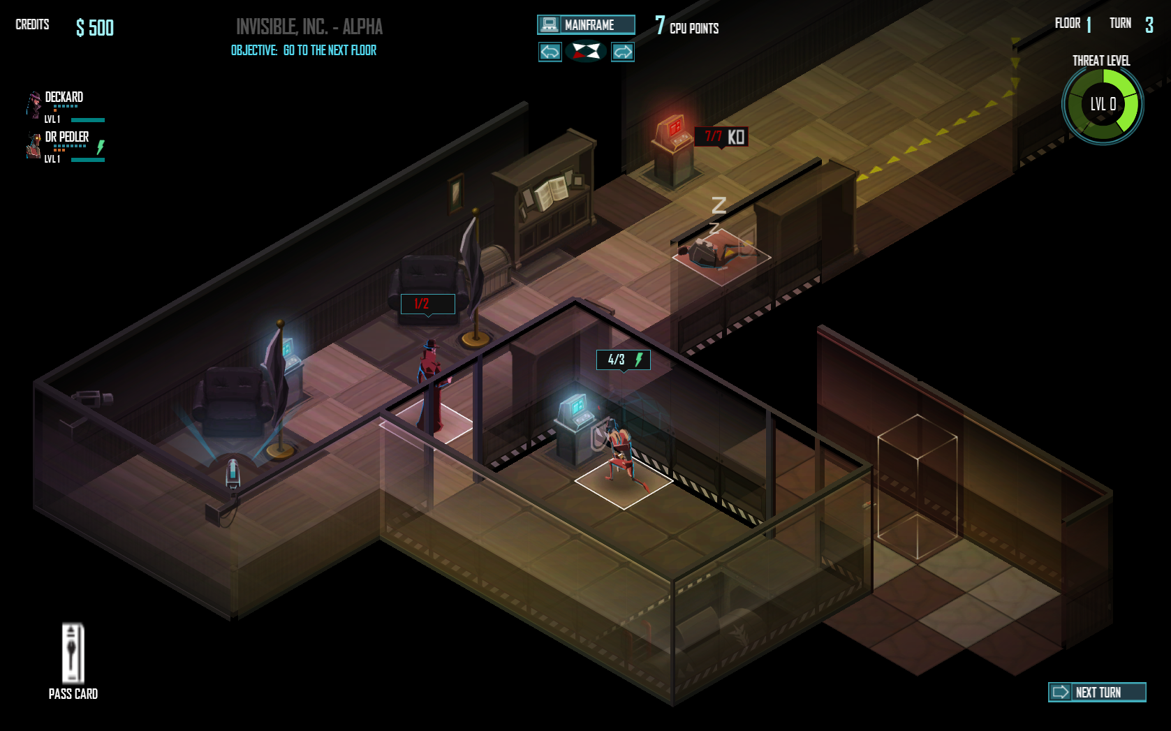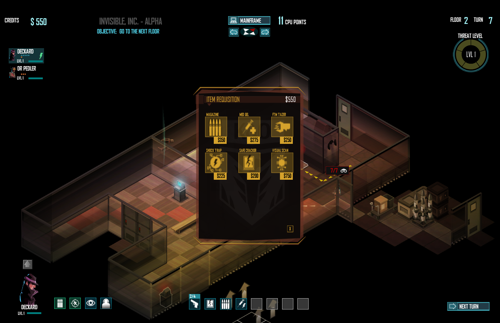 Completing them, though, is a lot easier said than done. Once you’ve picked a facility to infiltrate, the game randomly generates its interior and contents, from the credits and items you can pick up to the guards and security cameras lurking around every corner. Things then play out like a combination stealth game and turn-based strategy RPG. You move your characters on an isometric map, but how much of that map is visible is determined by where they’re located and what actions you’ve taken. For example, you can approach a door, but what’s behind it won’t be visible to you until you peek through or actually open it. As you disperse your agents further and further throughout the facility, the map blooms from a single room into a large and often daunting set of passages and rooms — with corners to duck behind, safes to hack and plenty of obstacles to take down or avoid.