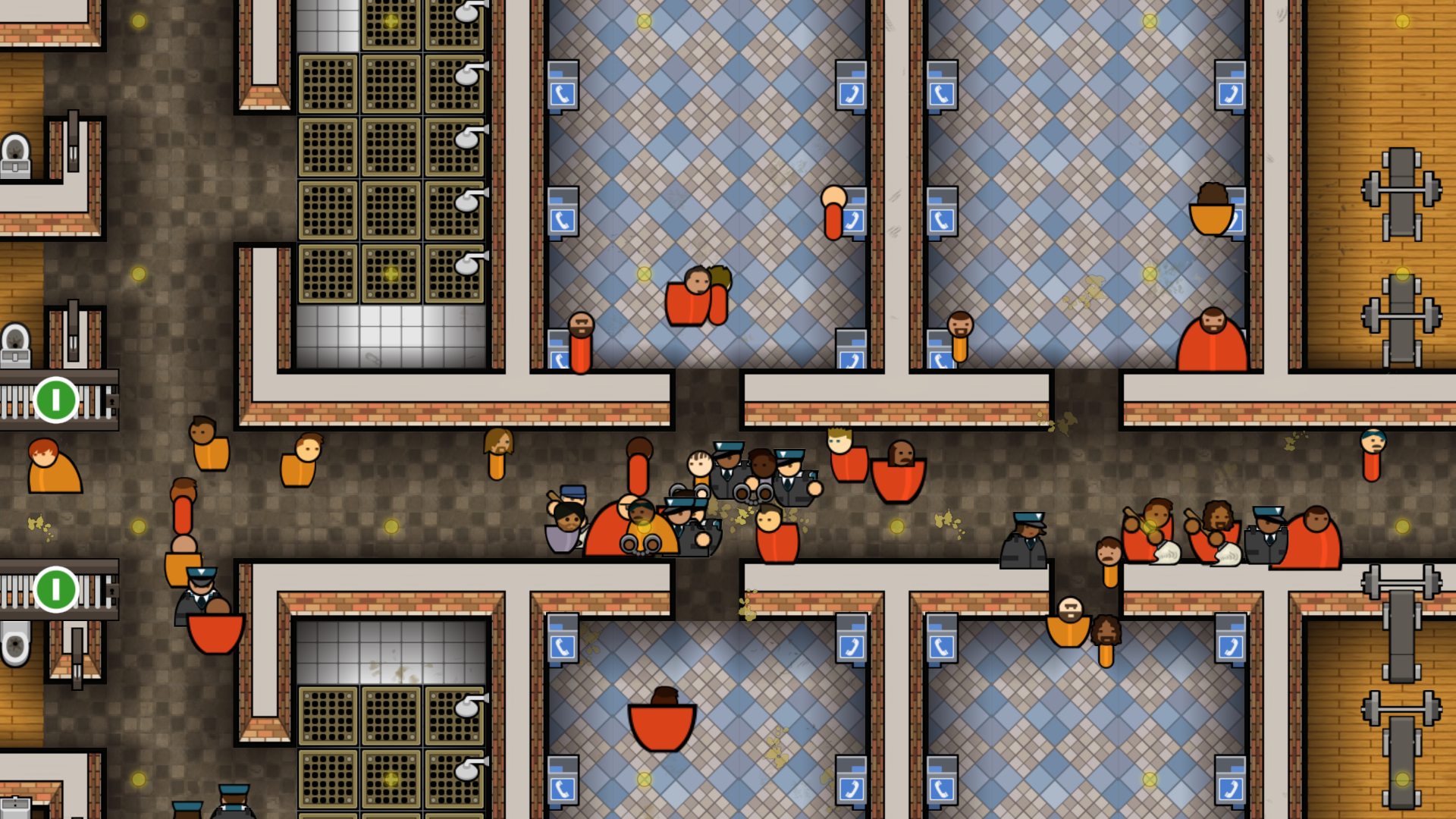 Apart from the campaign mode, there are the two sandbox modes: Prison Architect and Prison Warden. Prison Architect starts you from square one so you can really test yourself. Prison Warden lets you jump a bit ahead and pick a warden with a special modifier (like the doctor who does tests on the inmates via the water supply, making them all strangely calmer sometimes), and then pick a map. The map can be one of the cool pre-made prisons or a bare plot of land with interesting features. Hint: water features are a new landscape option in the console release. You can also change a few game modifiers to make it harder, including allowing gangs, which are more dangerous and hard to control.