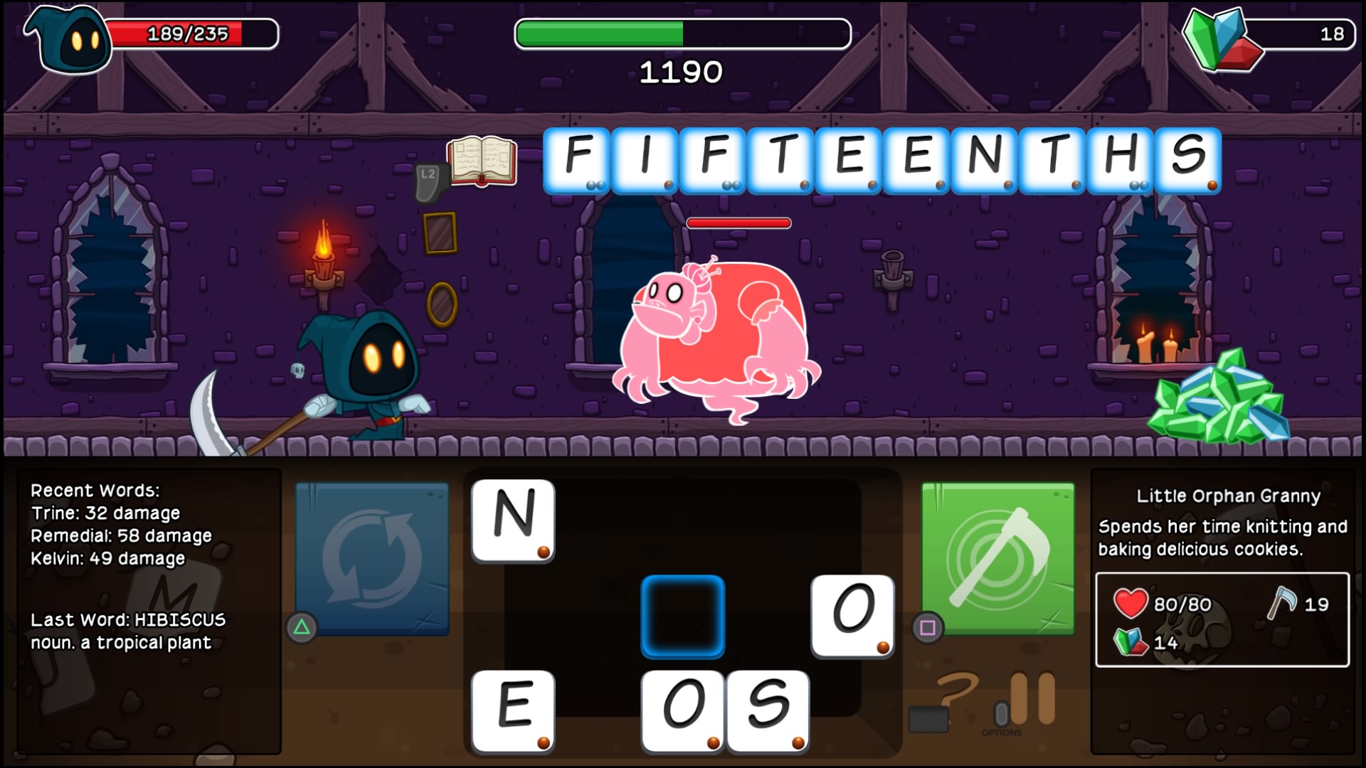 The main crux of Letter Quest is to do battle with monsters of every variety, using the power of the dictionary as a defense. No, you are not fruitlessly chucking massive leatherbound volumes at ghosts. Instead, you’re forming words to cast spells or attacks, directed at the series of adversaries thrown in your way. The strength of these attacks depend upon a variety of factors including the obscurity of the letters used, the length of the word, or what power ups and multipliers Grimm and Rose have enabled. For example, using letters like Q, X or Z have three times the value of a letter like A, S, or T. Additionally there are more middle tier letters like B or U that can inflict double the damage of the lowest value letters. The goal is unleash the most pain possible, in order to dispatch of enemies swiftly. After all, if you take too much time, enemies tend to dish out a little punishment of their own.