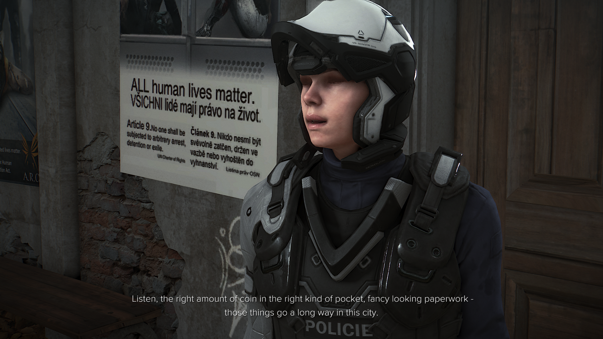 Most of the game is solid, but a few issues reared their head while playing through Mankind Divided. First, after a day-one patch brought the game up to version 1.02, about half of the non-critical NPCs stopped talking to us. While the story progressed along just fine, as did side missions, it was a little jarring to see NPCs look at you, and not say a word. First, there is some additional content to unlock if you have the Deus Ex Universe application installed on your smartphone. Finding a triangle symbol in the game enables you to scan it with your phone. Unfortunately, after trying with a Samsung Galaxy Note 5 and Galaxy S7 multiple times (phones which are known for having wonderful cameras), the app could not pick up the symbol.