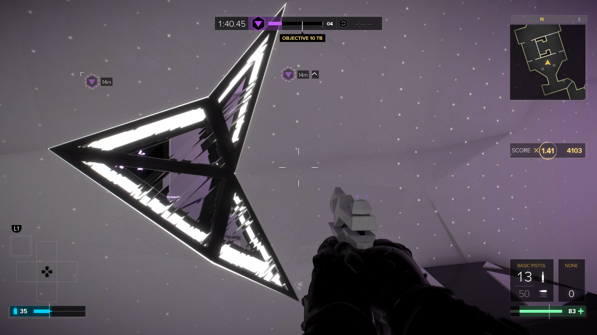 This Dawn Engine also runs the new Breach mode, which could be a standalone game on its own. In this mode, you play as yourself, logging into a virtual world which represents a mega corporation’s servers – it’s all explained in an introduction video. Many of the game’s rules still apply, but are tweaked slightly. Familiar augmentations from the main campaign are here in full force, but others such as a double jump are especially useful in the sterile, occasionally warping levels that you’ll find your avatar placed in. Your goal in each level is to find servers, represented by dark cubes, and download terabytes of data as quickly as you can. Download enough data, and you can complete the level, but not before racing towards where you entered as the area’s AI begins a countdown to rip you out of the level.