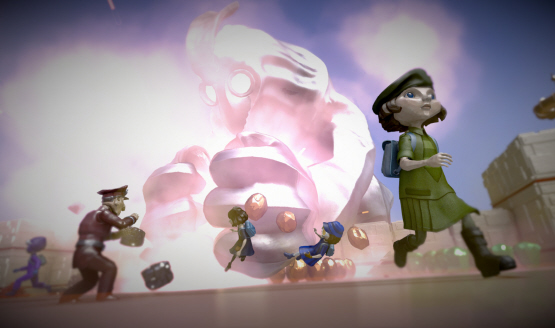 Aesthetics can be a great asset to developers; especially when I play games. I love seeing the creative products of humans, and The Tomorrow Children is a special creation. Everything looks miniature, and all the players and humans are dolls. The lighting and colors of the game suggest small, brightly painted objects and a close-up field of view. The sunlight is well done and always creates screenshot-worthy dusks and dawns. The mining islands that appear in the distance are extremely intriguing and provide almost endless exploration, due to the fact that they are only there a short while before disappearing and being replaced by a new island in a bizarre shape (think gigantic radishes growing out of books, or floating sushi).