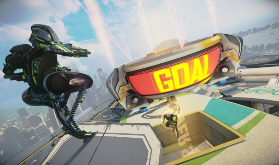 Each of the modes feels as idiosyncratic as the arenas, which provide differing pathways of ramps and tunnels. First up is a traditional team deathmatch style game, each kill offering points to the team. This is the mode that’s most heavily populated online, which disappointed me because I find the other two modes infinitely more interesting. Powerslam is a basketball type mode, where kills power up your RIG. When a RIG is fully powered, they can jump through a hoop in the center of the arena to score points. The final mode is Endzone, taking cues from American football, except, you know, with giant robots and guns. This is where you can draw the heavy parallels to Rocket League, taking a typical game type — in this case a first-person mech shooter — and turning it into a sport.