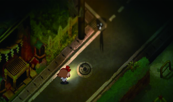 Yomawari‘s tensest moments occur when you narrowly escape a spirit, and hide behind a bush or notice sign. While you’re hiding, you cannot be attacked by a spirit, but you also cannot see anything but the object you are hiding behind. As your heart beats, it sends out a wave of red, and spirits are represented by a red smoke-like sprite, which usually walks away and out of sight, giving you a few moments to leave your cover and explore some more.
