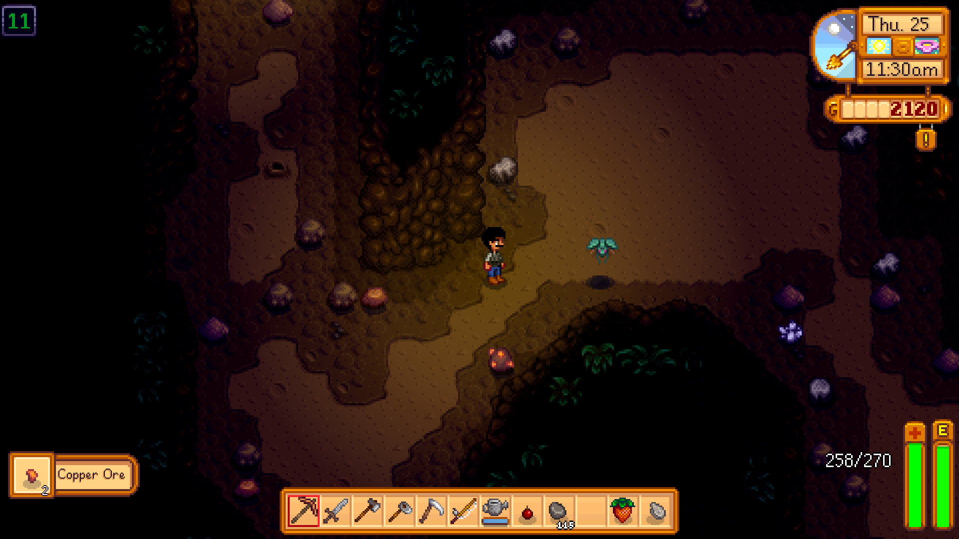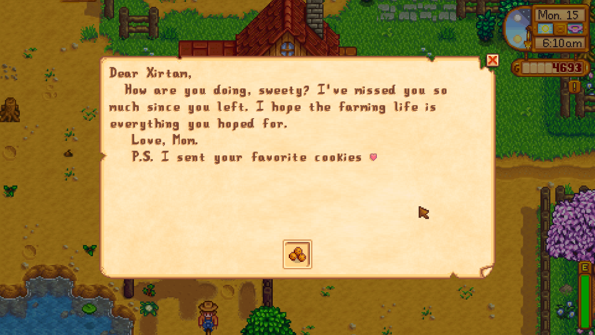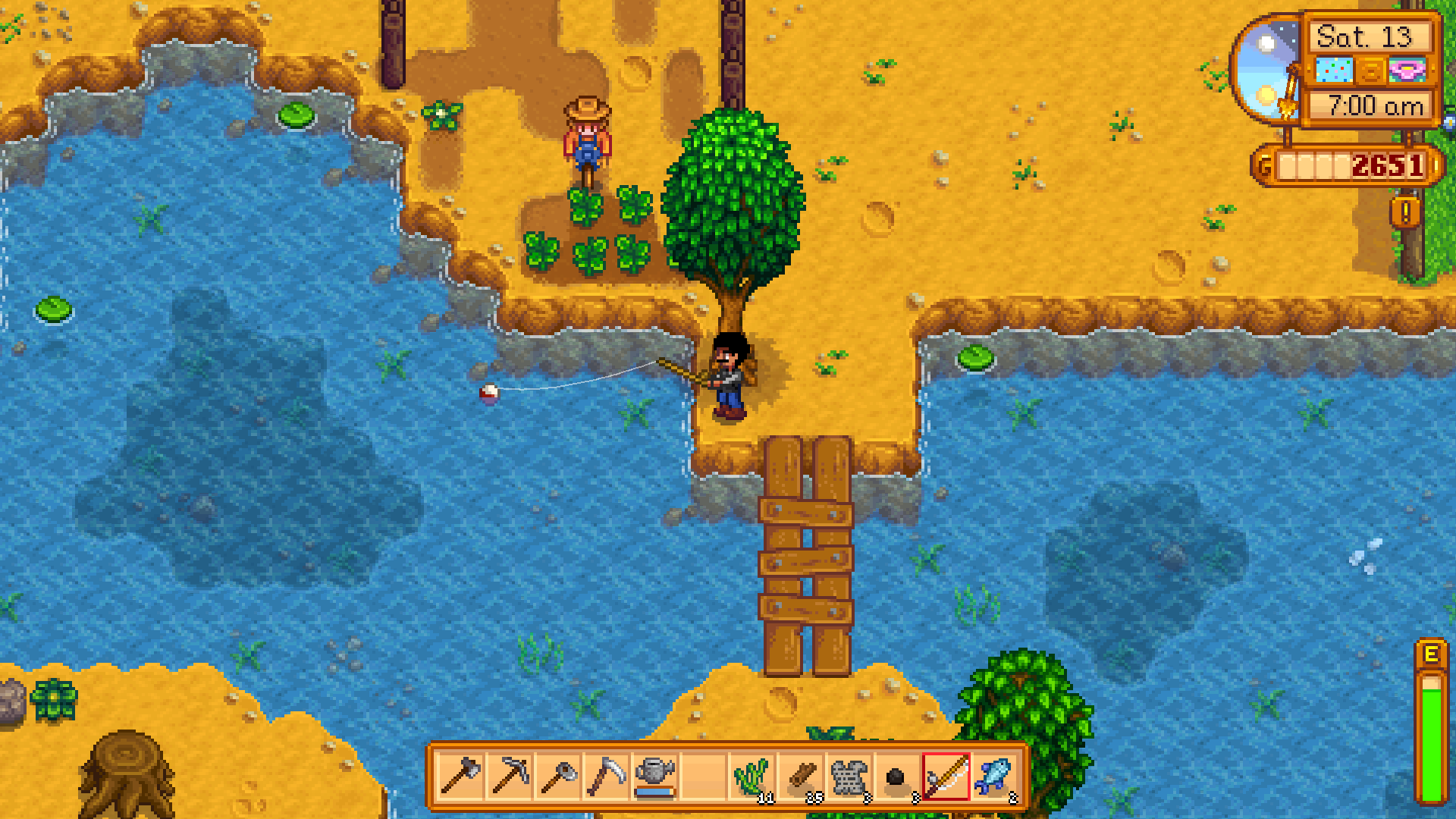 Days progress rather quickly in Stardew Valley. Time progresses in chunks of 10-minute intervals, each of which only lasts 7.5 seconds (that means 45 seconds real-time is one hour game time). Each year of the game is divided into four seasons, each of which are 28 days long. Each season has its own unique catchable fish, town events, harvestable crops, and other time-specific mechanics to get used to and take advantage of. I would have loved to see an option to have the game behave a bit more like Animal Crossing, where the game’s clock is based on the real date/time, but things would’ve progressed so much more slowly if that was the case.