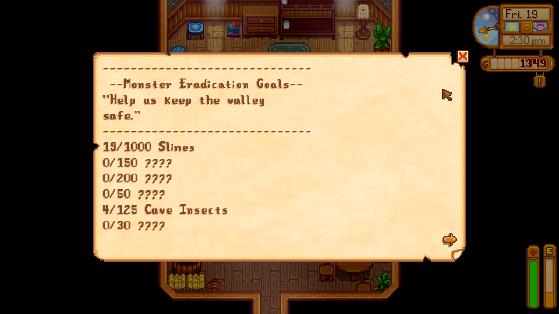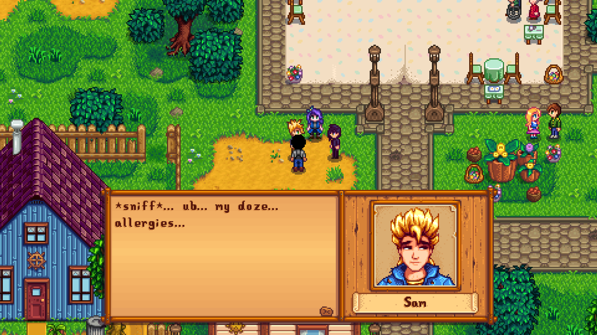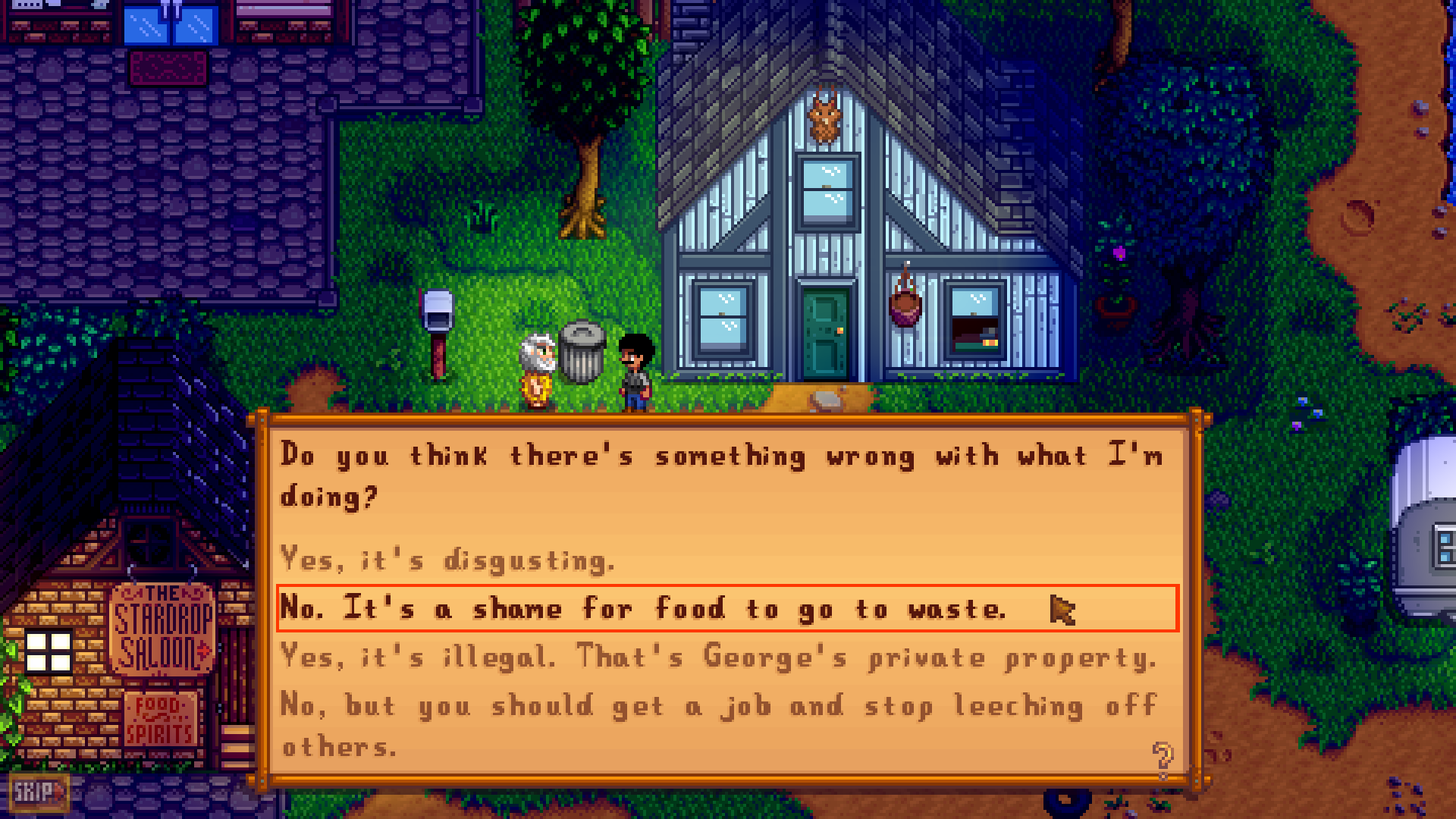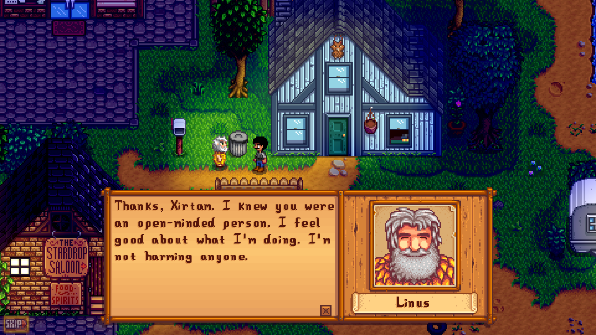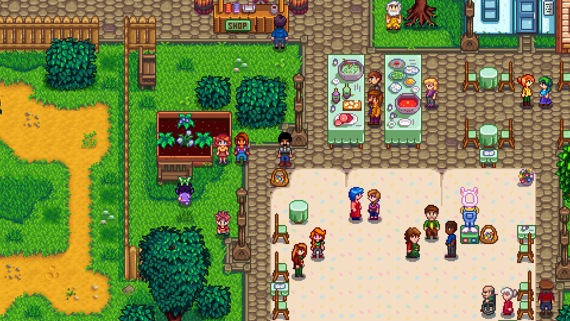 There’s a dating simulator in Stardew Valley, because of course there is. You can talk with everyone in the town, and depending on what dialog transpires, you can become romantically involved. You can hand out gifts to others, with results ranging from outright disgust to appreciation, and completing quests as posted on the town’s message board will also improve the quest giver’s attitude towards you. Eventually, you can fall in love with another character, marry them and raise a family. Gay/lesbian relationships, complete with adoption of children, is also allowed, and seen as no big deal in this game’s world. You could probably play this game as strictly a dating simulator and get away with it, since the mantra of “do whatever you enjoy” appears to apply to the entire game.