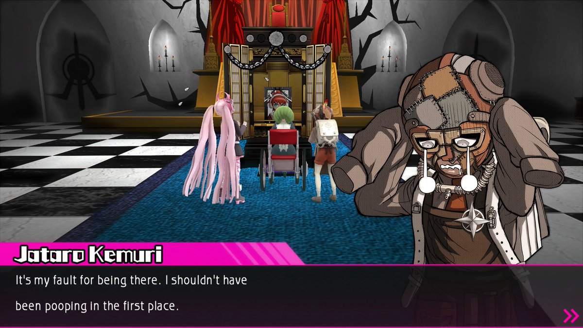 Past Danganronpa games have featured a colorful cast of wildly different characters, and that’s why Ultra Despair Girls‘ original characters tend to be underwhelming. All of the demented children that have taken over the town share essentially the same backstory. They were abused as children, and now resent adults (which they refer to as demons) due to this. There are different variations upon this central theme, but the new cast of baddies tend to blend together. It’s not unlike Metal Gear Solid 4‘s Beauty and the Beast Unit in that players essentially know everyone’s sad story before it’s even told.