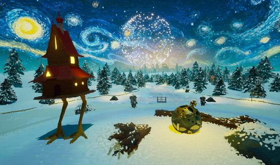 - Baba Yaga’s chicken-legged house wandering through the town shown in “Starry Night.”
