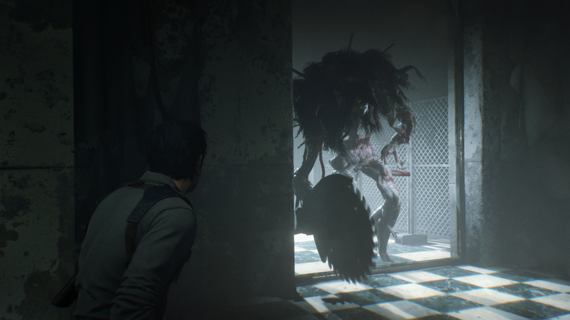 Sub-60 fps or not, The Evil Within 2 is a visual treat. A gory, bizarre, wonderfully dark treat. While the standard monsters Sebastian faces aren’t particularly frightening, it’s the environments in which he finds them that is impressive. Creepy rooms are a regular occurrence, with oddities dangling from the ceiling, or macabre portraits lining the walls of an old, creaky house.