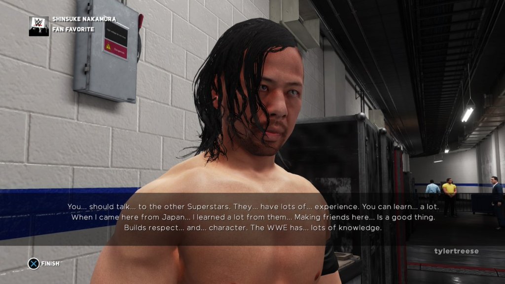 One of this year’s biggest additions is a revamped MyCareer mode, which allows players to rise through the ranks of WWE as a hot prospect. It also adds in backstage segments, which meant I got to explore the locker room, and occasionally converse with other wrestlers when I ran into them. Anyone who follows wrestling knows that it’s filled with larger-than-life characters, and it should be an awesome thing to run into someone like The Rock or Sasha Banks backstage. Instead, players are treated to a lot of generic dialogue exchanges that rarely reflect the actual character. They’ve managed to make a game with dozens of amazing characters into a bore.