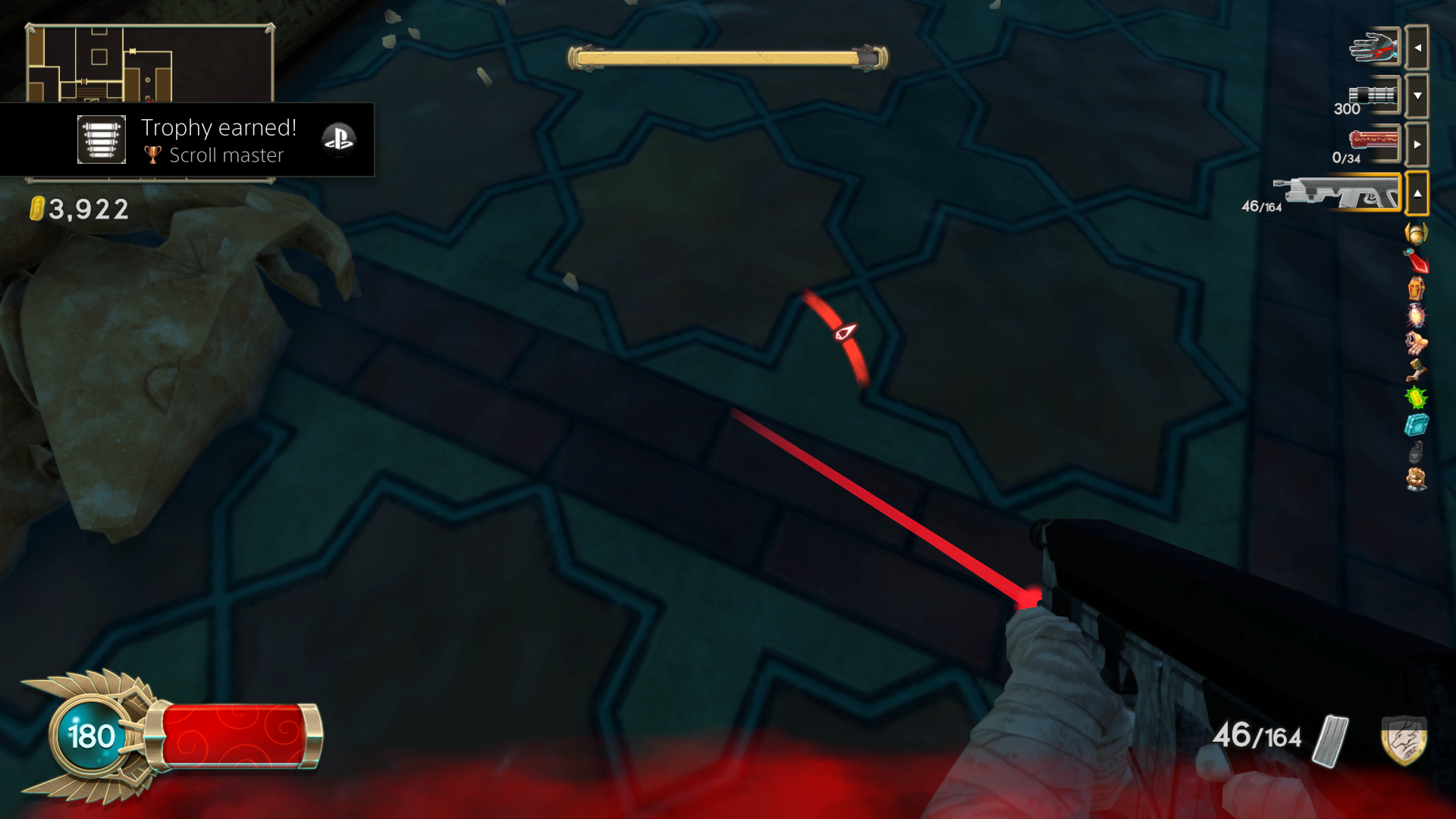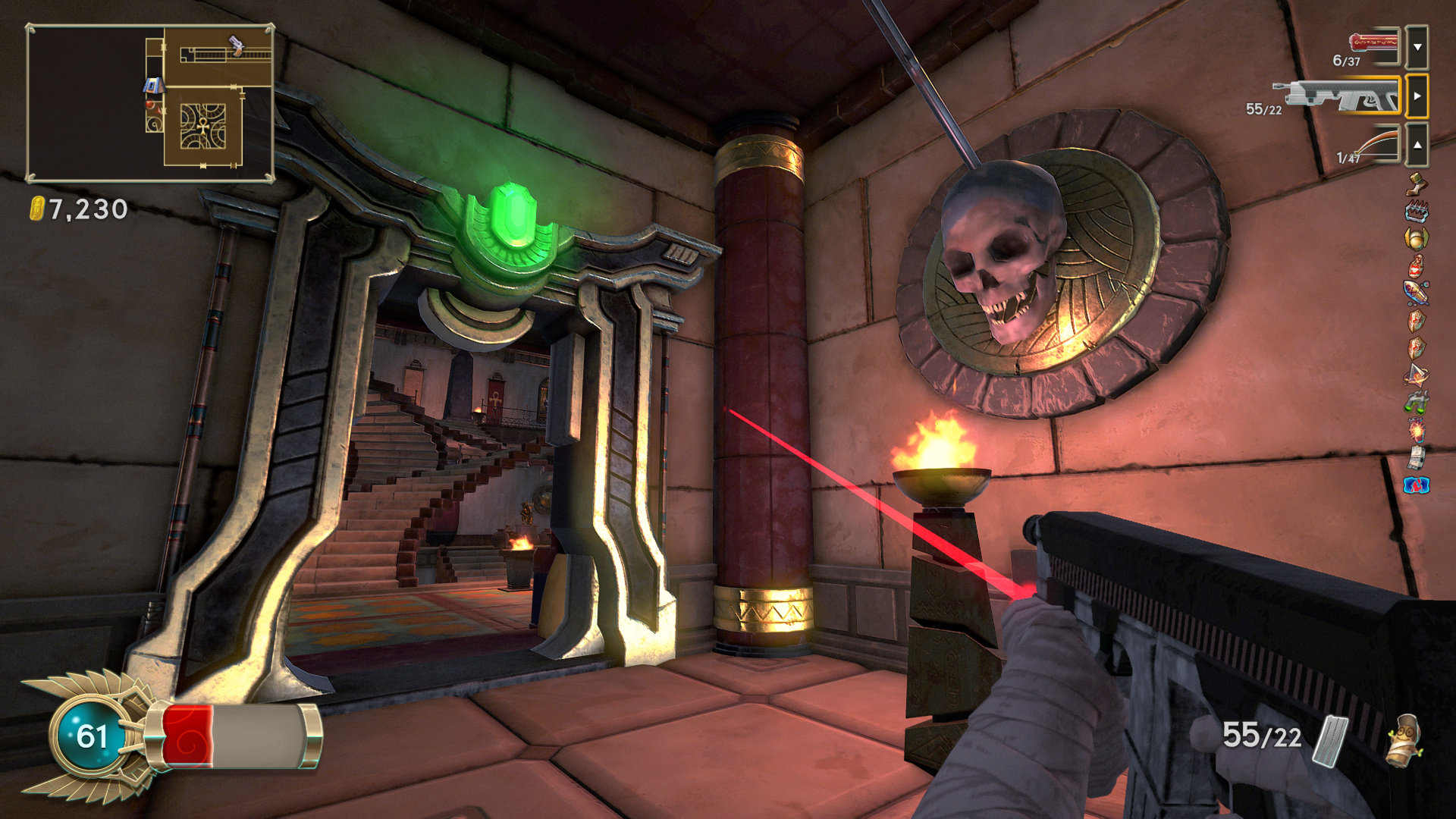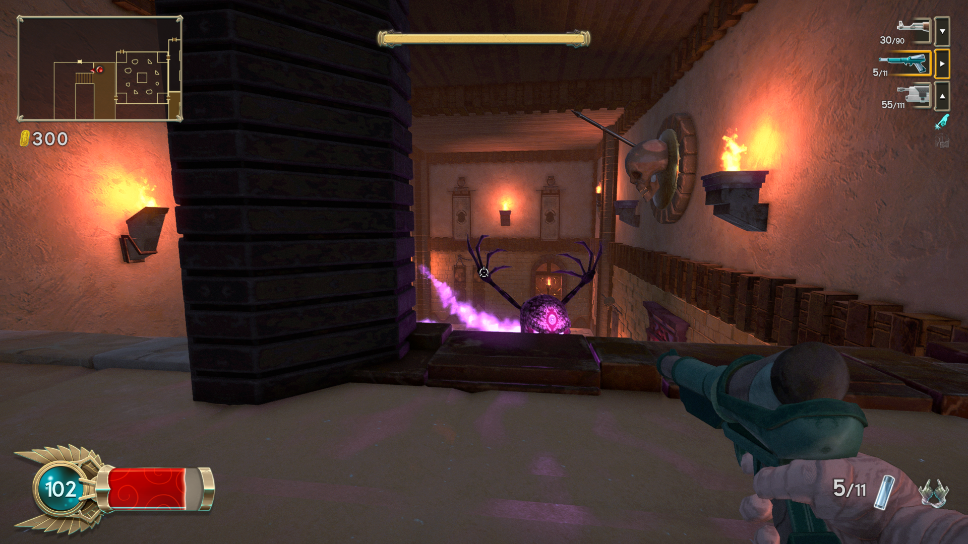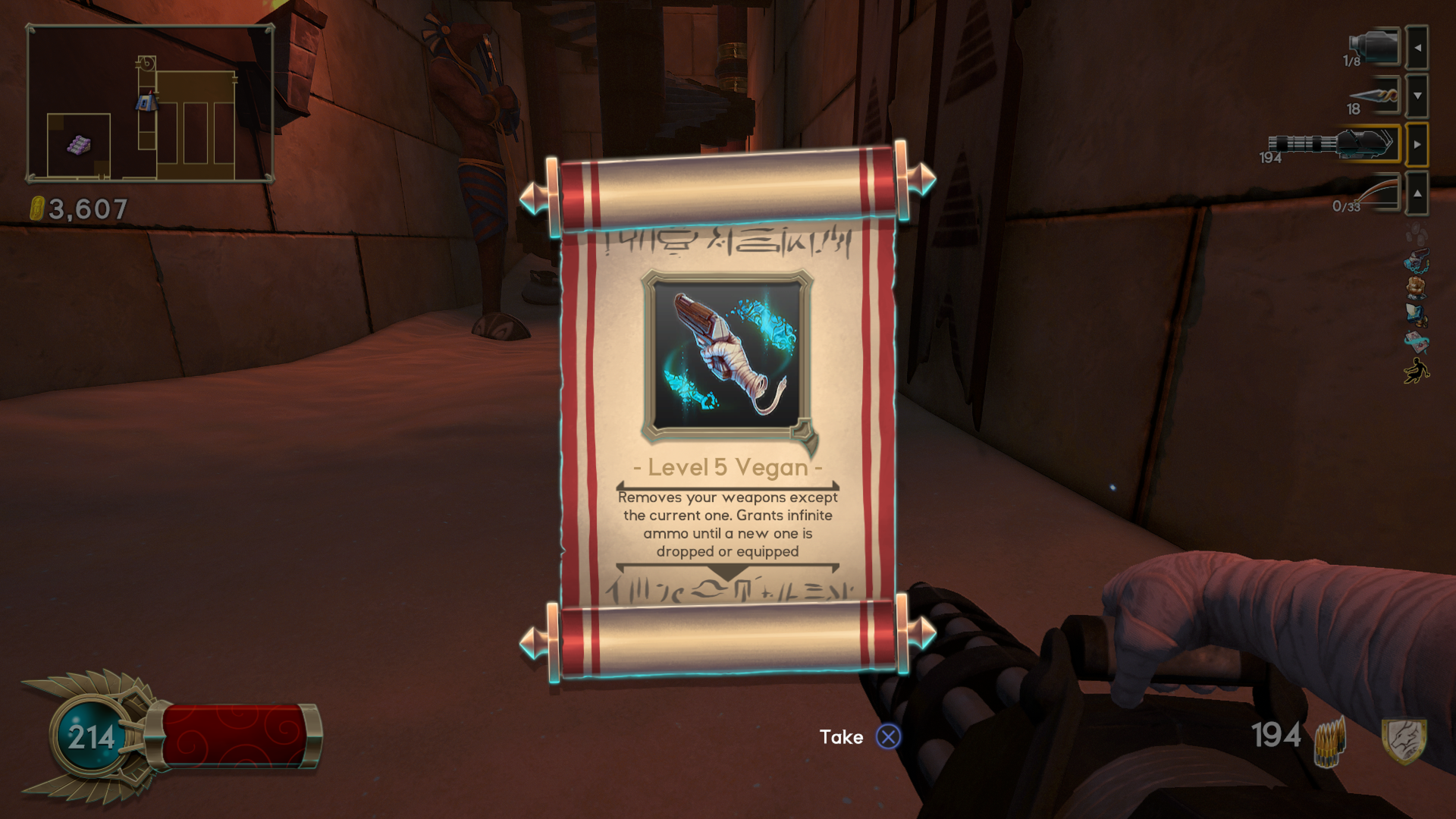 Randomness (or, rather, pseudo-randomness) is often used for rogue-likes in order to guarantee that each playthrough is a unique adventure. Immortal Redneck randomizes the layout of each pyramid entered, as well as power-ups encountered. Each pyramid consists of a number of floors, the layout of which consists of a randomized assortment of individual rooms. The rooms lock the player in upon entry, unlocking only after all enemies are cleared, or if the challenge is either passed or failed in the case of special challenge rooms. Once a particular room has been encountered, any future encounters will contain exactly the same types and number of enemies, which can help to inform the player of strategies to use. However, enemies can randomly drop new weapons or scrolls. The player can only hold up to three weapons (though one class can carry four), so occasionally one weapon must be left behind. Immortal Redneck boasts over 50 weapons, from the traditional shotgun to mystical weaponry, the latter of which have unlimited ammunition but don’t do much damage, and are also slow to fire. It will take at least a few dozen playthroughs to see all the weapons on offer.