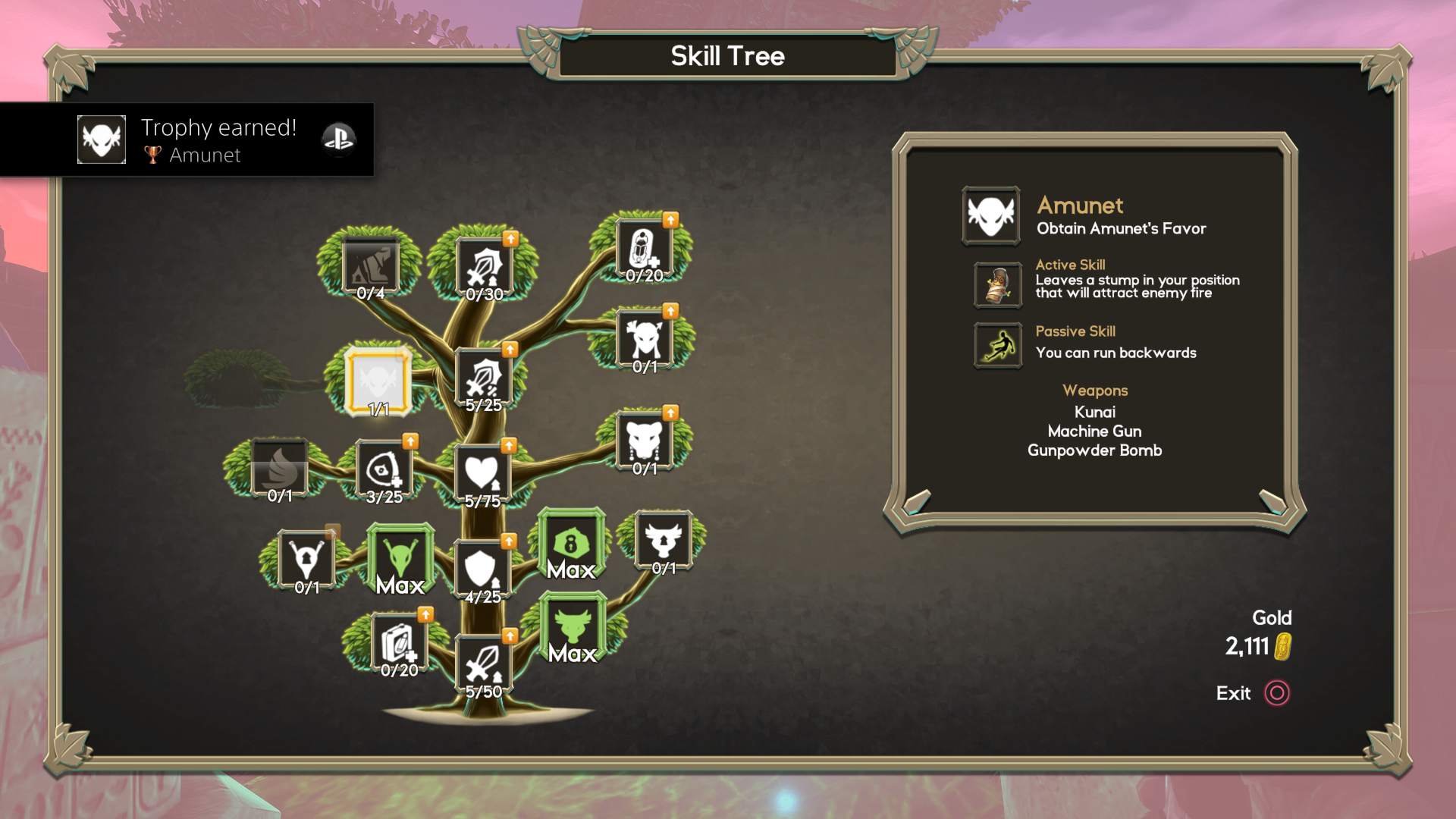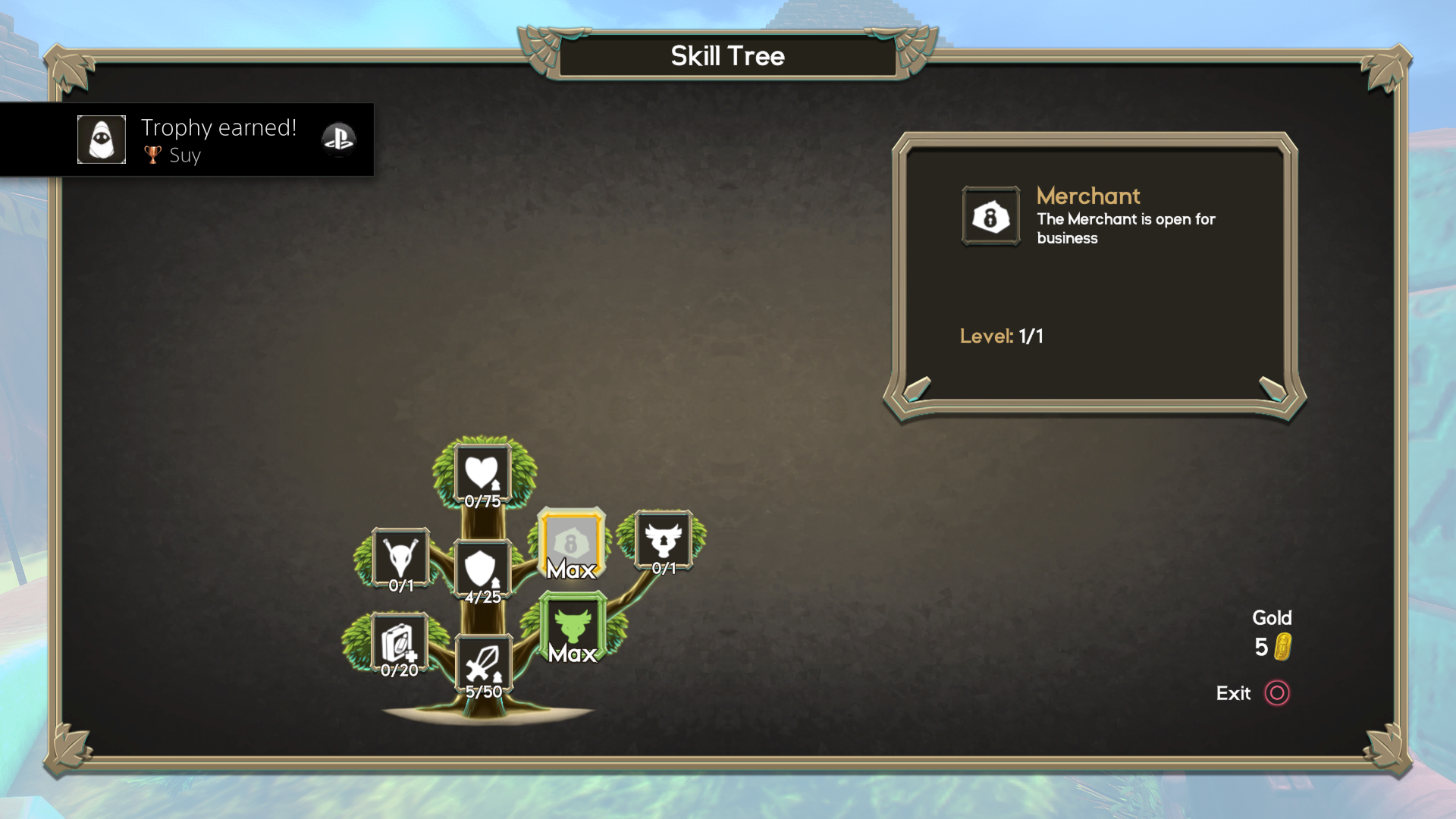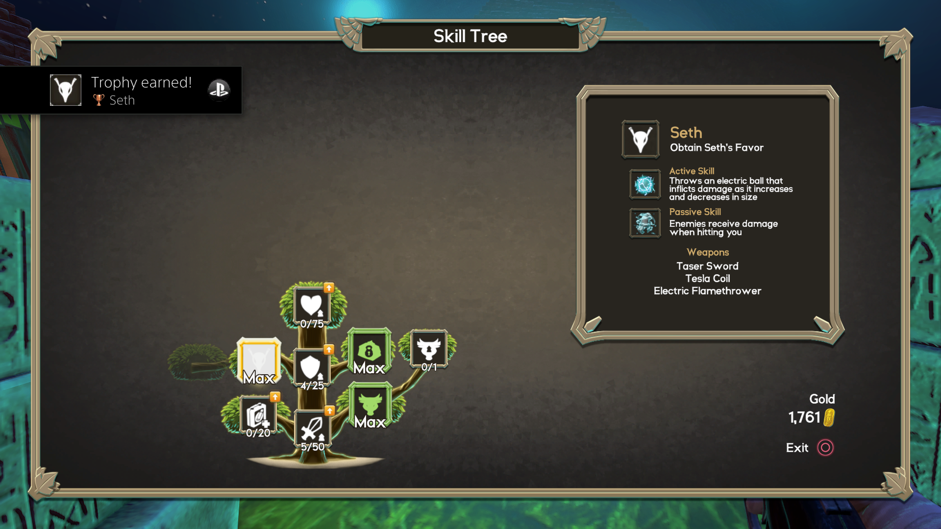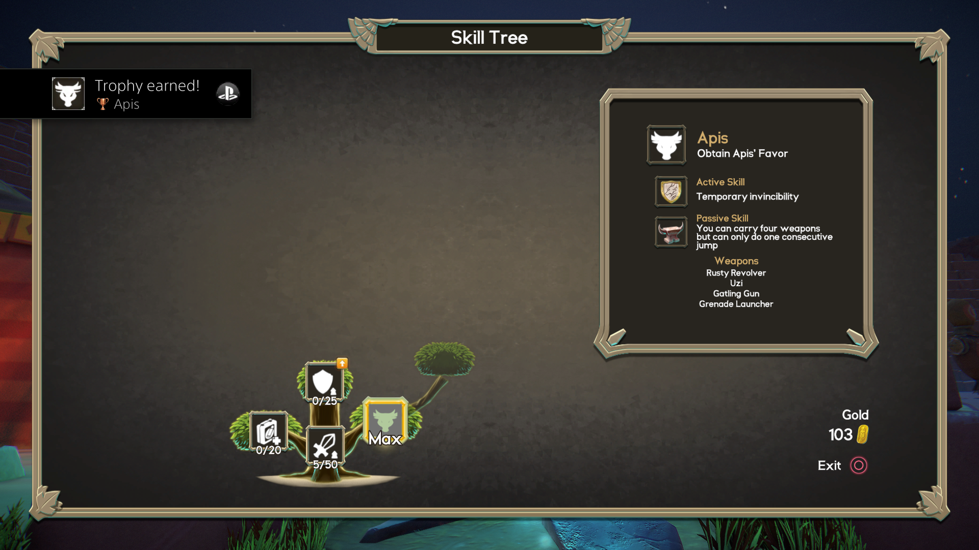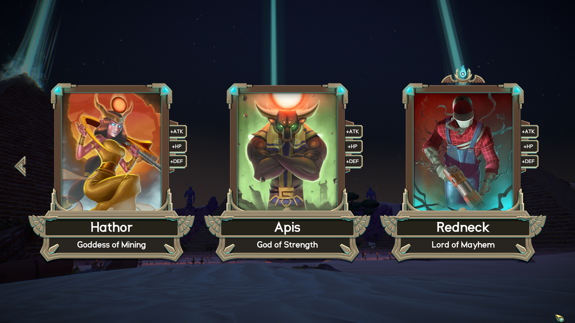 In between playthroughs, any gold earned from the previous life can be spent on either the aforementioned skills, or a merchant once he is unlocked. Defeating bosses can grant access to special tokens, which start the next pyramid as if that boss had just been defeated. A repeat of the last pyramid can also be requested, for a hefty fee and the disabling of collecting any gold on the next playthrough. Any unspent gold is relinquished in sacrifice to the gods, in order to start another attempt at clearing a pyramid.
