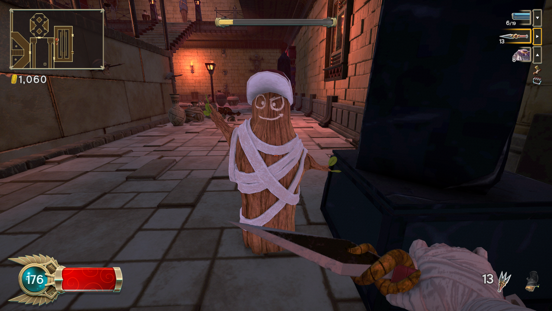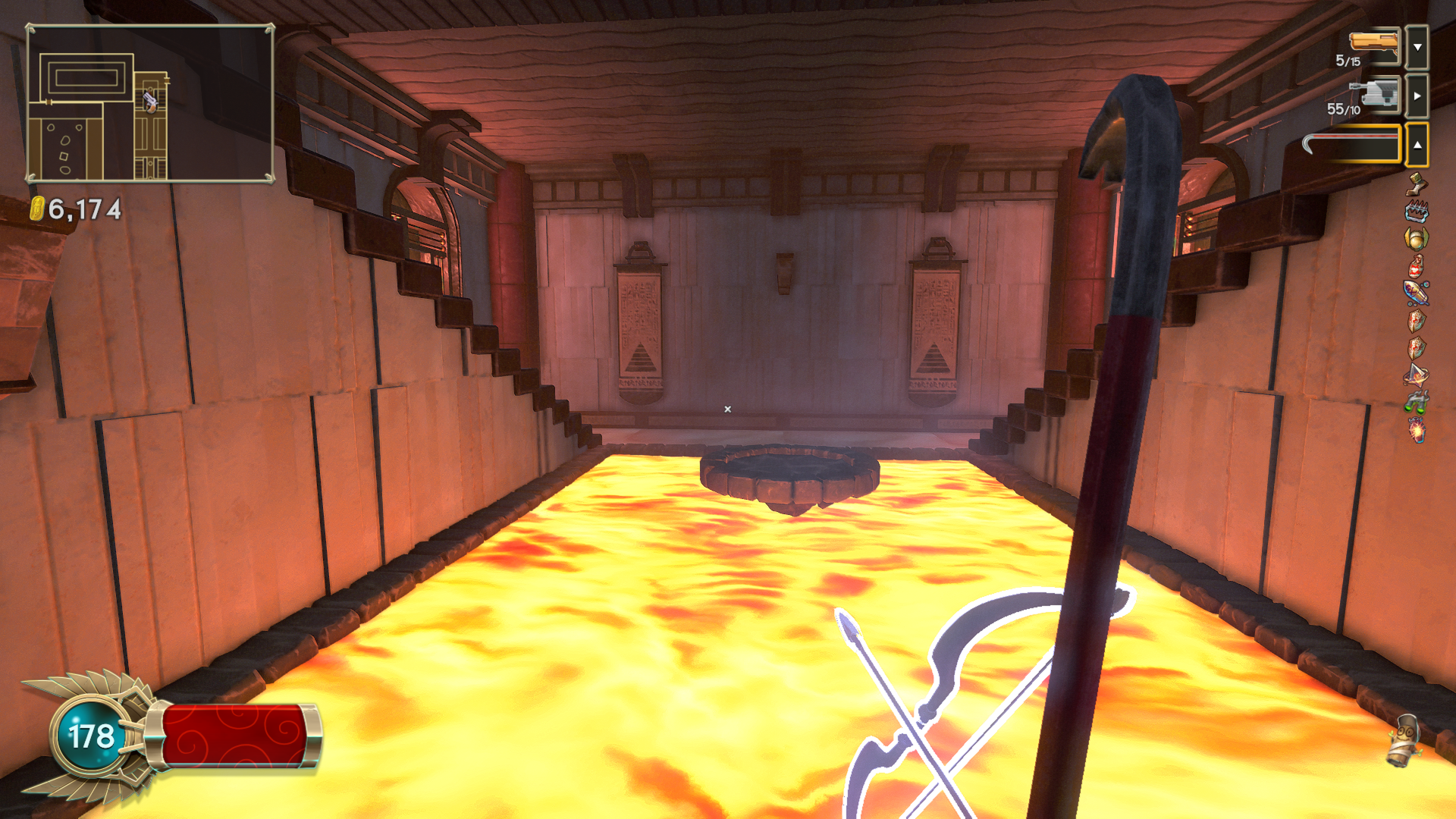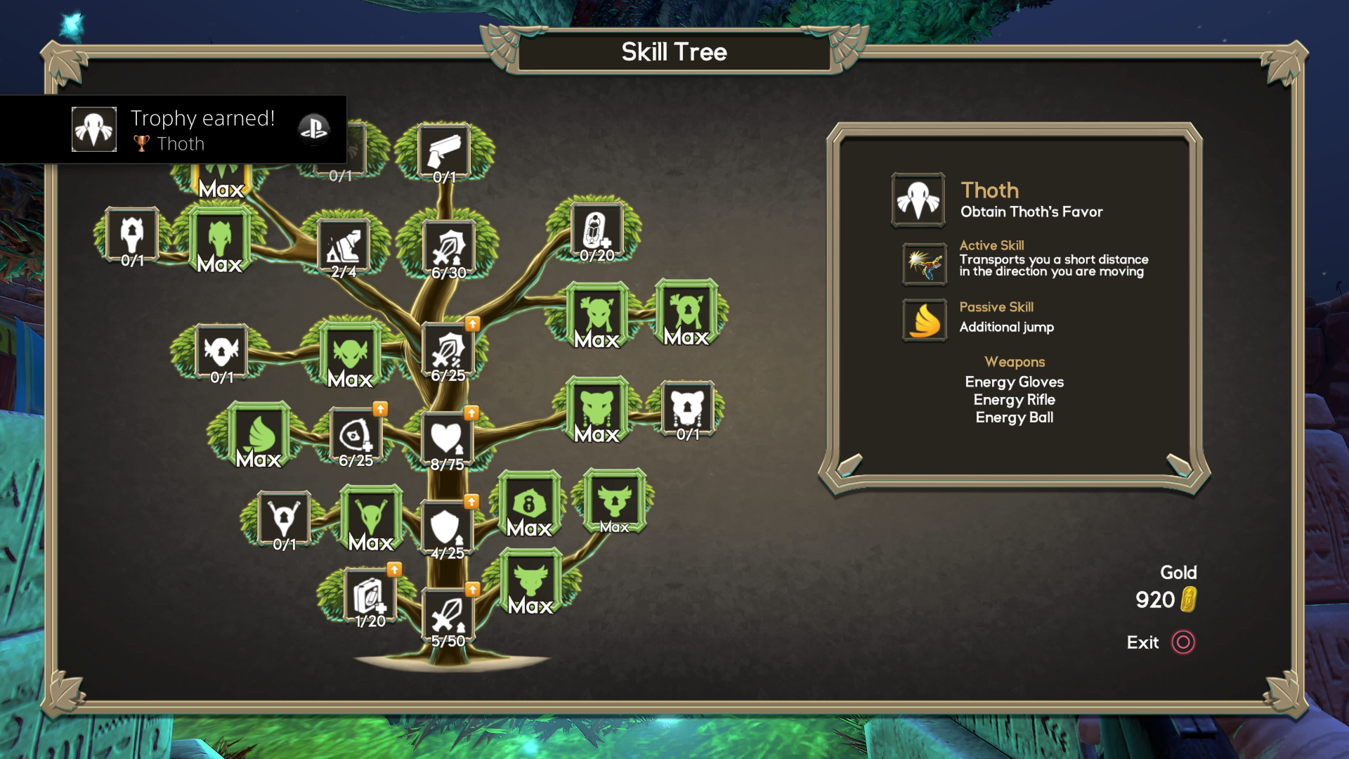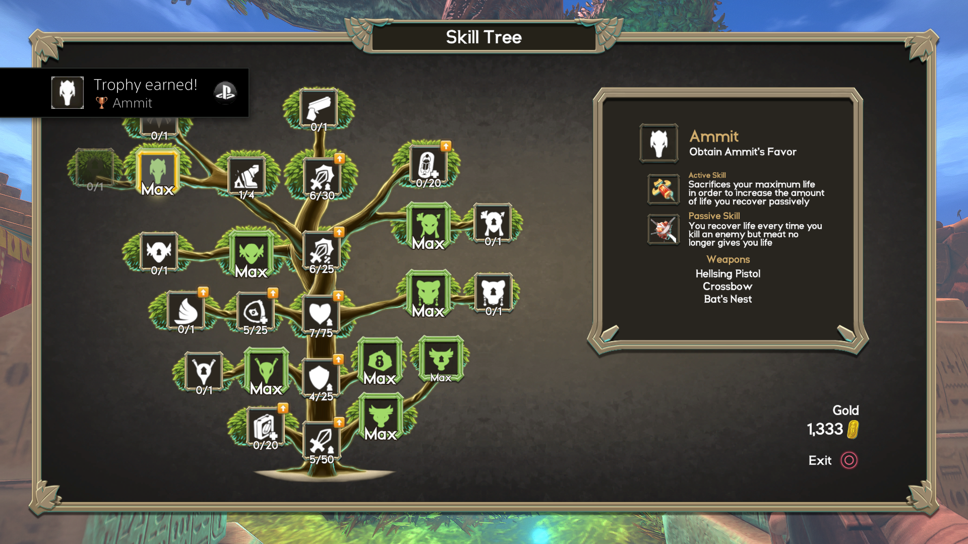 In between playthroughs, any gold earned from the previous life can be spent on either the aforementioned skills, or a merchant once he is unlocked. Defeating bosses can grant access to special tokens, which start the next pyramid as if that boss had just been defeated. A repeat of the last pyramid can also be requested, for a hefty fee and the disabling of collecting any gold on the next playthrough. Any unspent gold is relinquished in sacrifice to the gods, in order to start another attempt at clearing a pyramid.