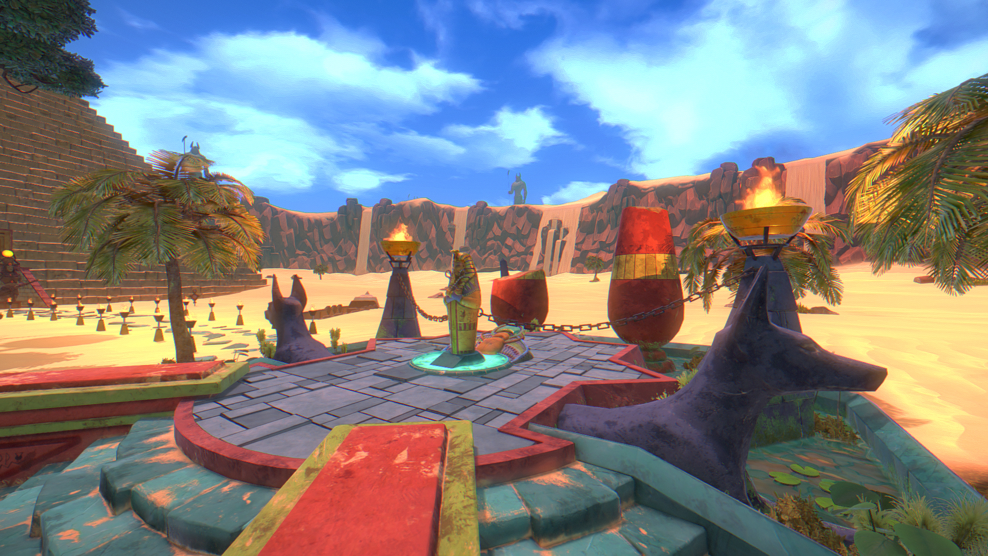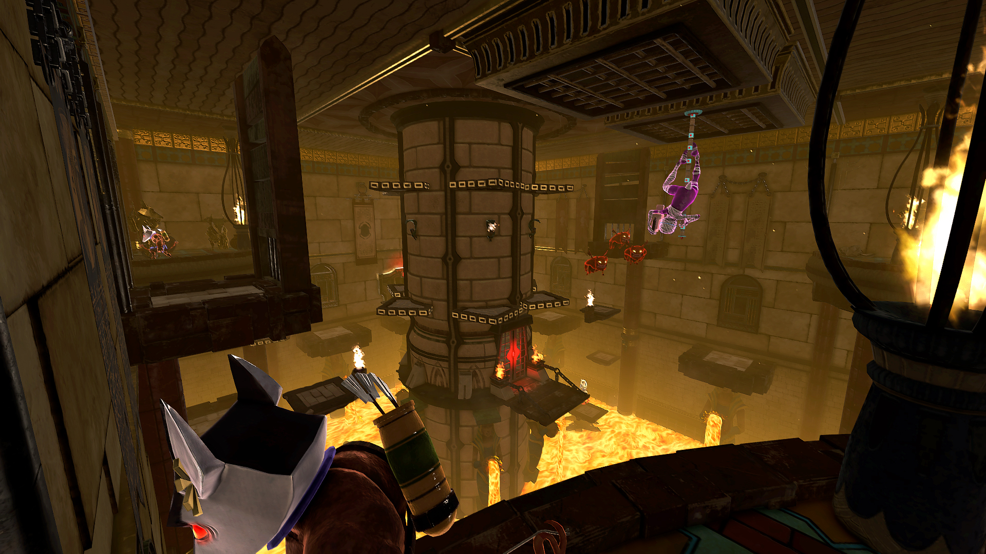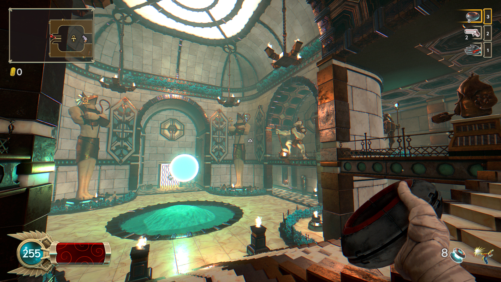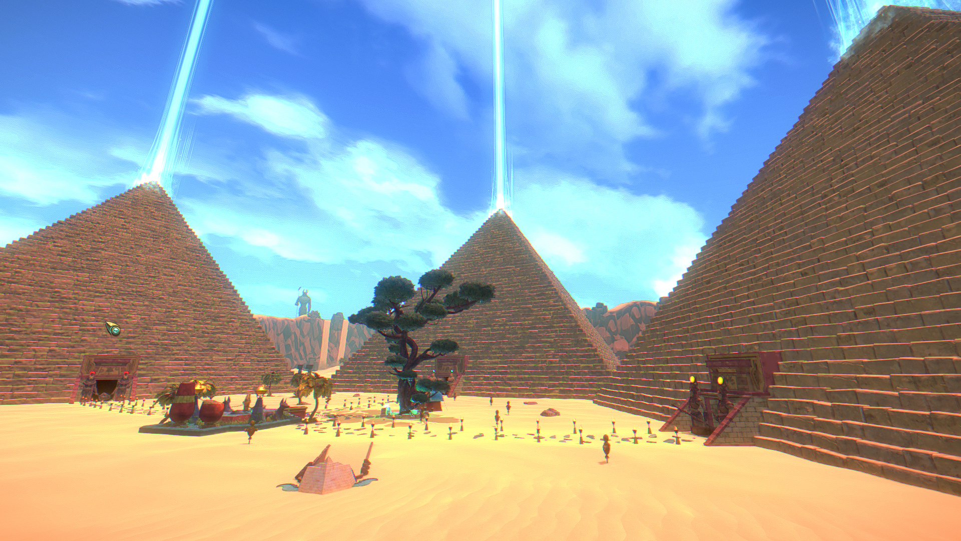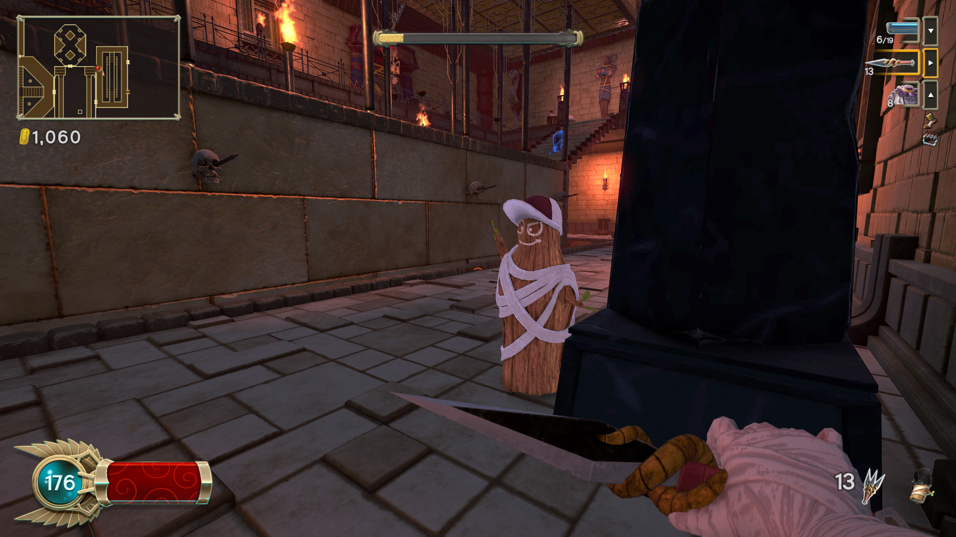 In between playthroughs, any gold earned from the previous life can be spent on either the aforementioned skills, or a merchant once he is unlocked. Defeating bosses can grant access to special tokens, which start the next pyramid as if that boss had just been defeated. A repeat of the last pyramid can also be requested, for a hefty fee and the disabling of collecting any gold on the next playthrough. Any unspent gold is relinquished in sacrifice to the gods, in order to start another attempt at clearing a pyramid.