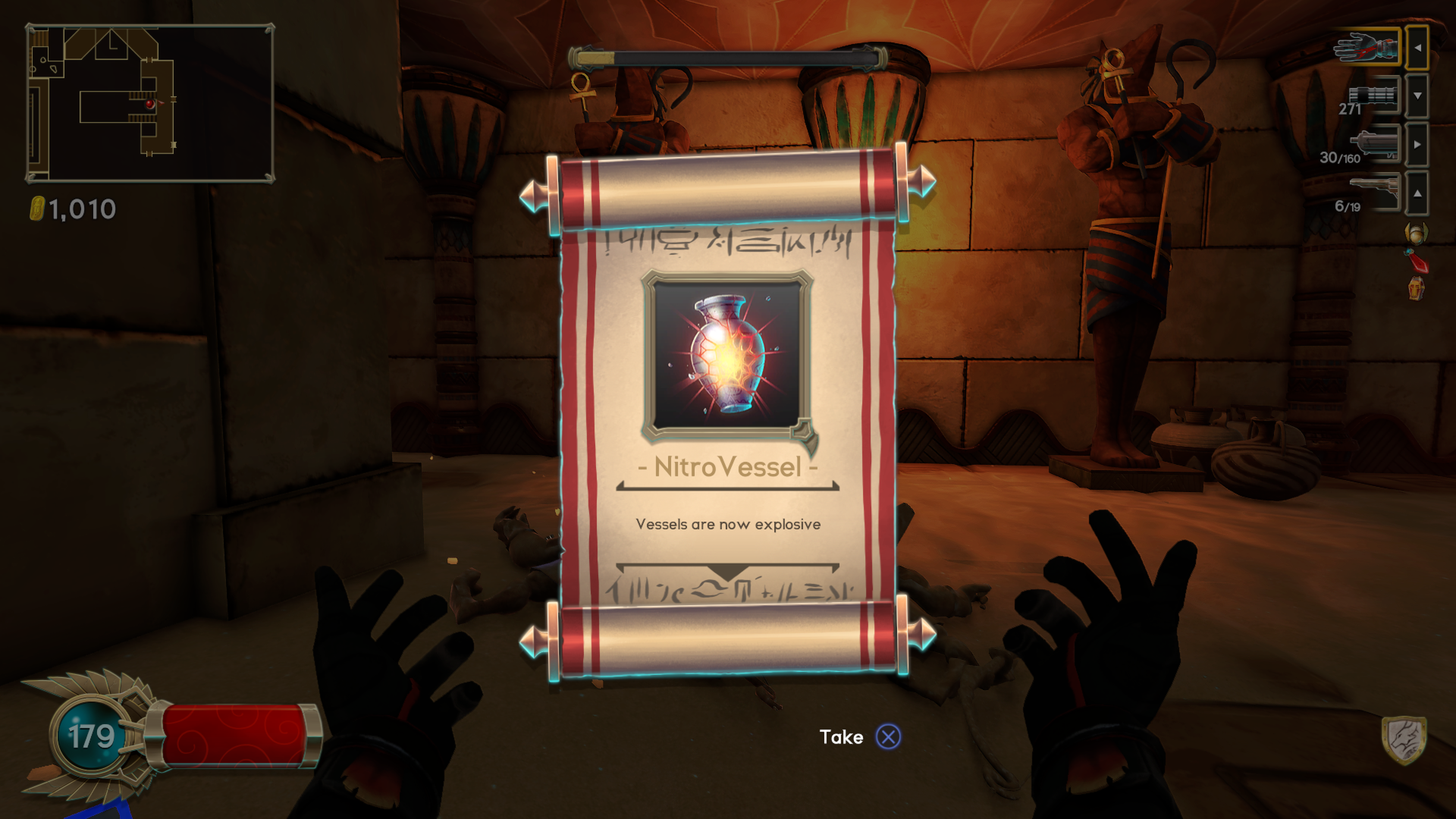 The enjoyment that someone might get out of Immortal Redneck relies upon their tolerance for repetition. While each pyramid has a randomly-generated layout, the individual rooms are pre-made and even include the same kinds and number of enemies each time they are played. For some, this repetition will feel boring after seeing the same room a handful of times. Others understand that part of rogue-like games involve grinding it out and playing similar, but slightly different dungeons (which is effectively what these pyramids are, after all). Again, the random scrolls do spice things up, and trying to run through a pyramid with modifiers such as explosive jars, low gravity, and unlimited ammunition will be a varied enough experience to keep many seeing it through until the end.