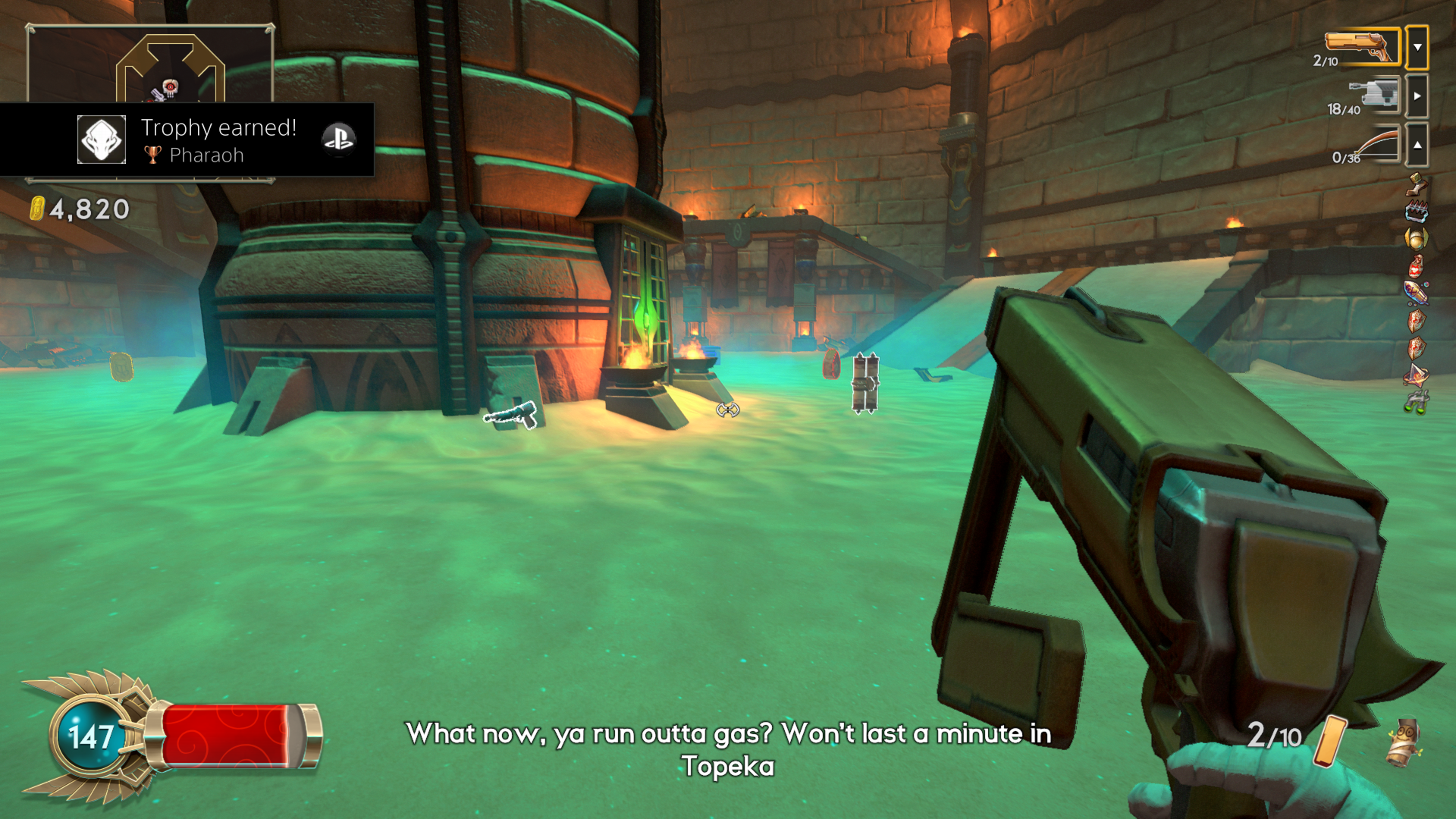 This skill tree is an actual tree, which grows as new abilities are unlocked. This aspect fits right in with the rest of Immortal Redneck’s sense of humor, and actually packs a few dozen skills, most of which can be upgraded by spending some coins. Upgrading health and defensive stats in the beginning hours of the campaign are a must, because health pickups are a rare commodity inside the pyramids.