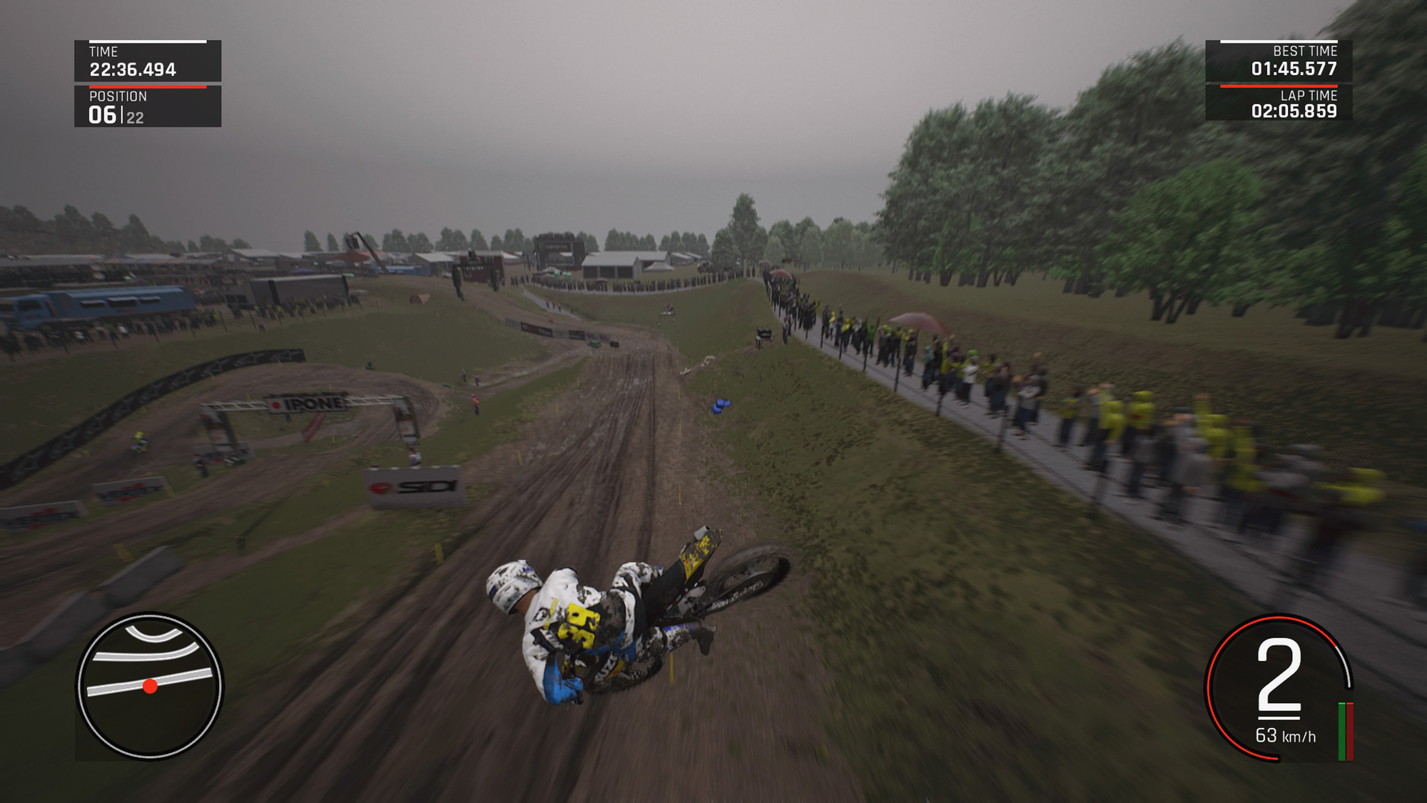 Wrong. MXGP Pro is a pure motocross sim only when it wants to be, meaning that a lot of the time, it doesn’t make much sense. Crashes and spills are largely unpredictable, to the point of almost feeling as if they’ve been thrown in for comic effect. Hammer the accelerator down while you’re leaning heavily around a sharp, muddy bend and you’ll get away with it. Good for you! Do the same thing on a more relaxed turn on the same muddy ground when you’re practically upright, and you’ll end up slipping over. You suck. Keep a weather eye open, though. On the next lap, the two instances will probably be reversed. Learning the tracks and trying to put together intelligent lines around the course can alleviate the randomness a little, but you’ll still end up looking on far too many times as your bike inexplicably throws you. Sometimes you’ll just topple over as you brake for a bend as if your rider’s head has suddenly turned to granite. Jumping into the settings menu to change things to pro-level physics doesn’t seem to make that much of a difference. In fact, I won more races on the apparently-more-punishing pro physics than I did with the reduced realism version, so make of that what you will.