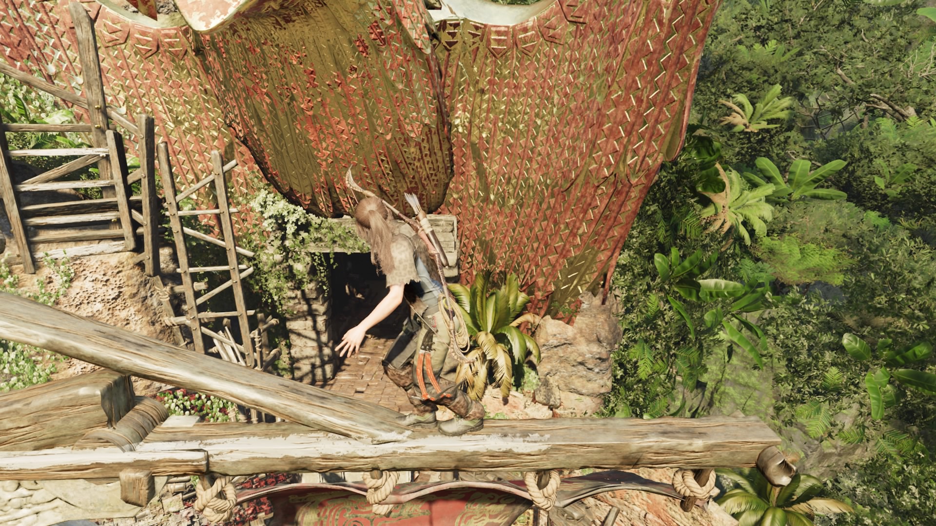 The game heavily emphasizes stealth to get through areas of combat. Lara will not last long in a firefight, and her scampering and dodging skills are subpar at best. On the one hand, it’s pretty darn annoying. On another, it’s rather realistic. There is no way one could believe that Lara, dressed in cargo pants and a tank top, can survive a shootout against ten soldiers stacked in kevlar. So, Lara has to turn to the bushes for cover or slather mud on her face and arms so she can blend into the jungle walls. She also has the trees for sniping and other death-from-above kills. A new trick up her sleeve includes stringing people up with her rope arrows. It’s like being Batman from Arkham Asylum, but with the actual intent to kill.