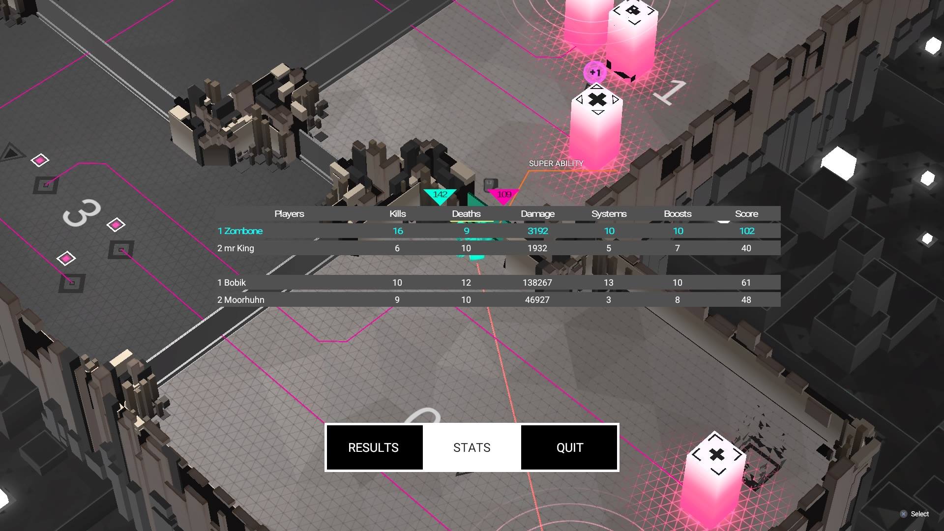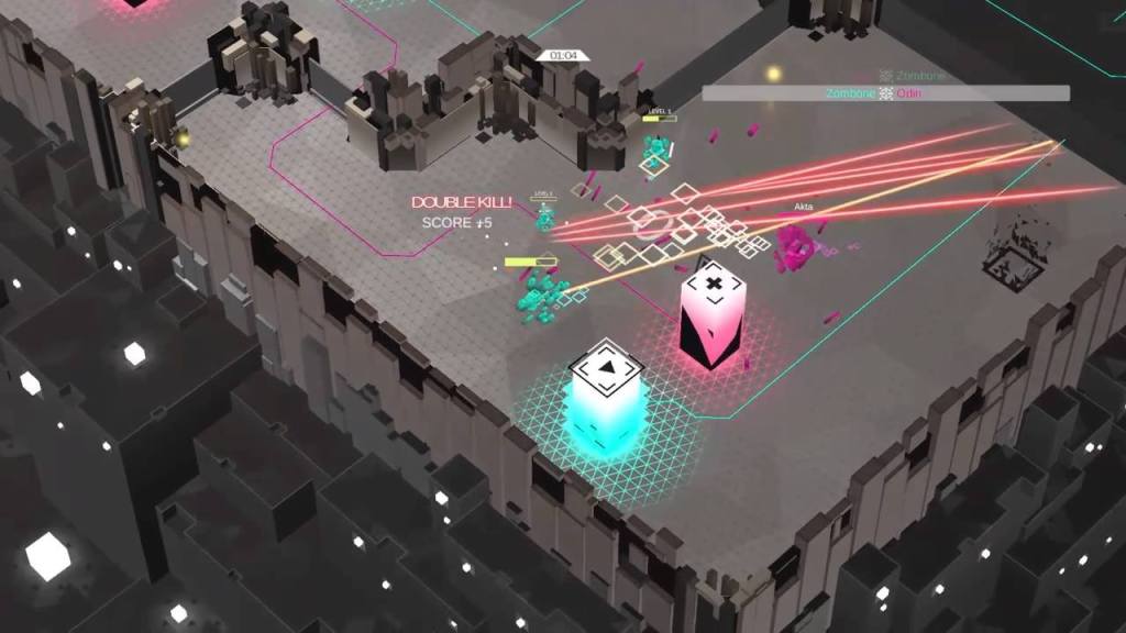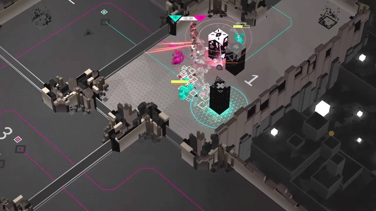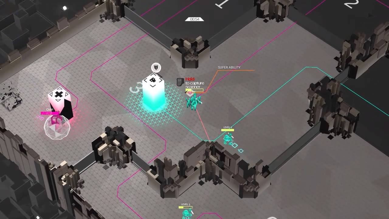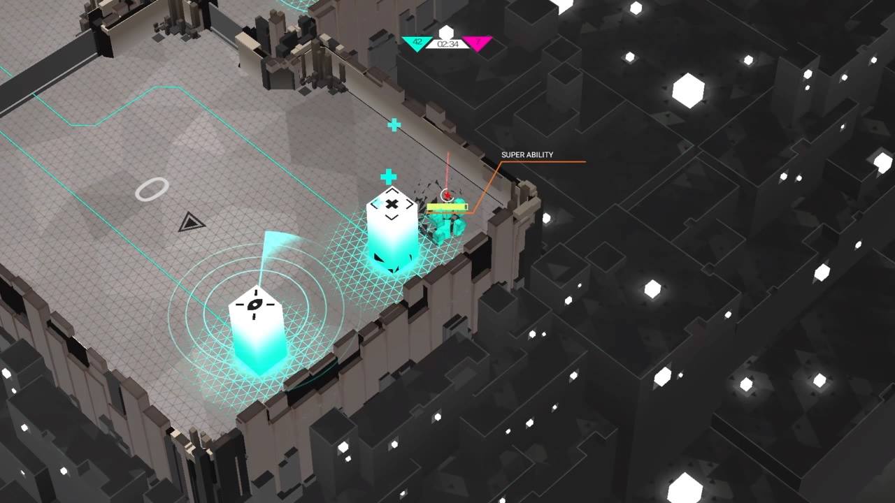The final wrinkle on the battlefield are the program towers and power-ups. Gaining control over the towers offers various benefits, such as a turret that fires on hostile players that enter its room, or a bot spawner that continuously spits out small allied units that seek out other players. These can be captured by interacting with a small empty square on the floor with a line attaching it to one of the towers. These are always in a different room than the tower itself, so that no one can simply hide under a turret or a healing tower and keep control of it at the same time. The power-ups offer bonuses such as double damage or extra health.