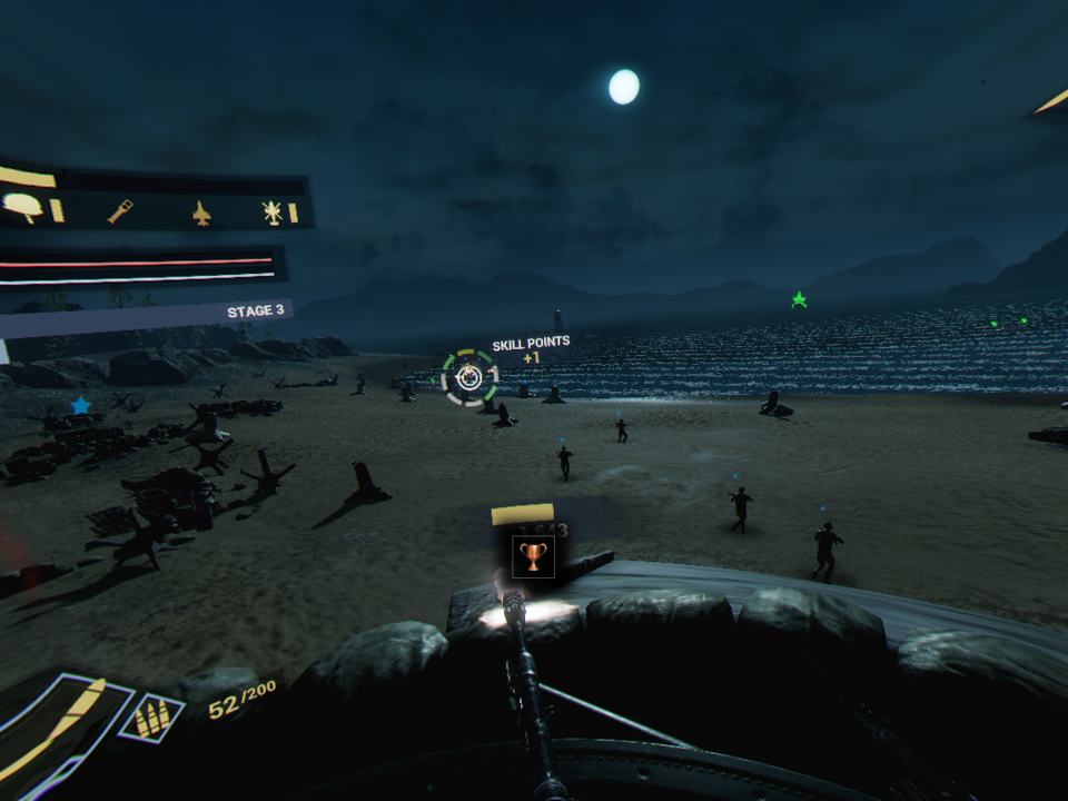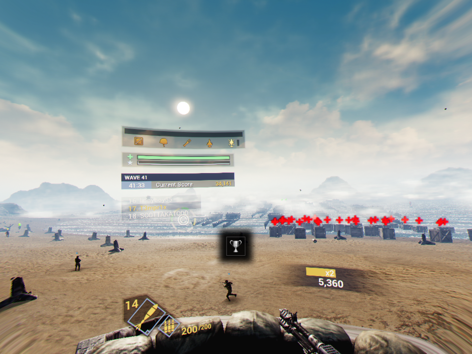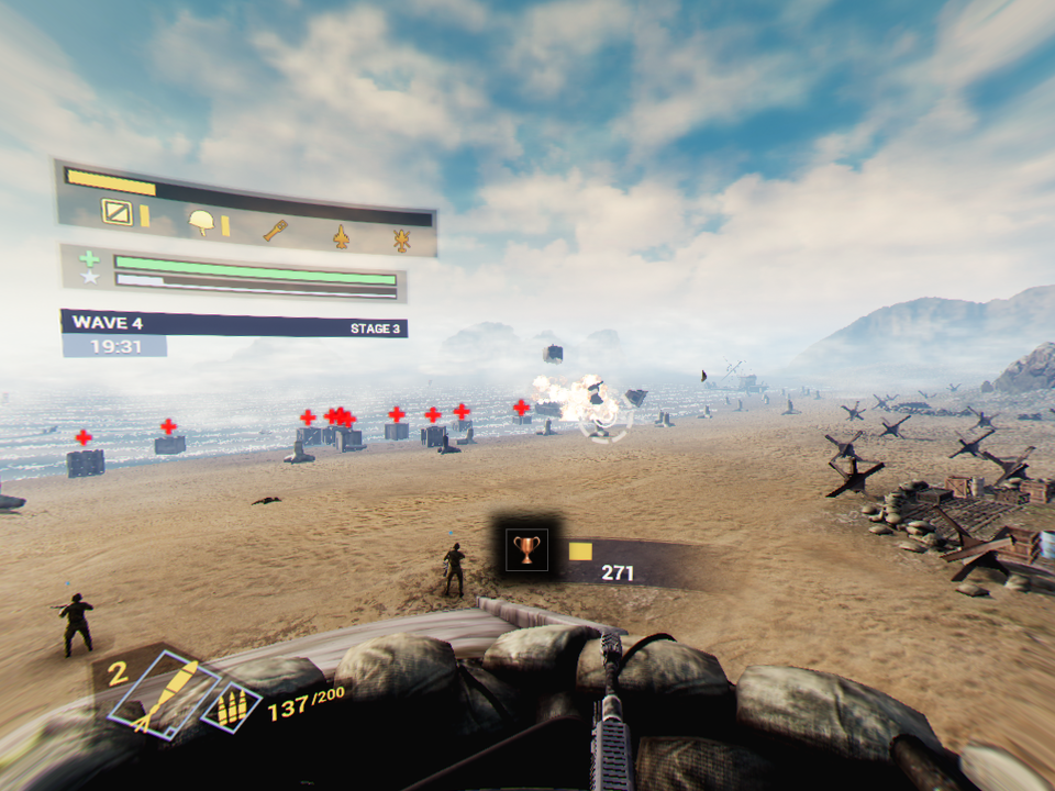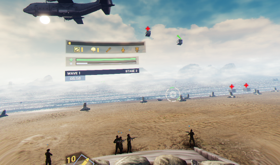 As the player kills enemies, experience points are earned. Enough experience points will unlock a skill point, which can be used to upgrade weaponry. After just a few upgrades, the player becomes so powerful that most waves are hardly a challenge. There is also a quicker-filling experience bar that unlocks support options, from ammo and health crate drops, to infantry units which take care of ground troops, as well as artillery strikes, jet fighter strikes, and attack helicopter strikes. The artillery and jet strikes will kill your own soldiers, as there is no mechanism to choose where these strikes will land, in another frustrating design decision which probably wasn’t tested very well, if at all. These support options are offered so often from just a handful of kills, that before long half of the area in front of the player can end up filled with supply crates and infantry.