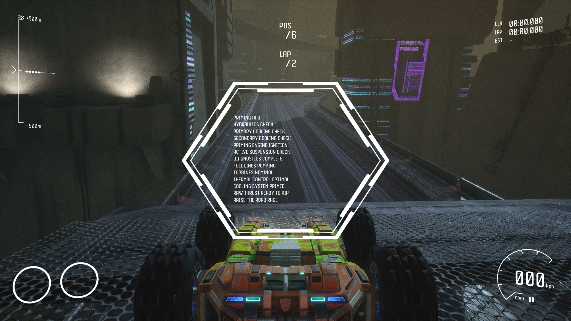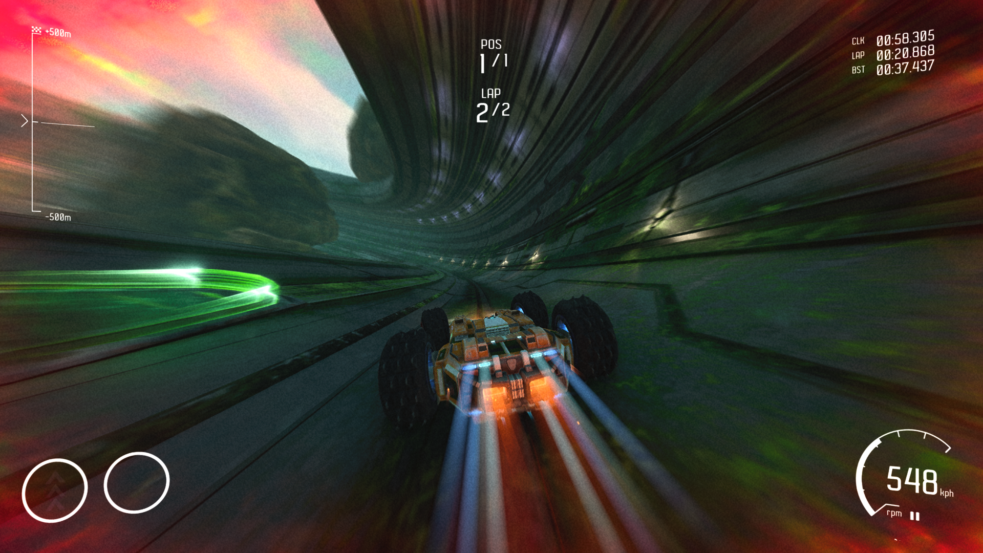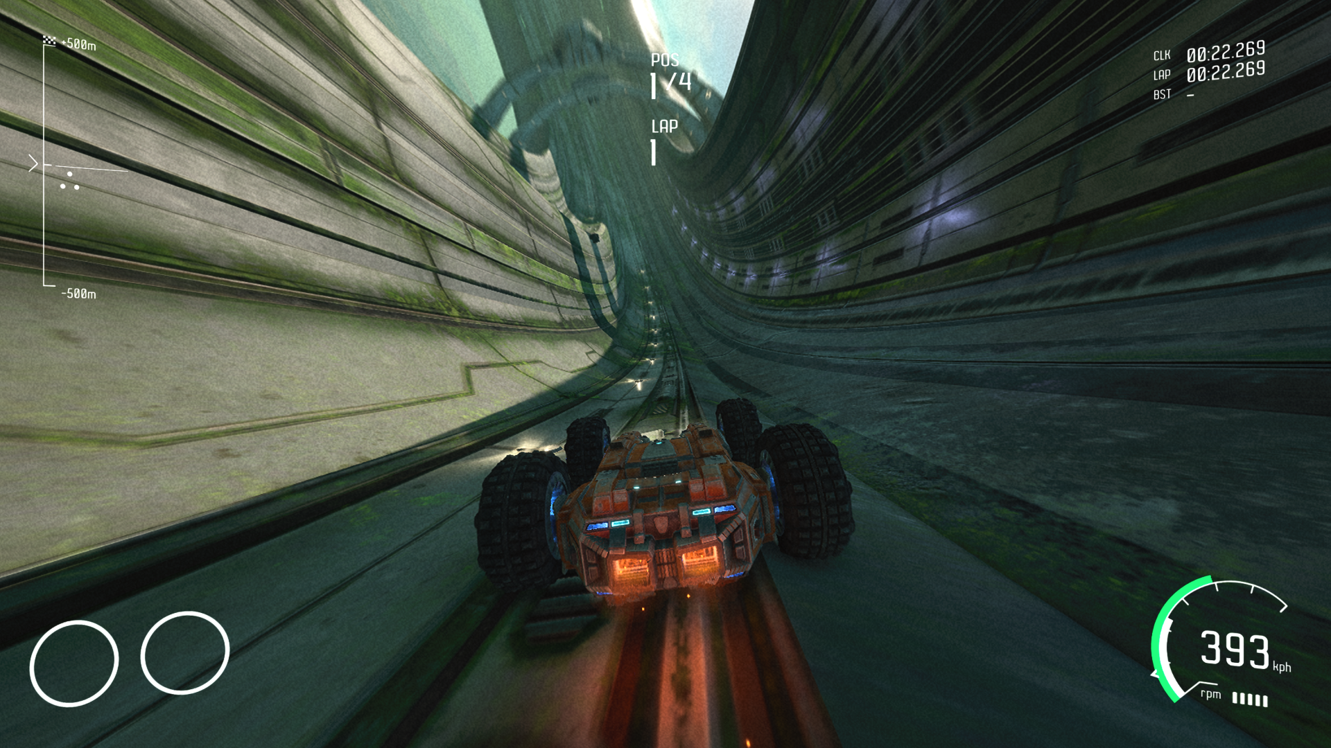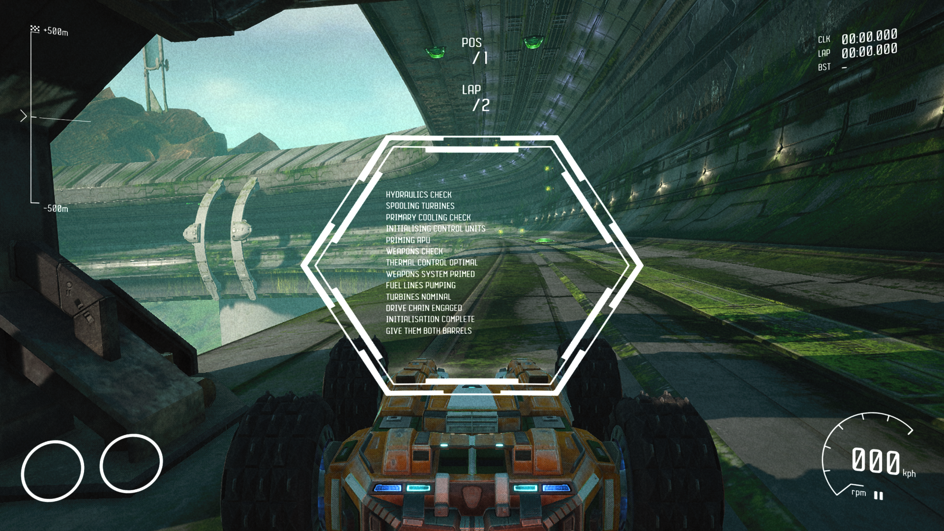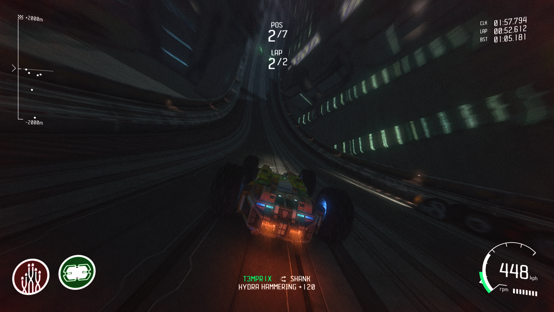 If all this flipping, twisting and turning sounds like it might be hard to keep up with, we can thankfully report that this isn’t the case. GRIP’s camera stays directly behind the player during these transitions between surfaces or while flipping orientation, and does not become a nuisance despite all the on-screen chaos that can ensue. A couple of first-person views are available, and upon transitioning to a new orientation, the camera simply flips the view once the car’s new downforce direction has been determined. It’s perhaps slightly jarring, but is a manageable effect to learn to anticipate.