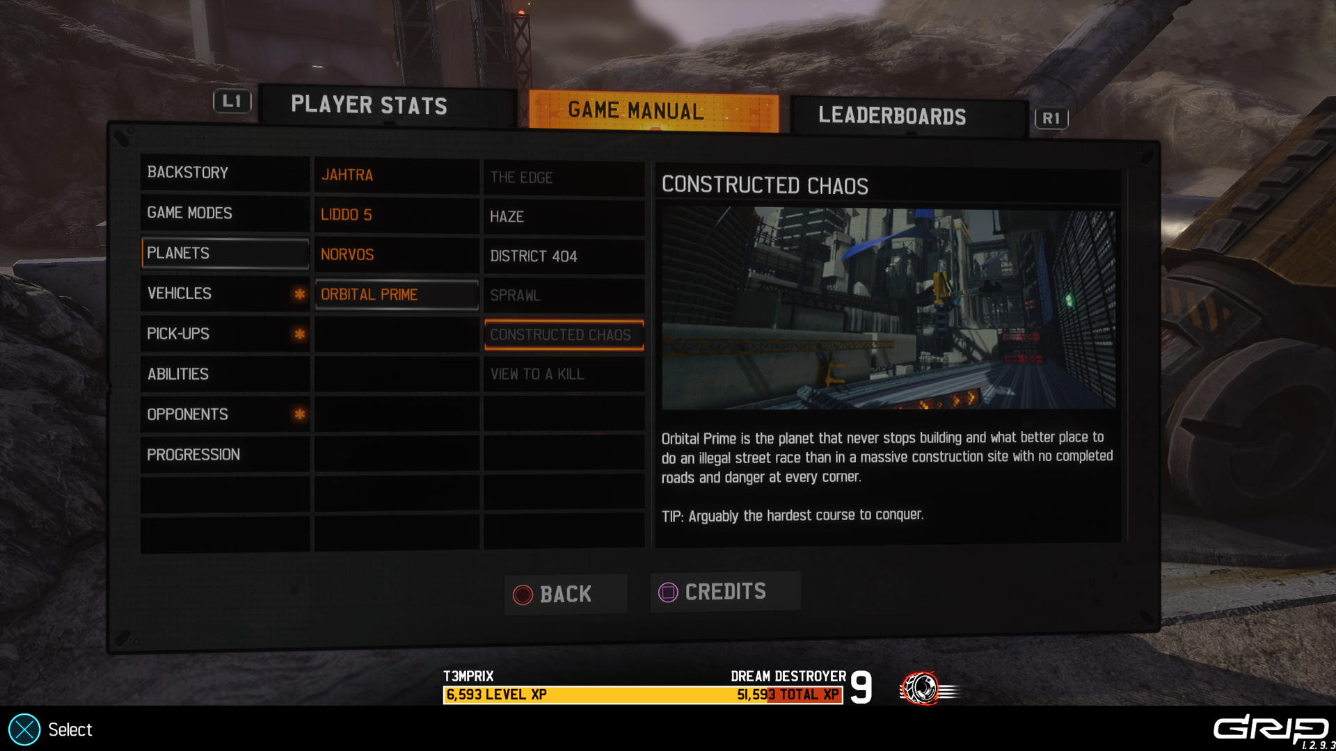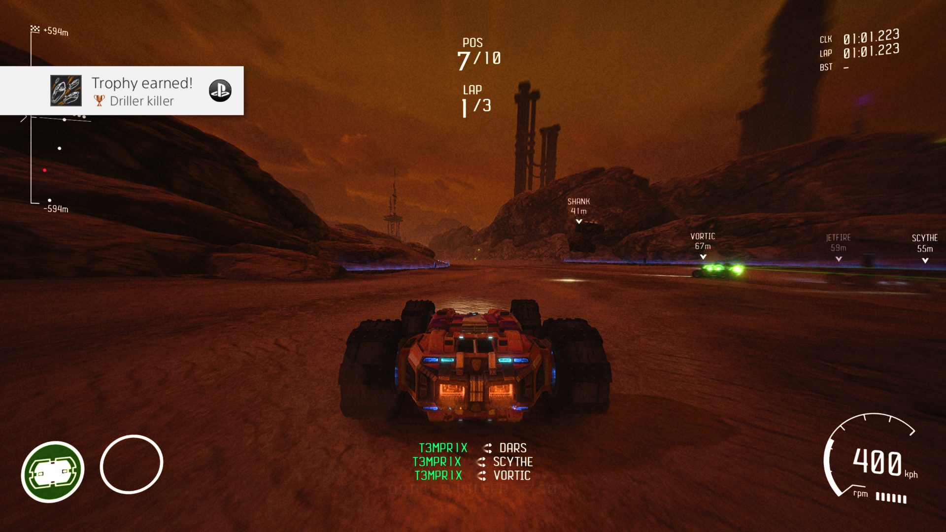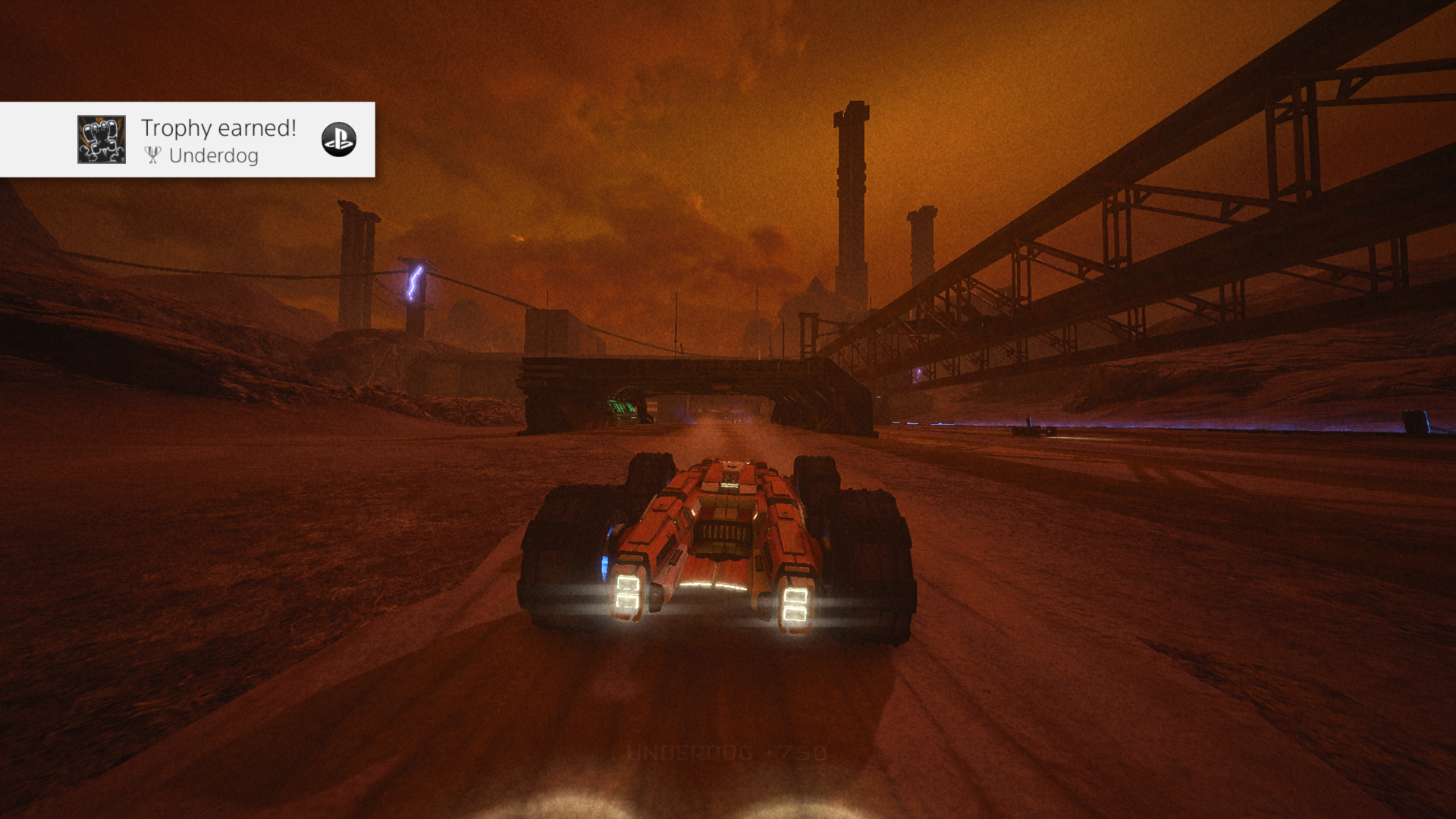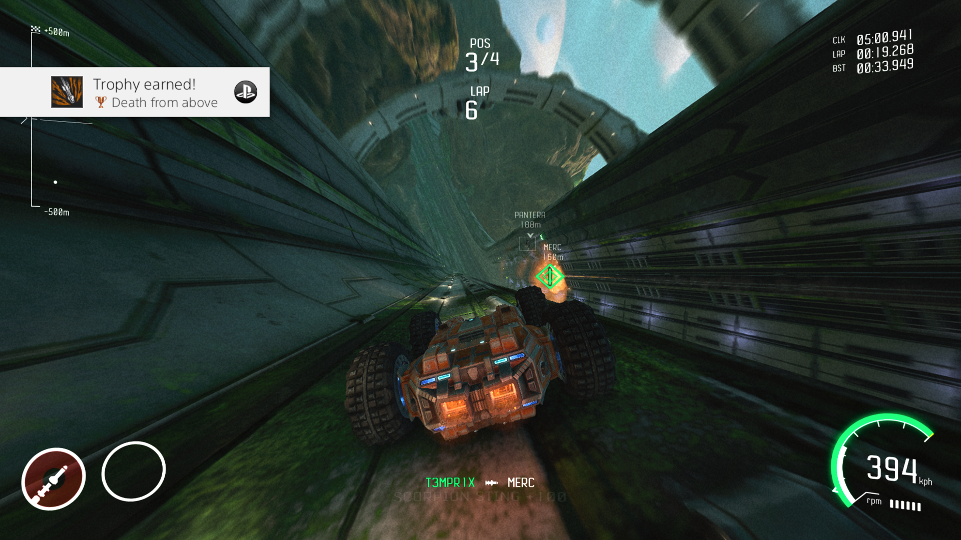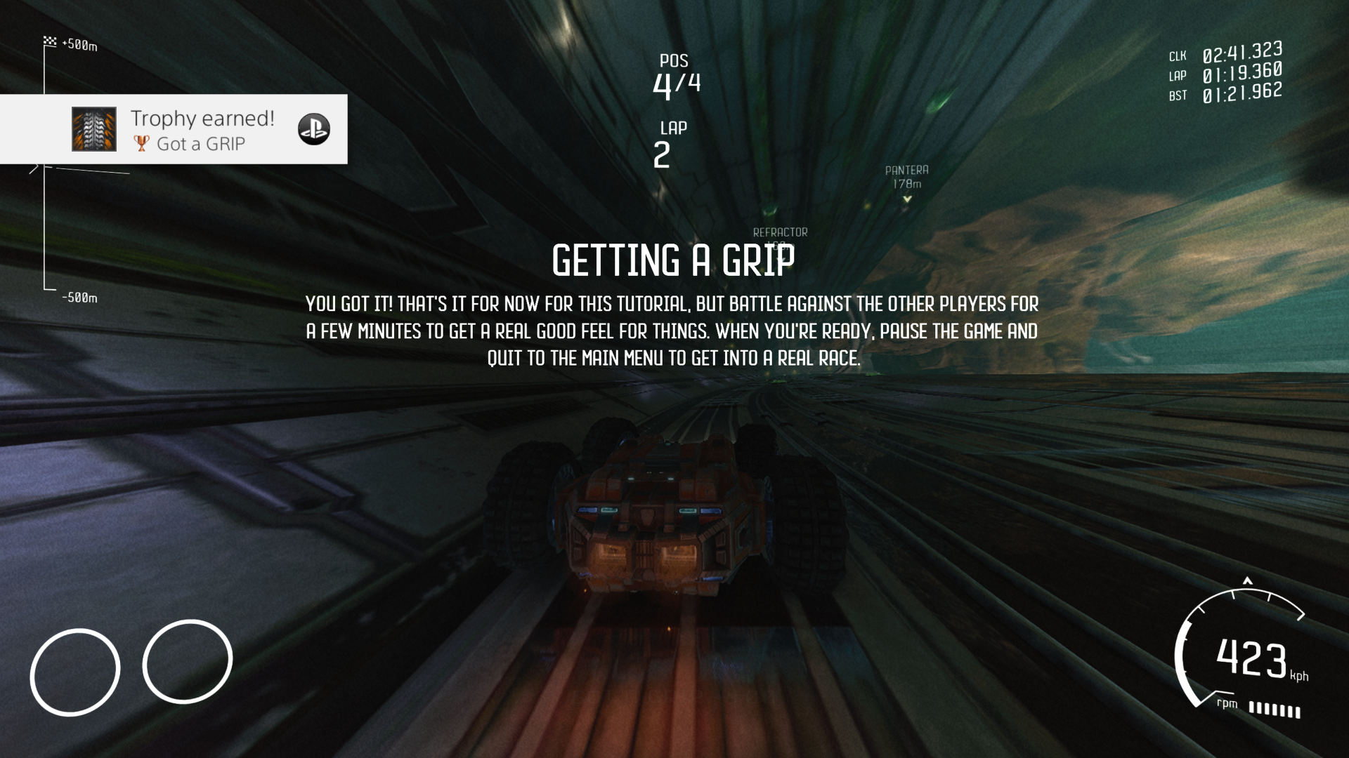 GRIP is a combat racer. Much like WipEout, the pickups on offer in GRIP are mostly grounded in reality, or at least sci-fi reality. There’s heat-seeking missiles, miniguns, boosts, and shields, along with other pickups that must be unlocked through the campaign. Each vehicle can hold two weapons, fired with L1 and R1. The weapon in the second slot can be sacrificed to power up the first, resulting in more damage, or better protection in the case of defensive pickups. This isn’t really explained in GRIP’s incredibly light tutorial, but is a feature that is indicated in the in-game guide. In other words, for players who don’t bother to read, they may not realize they have more combat options unless they stumble upon this information online, or figure out the charging mechanic on their own. In that regard, GRIP is much like the ‘90s games it draws inspiration from, with less hand holding. This may annoy younger gamers, but it also leaves a sense of discovery many games are lacking these days.