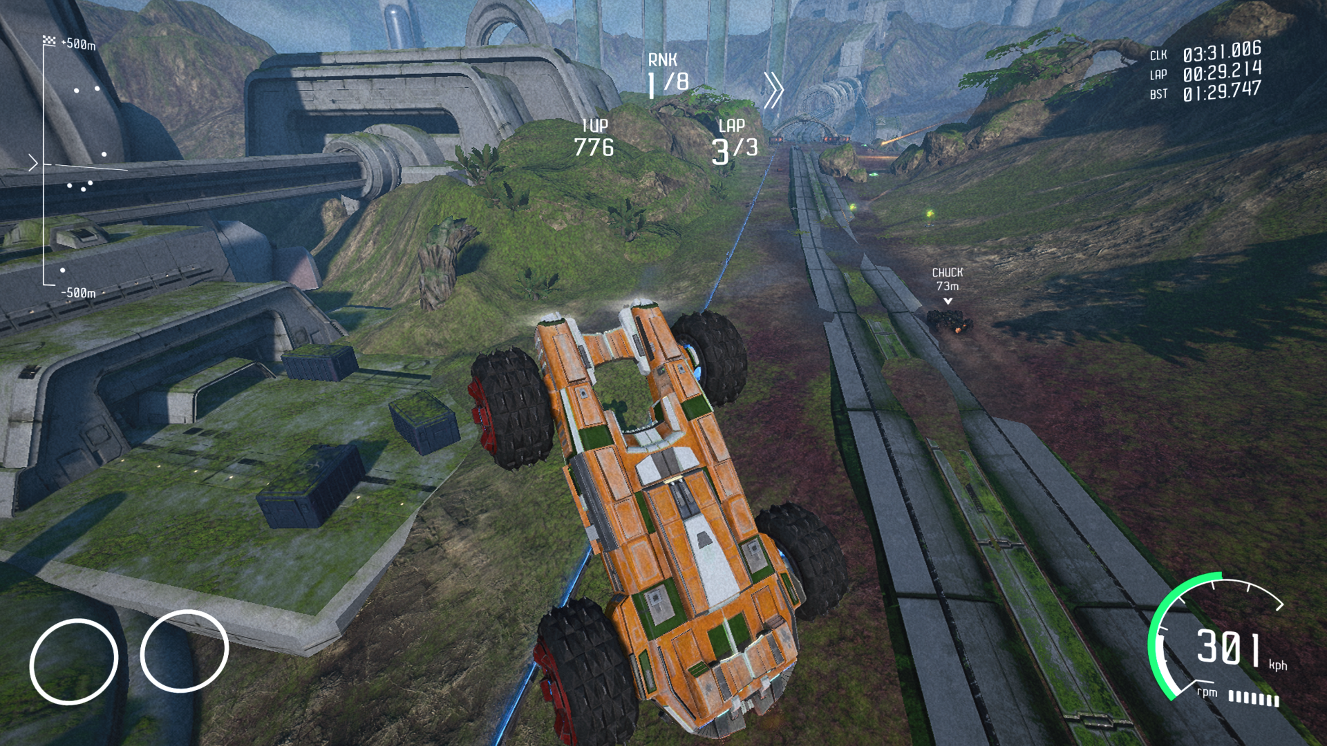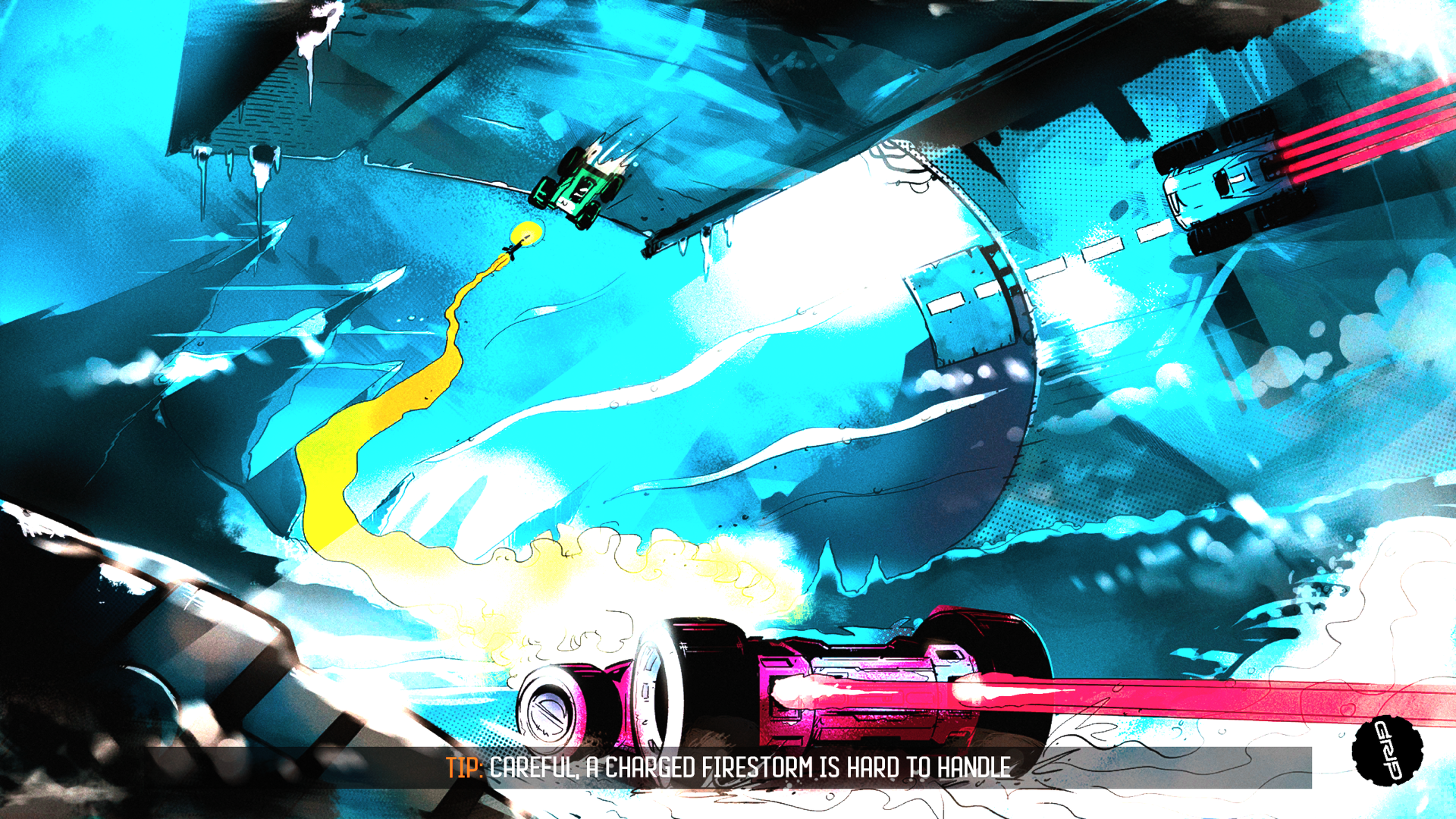 Children of the ‘90s might remember the Tyco Rebound R/C car. This was a toy that could handle the roughest terrain, because if it ever flipped over on a particularly steep incline, the car was designed in such a way that it could keep going with little issue. GRIP’s cars have essentially this same feature, but brought to the player at a much faster speed. All vehicles are vertically symmetrical, so that if they flip, they can still drive.