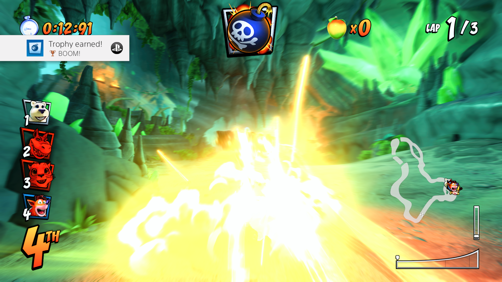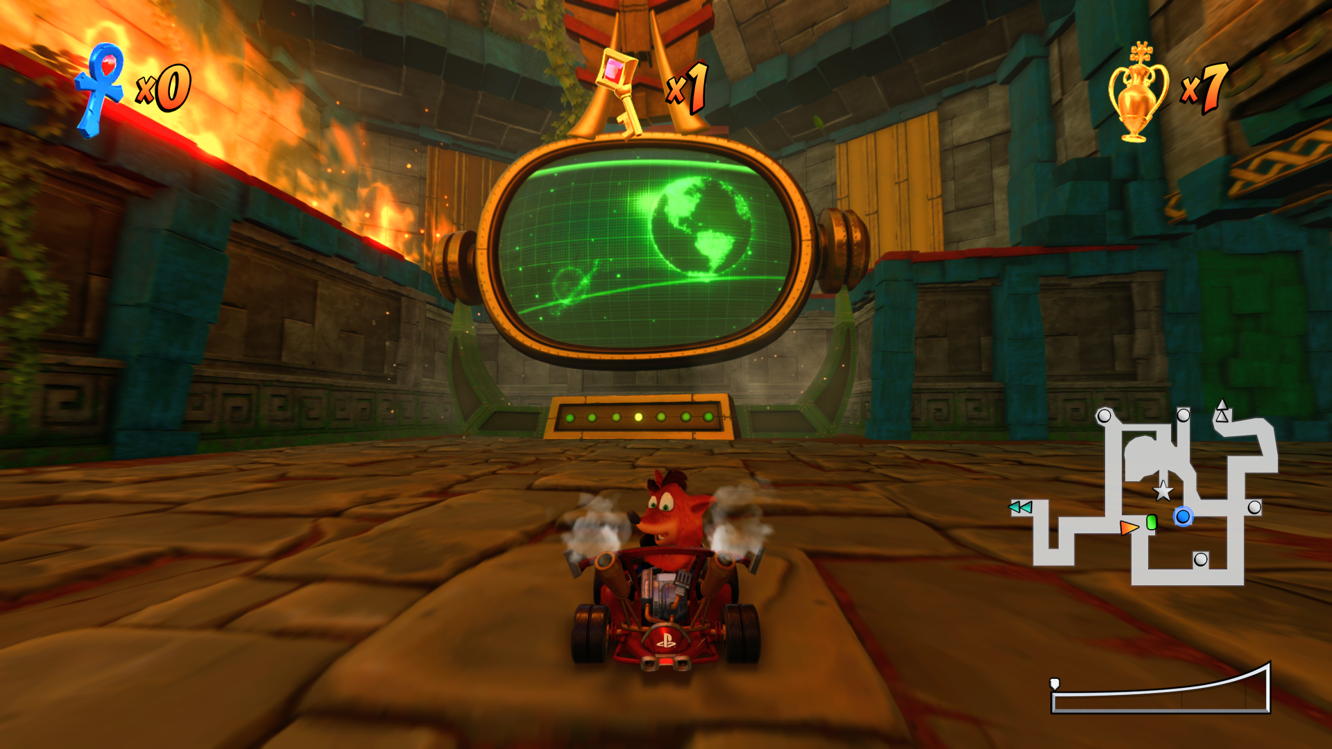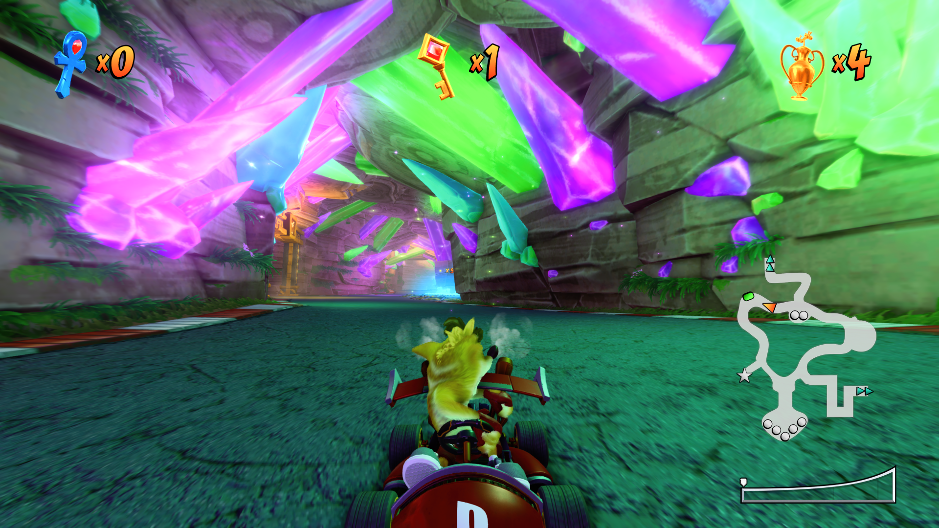 Games from two generations ago were tough. Crash Team Racing Nitro-Fueled has brought along the same difficulty as in the original release. For the main campaign, this means that progression can only occur when the player wins a race. A 3rd or even 2nd place finish won’t cut it. This form of difficulty is a double-edged sword. While it’s faithful to the original release, often times winning a race comes down to the luck of the pickup draw, and sometimes the game feels unfair in its treatment of the player when they’re winning. On the other hand, if the distance between first place and the rest of the racers is large enough, most items will not affect the leader. So, knowing a particular course’s layout can help to tilt things in the player’s favor.