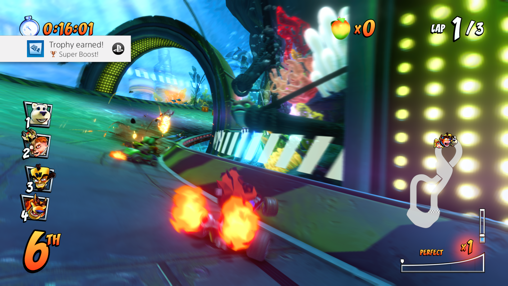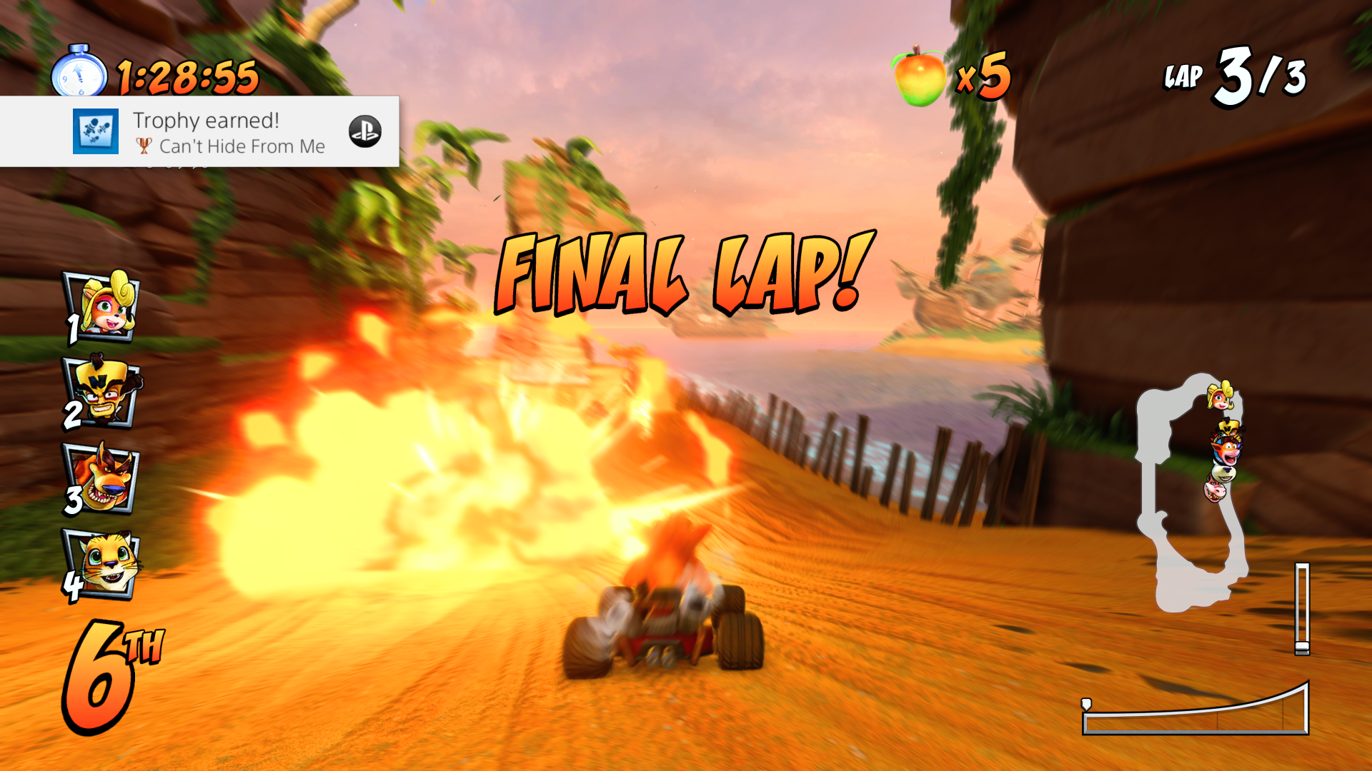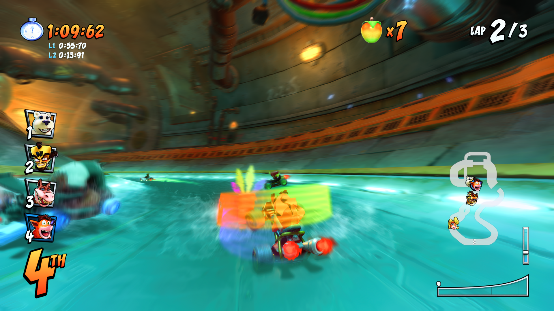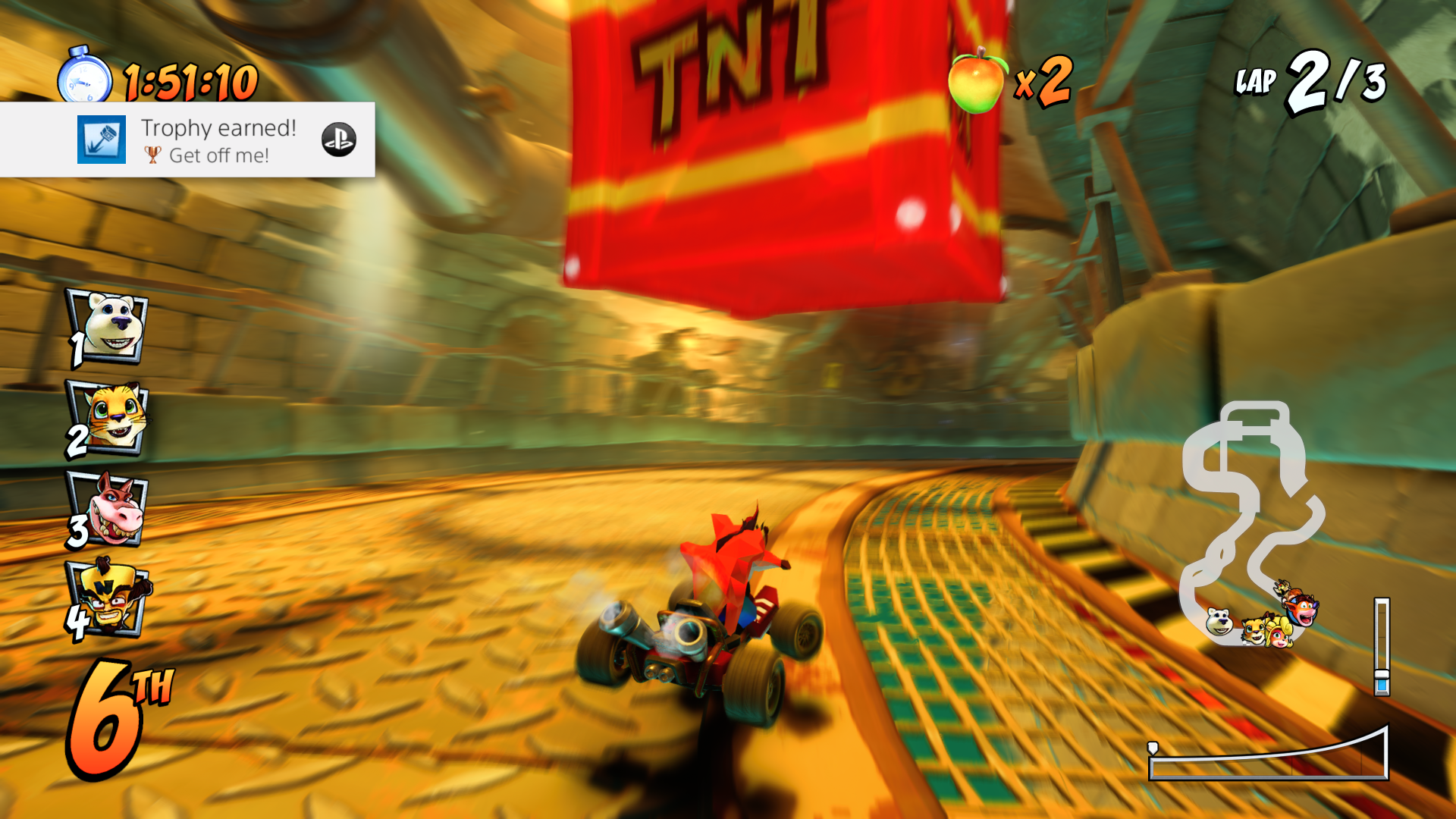 Games from two generations ago were tough. Crash Team Racing Nitro-Fueled has brought along the same difficulty as in the original release. For the main campaign, this means that progression can only occur when the player wins a race. A 3rd or even 2nd place finish won’t cut it. This form of difficulty is a double-edged sword. While it’s faithful to the original release, often times winning a race comes down to the luck of the pickup draw, and sometimes the game feels unfair in its treatment of the player when they’re winning. On the other hand, if the distance between first place and the rest of the racers is large enough, most items will not affect the leader. So, knowing a particular course’s layout can help to tilt things in the player’s favor.
