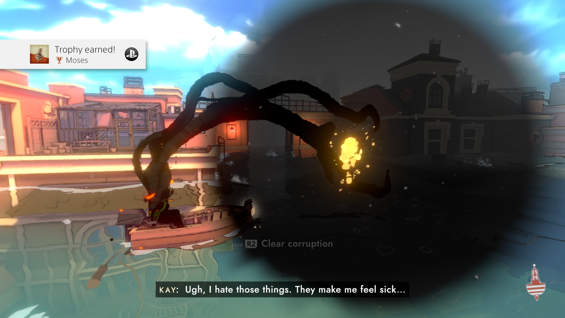 That simplicity is one of Sea of Solitude’s less appealing aspects. Kay is given the power to generate a flare at any time by pressing and holding L2. These flares automatically seek out wherever Kay is supposed to go to next. It is also occasionally used to turn on an overhead light, which can dispatch enemies. Besides jumping and maneuvering a boat, Kay’s only other action is to suck up corruption by holding R2, and occasionally merging with these spirit-looking versions of herself to align some sort of energy beam while screaming as though being cut open while still conscious. There’s some symbolism going on here about depression, and how it feels to overcome internal conflict, but it only ever remains an abstract representation, and so it may just fly by many gamers unnoticed.