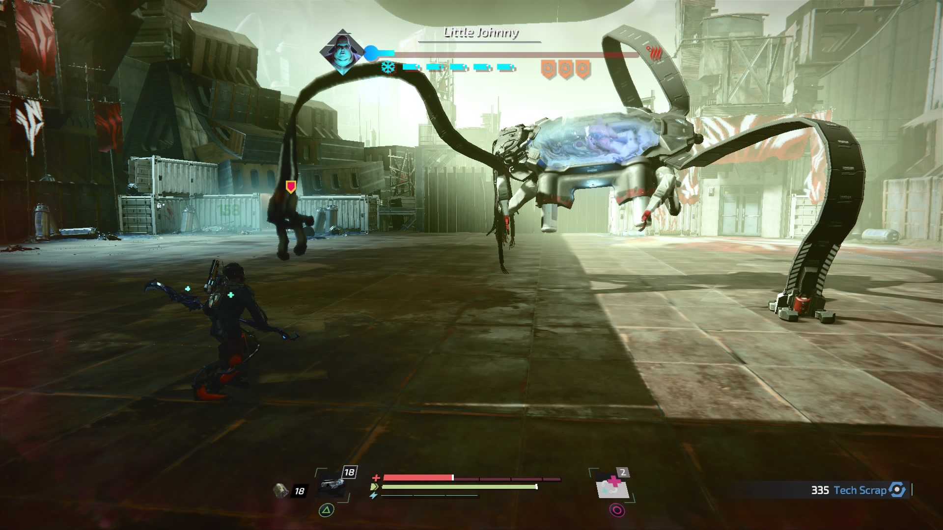 Death has its own unique twists too. Like many Souls games when you die you drop all your tech scrap, which serves as the game’s XP, and need to collect it without dying again or you’ll lose it forever. However, as long as the tech scrap is on the ground it can help you out. When you’re near a cache of scrap you dropped, it will slowly regenerate your health. Picking it up will also bring you back to full health. More than once I realized I was going to lose a fight and made use of this system, dying in a convenient spot that I could exploit for regeneration purposes during my next go. Of course, this is a high-risk move as losing all that scrap would be a terrible waste.