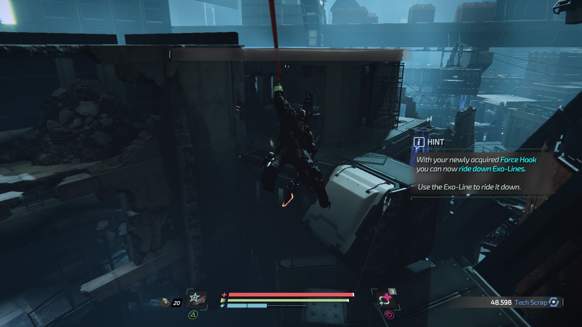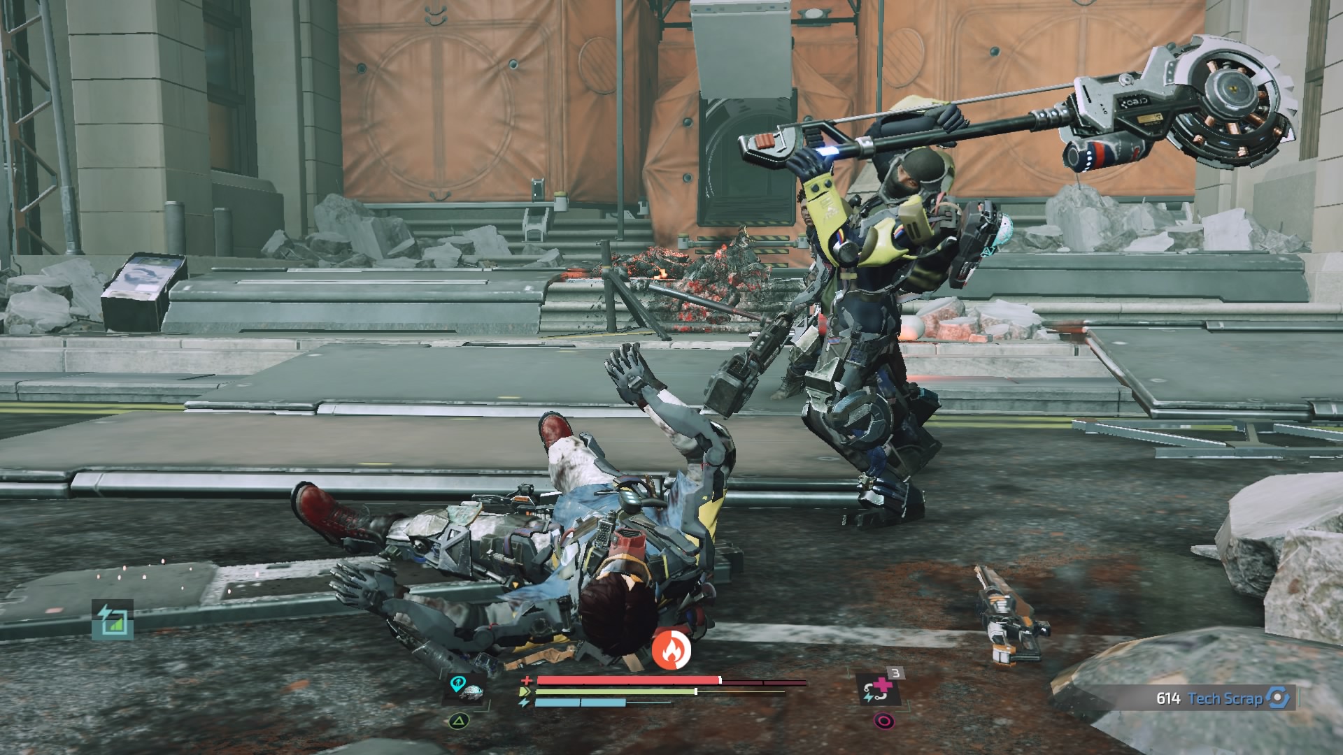 Despite this, the combat never really loses its edge, nor its fun. Getting to use a directional parry to stun an enemy, then literally punch their head so hard it flies off their body, is always extremely satisfying. Likewise, the relief of getting through a difficult section or surviving an ambush with your life and tech scrap intact is just amazing. It also helps that the world of Jericho City is fun to explore. It’s the perfect size that I never felt under or overwhelmed, and there’s plenty of neat little side passages that I was able to discover and use to find my way around. Besides, any game that lets me use zip lines through a destroyed city is a winner in my book.