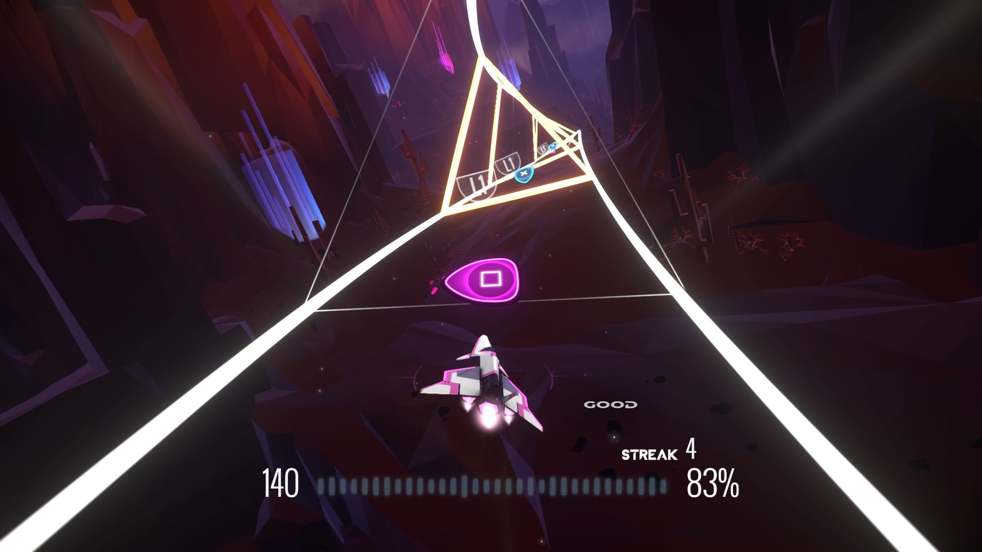 But the one thing AVICII Invector really nails is a sense of style. It’s a futuristic and minimalistic game following a spaceship pilot who is traveling through the songs you play. Each region has its own distinct background look and color palette, and your surroundings get more intense and vivid as your combo grows by successfully hitting notes. The transition from tunnels to an open road and eventually open air feels great and has this real sense of movement. It definitely feels more like you’re racing toward the note indicators, rather than being a stationary being waiting for them to come to you.