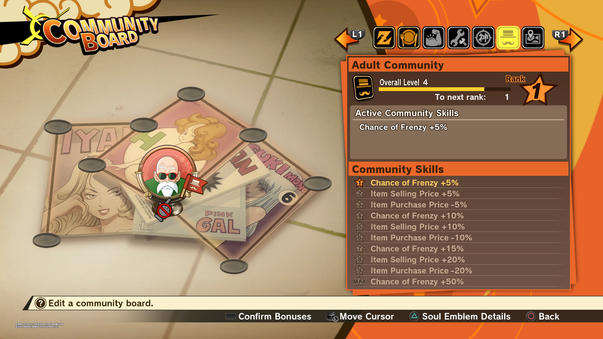 Dragon Ball Z: Kakarot is a third-person action RPG, which takes place in a semi-open world version of Earth. The world is divided up into multiple areas that are unlocked as the story progresses. In between major story episodes, the player is free to collect Z orbs of different colors, which can be used to upgrade stats. As new characters are encountered, their community emblems can be collected. These emblems can be placed on one of seven community boards. Each board requires the player to have met the community leader before being able to be used. Goku leads the Z-Fighter board, for instance. Each emblem has individual stats for each community board type. For example, the Gohan emblem will start with more levels in the Z-Fighter board, while someone like Chi-Chi will have extra levels in the Cooking category. Placing emblems next to others in a certain combination can result in bonus levels being awarded.