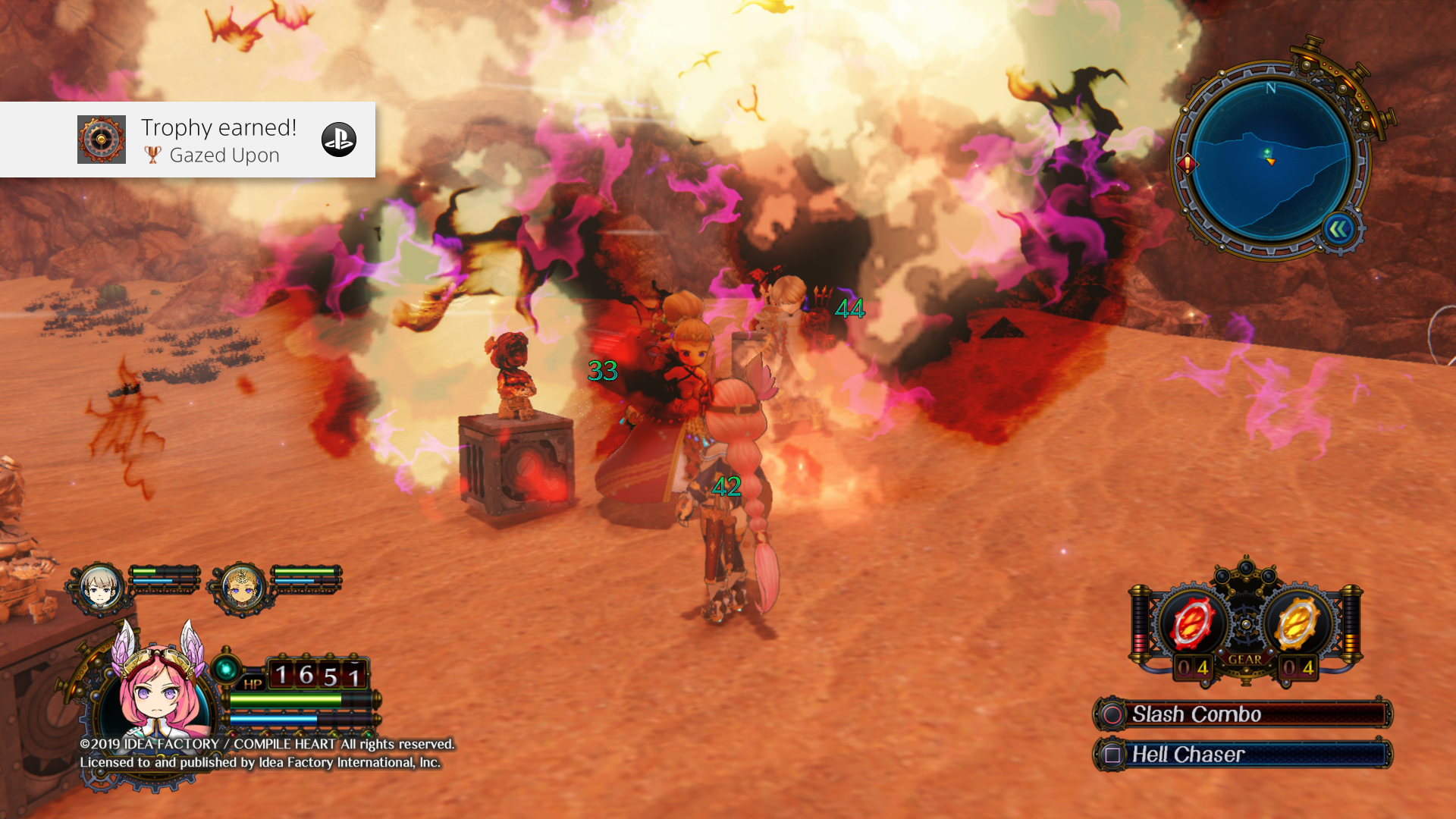 Arc of Alchemist takes place a distant time after a world war decimated the Earth’s water resources, and much, perhaps all, of the planet has been reduced to a desert. Major Quinn and her subordinates are on a mission from their Lord to discover something called a Great Power, which is a legendary artifact purported to contain the power to save the world. The world is rather bland, and it is inhabited by massive enemies such as gigantic frogs, fox-like creatures, and more. How creatures so large could be supported on a planet with next-to-no water is never explained, but that’s video game logic for ya!