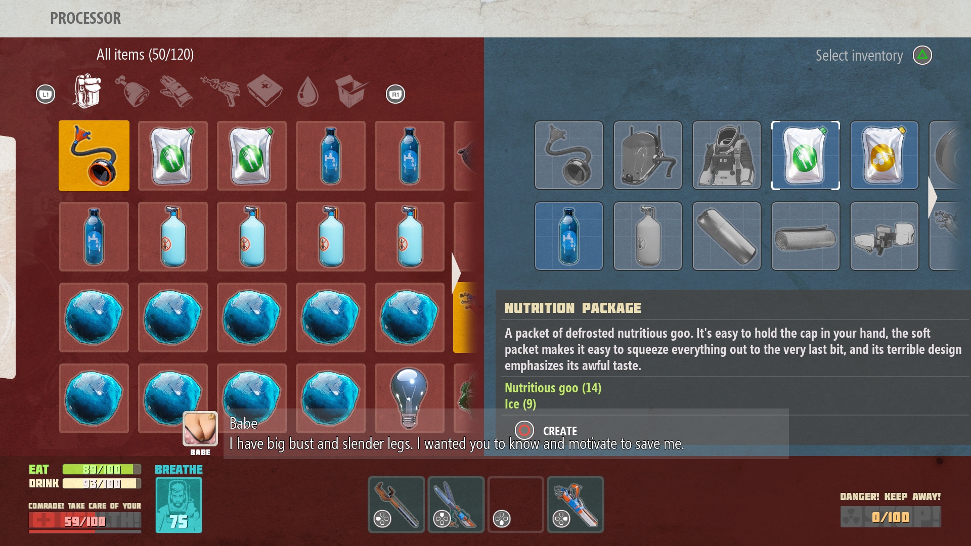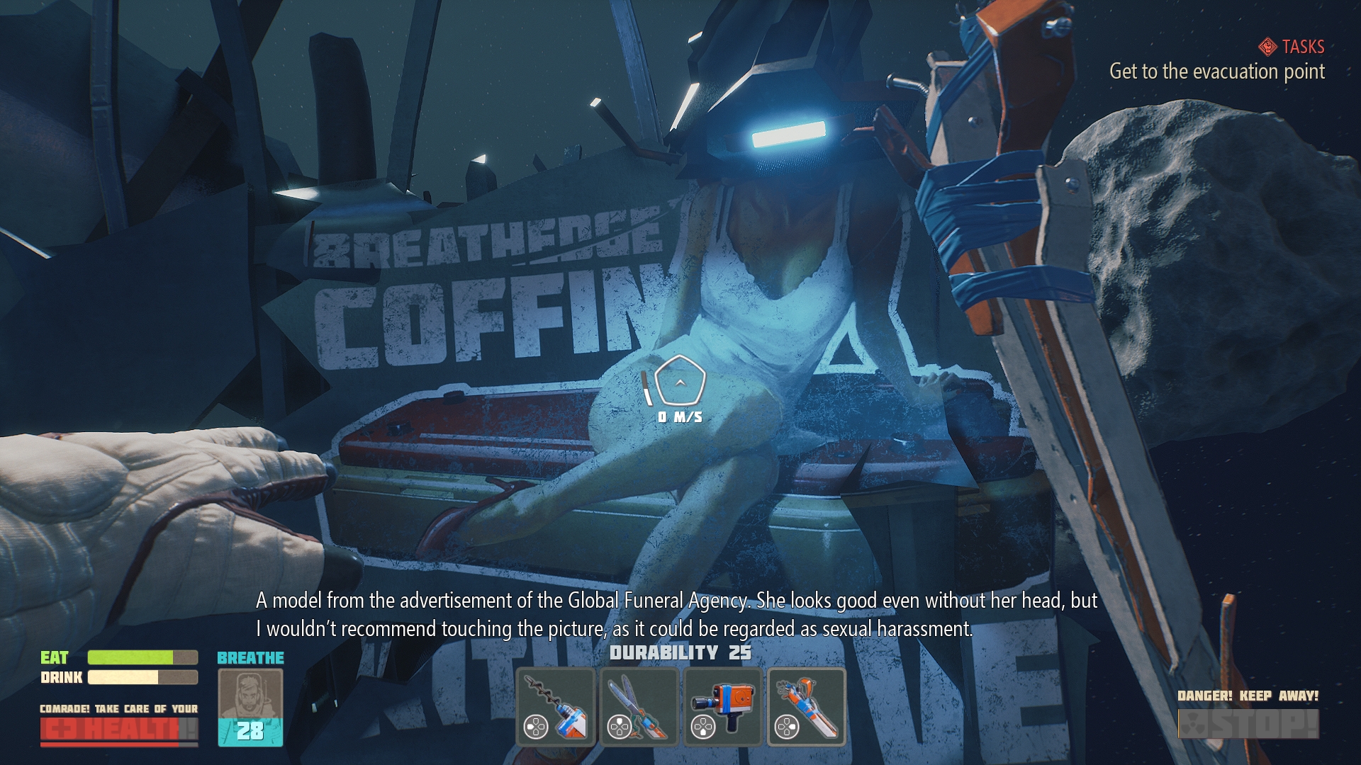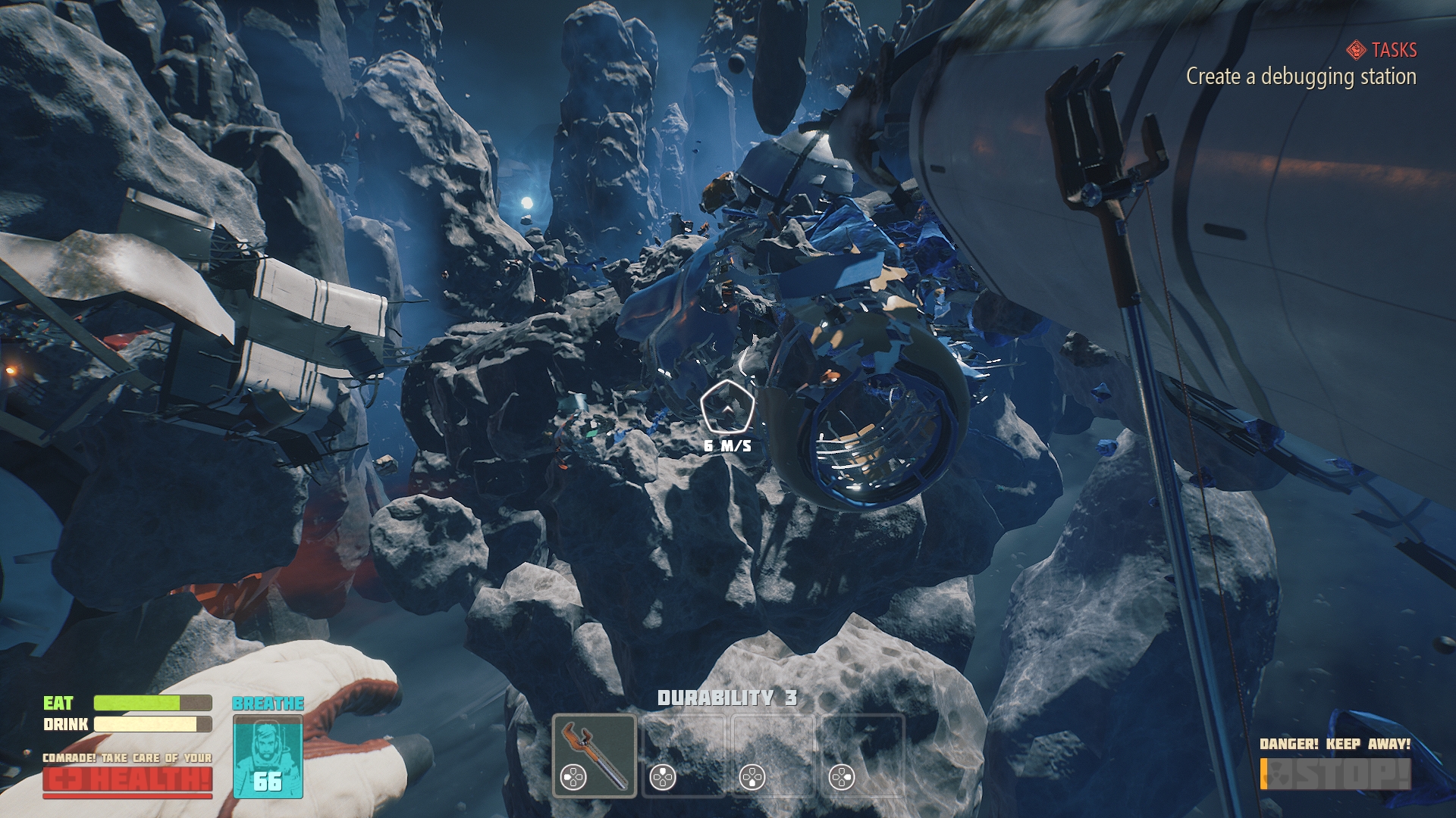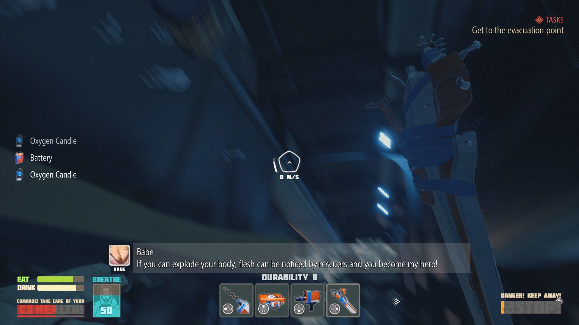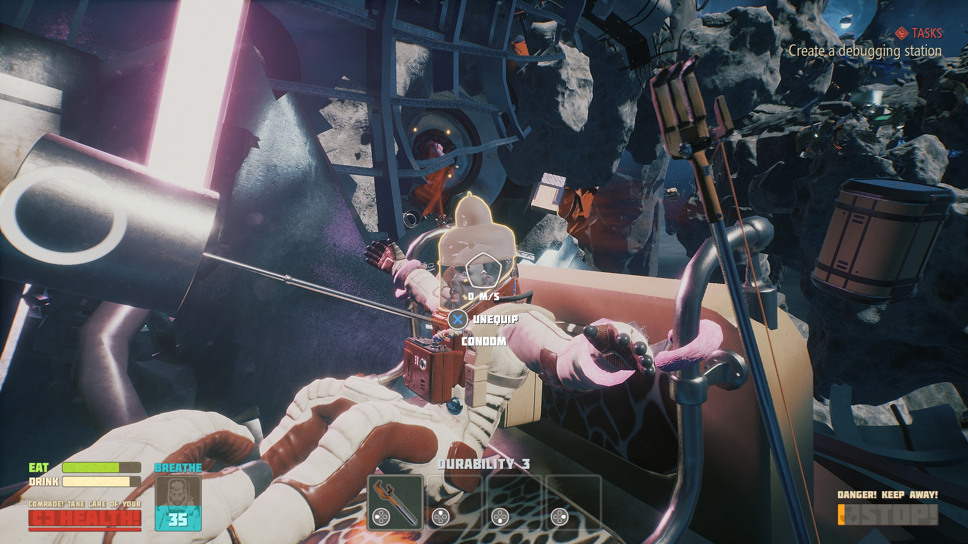 As with most survival games, expect to do a lot of resource collecting in Breathedge. Debris is scattered throughout the game, ranging from generic substances like ice and metal, to more specific things like batteries, resin, titanium, rubber, manure, and condoms. Thinking about sex in space is probably something most people don’t do too much, but the deviants at RedRuins apparently thought about this, a lot. A voiceless character named “Babe” shows up on the player’s communication device early on in the game, and they have an avatar that is nothing more than a random woman’s ample cleavage. She mentions that she wants you to come rescue her, and while she does point out places of interest throughout the game, she also seems to want you to die in gruesome ways. It’s a funny way to progress things along, but it may also give the player reason to not go to some points of interest out of fear of dying.