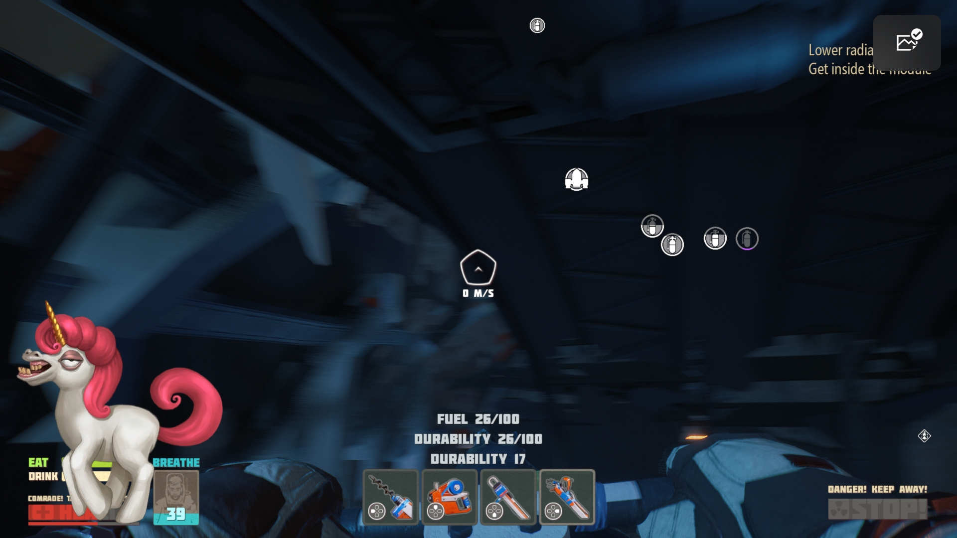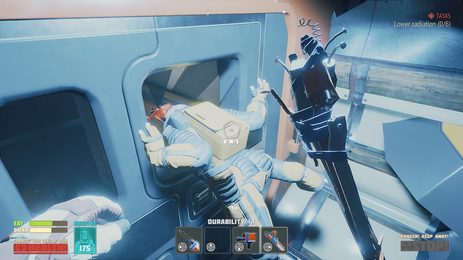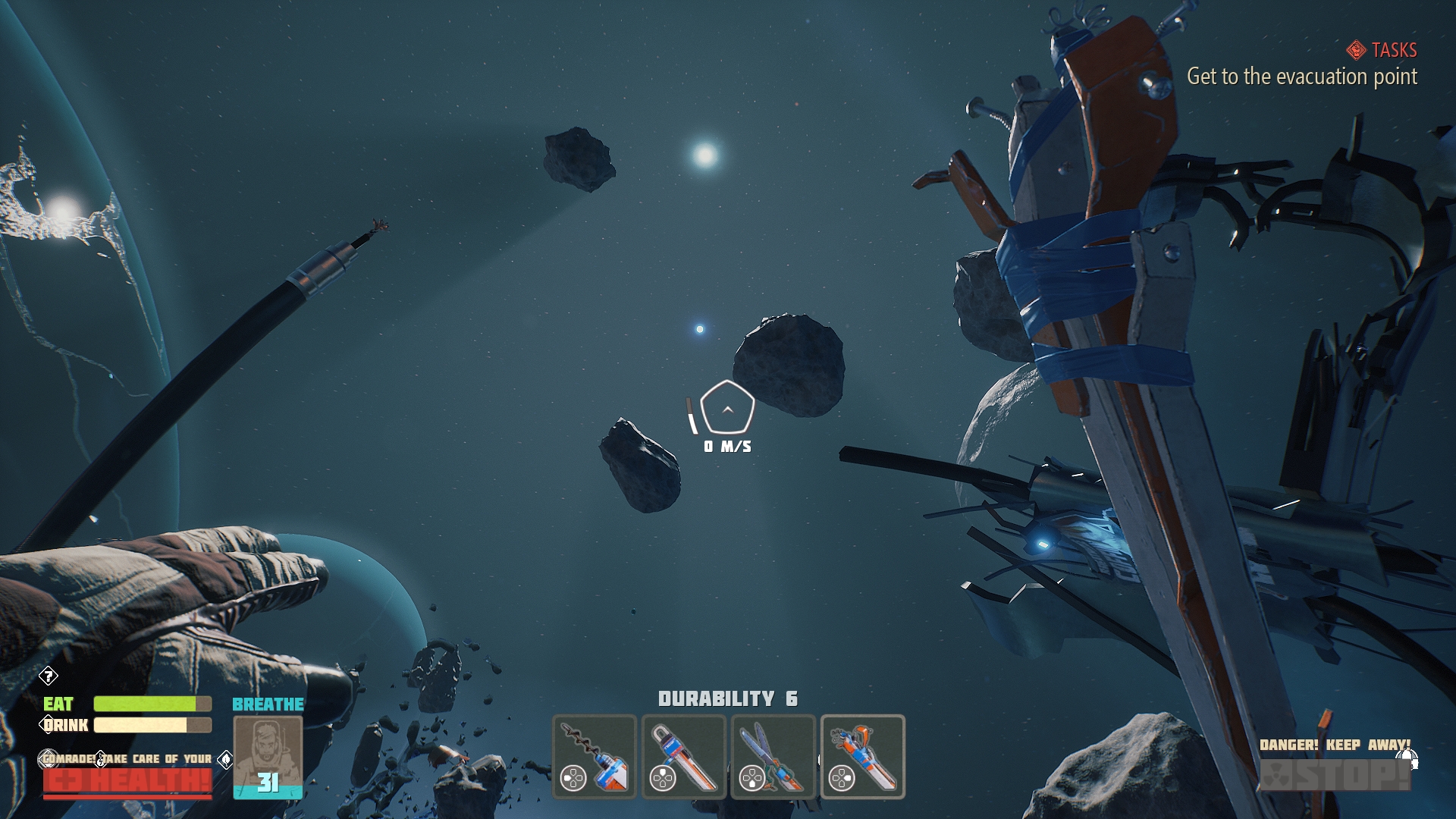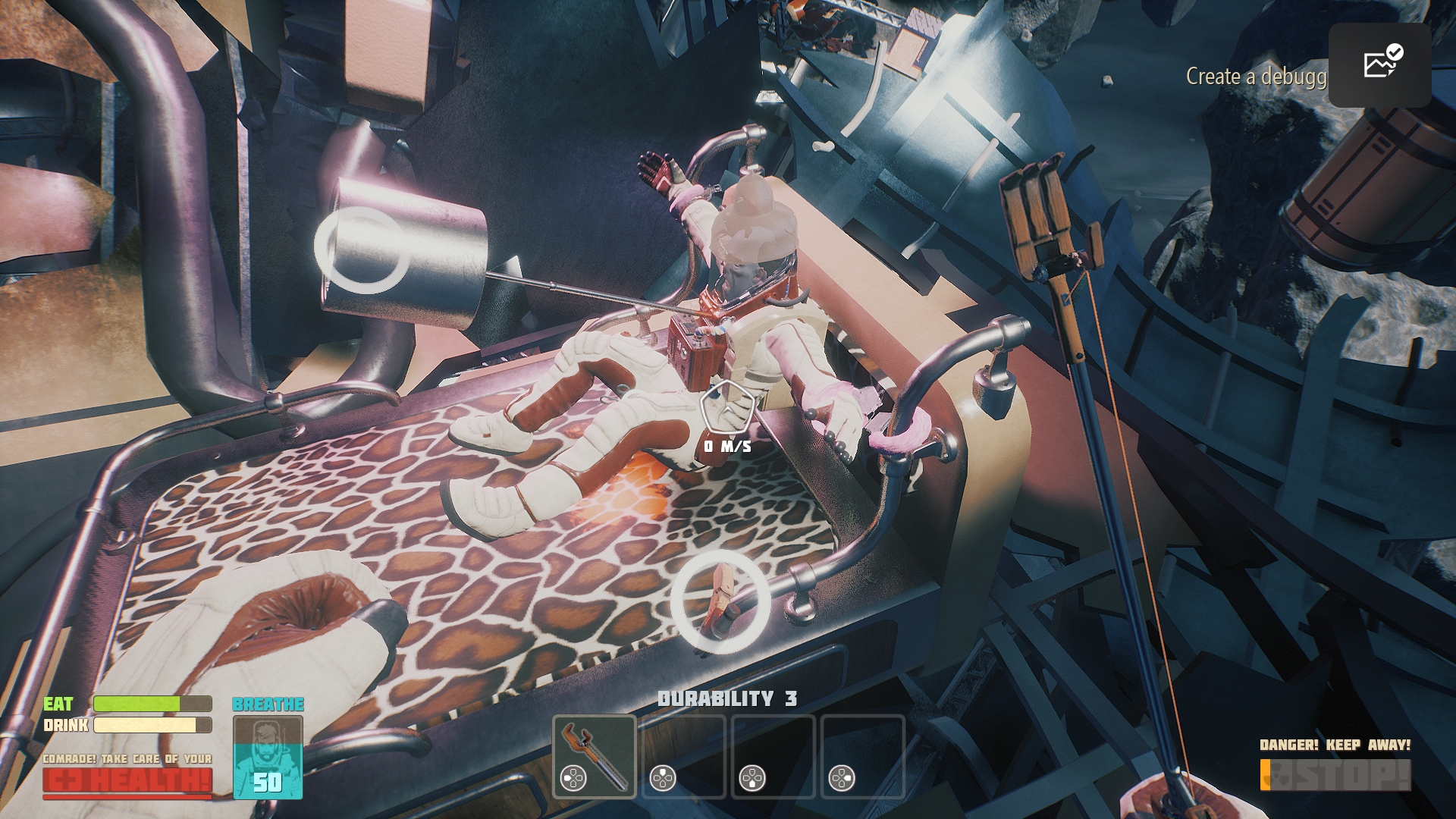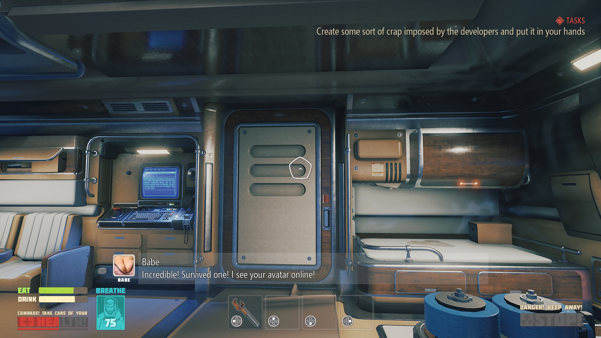 As with most survival games, expect to do a lot of resource collecting in Breathedge. Debris is scattered throughout the game, ranging from generic substances like ice and metal, to more specific things like batteries, resin, titanium, rubber, manure, and condoms. Thinking about sex in space is probably something most people don’t do too much, but the deviants at RedRuins apparently thought about this, a lot. A voiceless character named “Babe” shows up on the player’s communication device early on in the game, and they have an avatar that is nothing more than a random woman’s ample cleavage. She mentions that she wants you to come rescue her, and while she does point out places of interest throughout the game, she also seems to want you to die in gruesome ways. It’s a funny way to progress things along, but it may also give the player reason to not go to some points of interest out of fear of dying.
