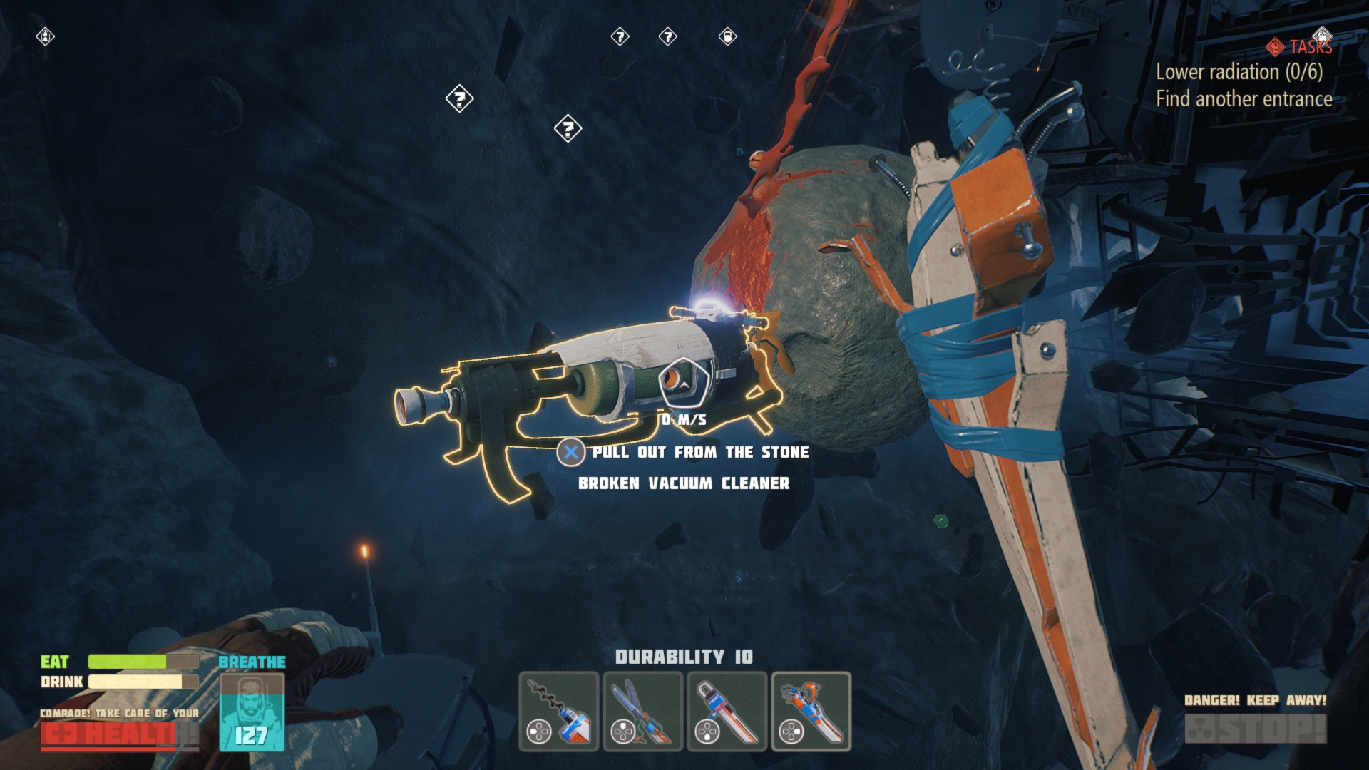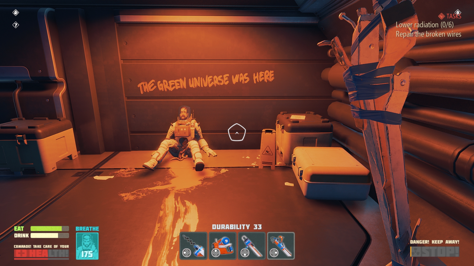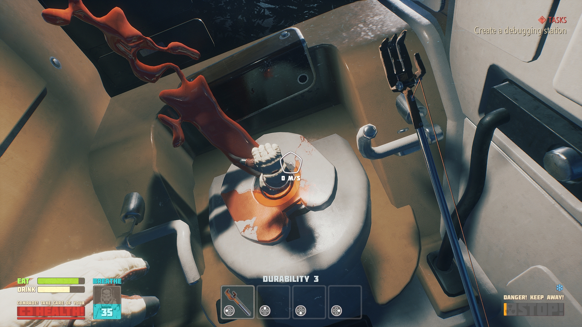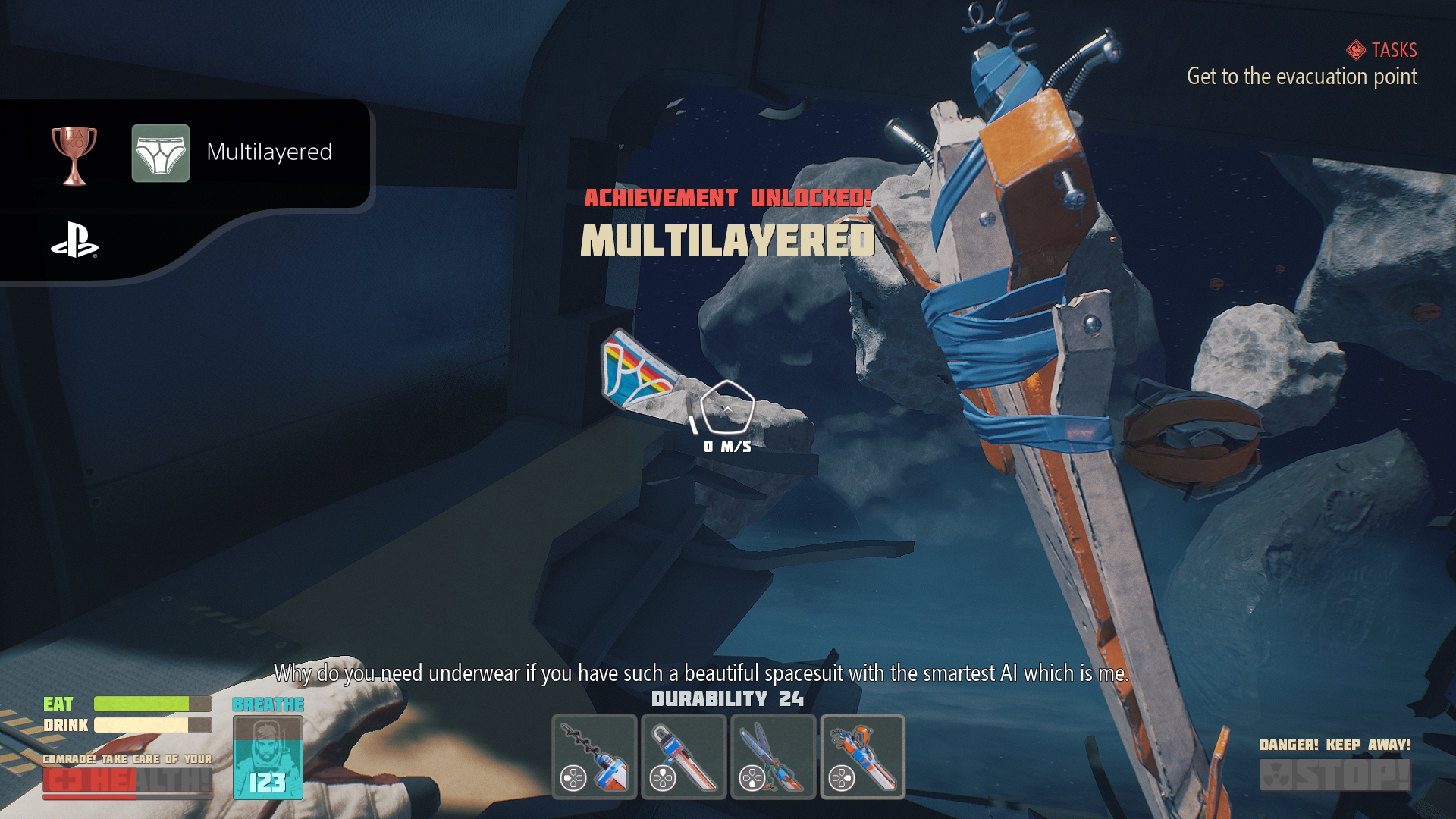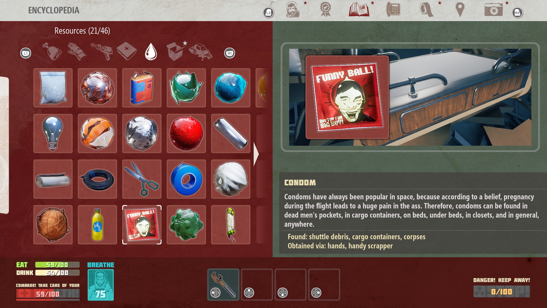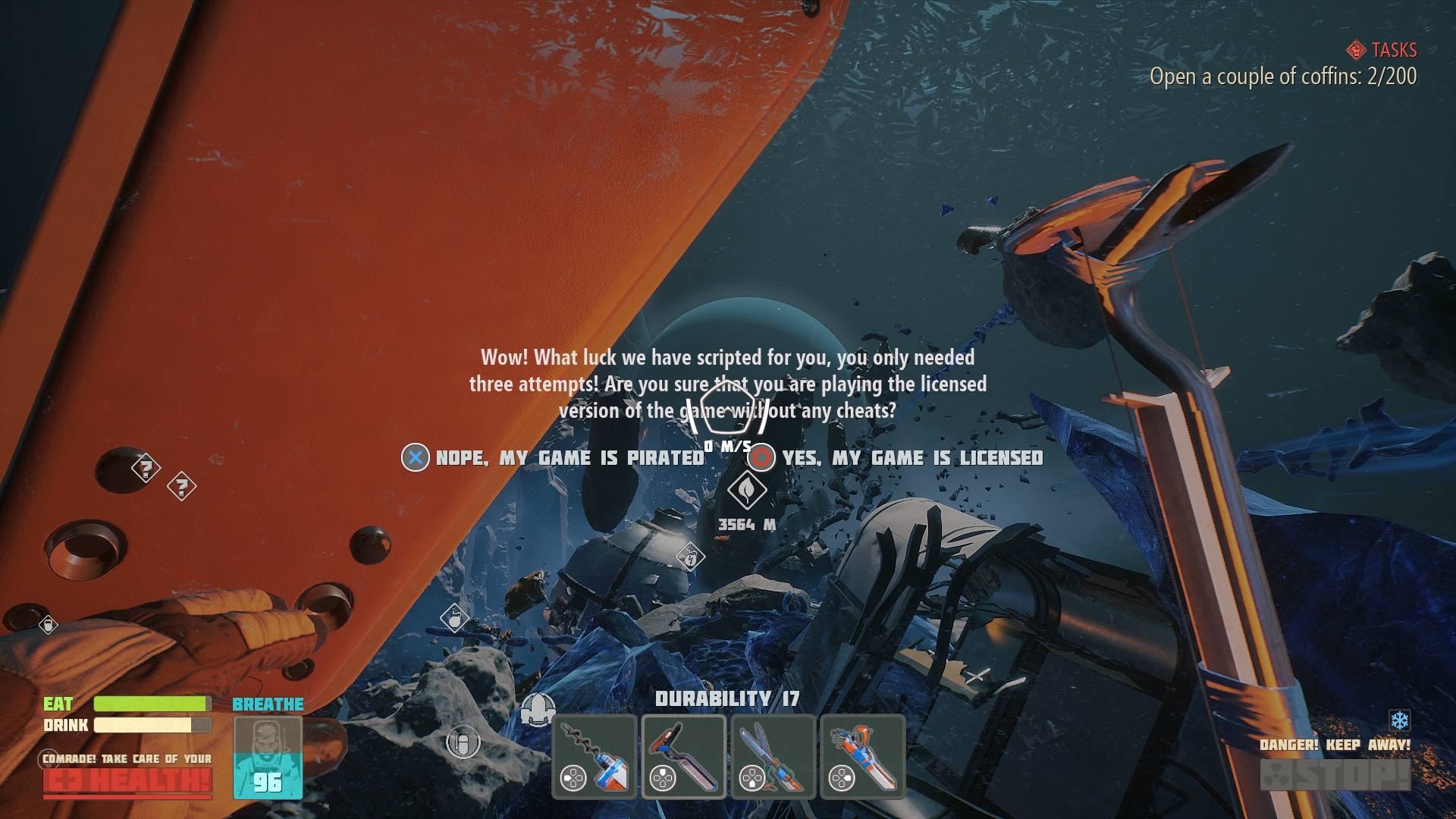As with most survival games, expect to do a lot of resource collecting in Breathedge. Debris is scattered throughout the game, ranging from generic substances like ice and metal, to more specific things like batteries, resin, titanium, rubber, manure, and condoms. Thinking about sex in space is probably something most people don’t do too much, but the deviants at RedRuins apparently thought about this, a lot. A voiceless character named “Babe” shows up on the player’s communication device early on in the game, and they have an avatar that is nothing more than a random woman’s ample cleavage. She mentions that she wants you to come rescue her, and while she does point out places of interest throughout the game, she also seems to want you to die in gruesome ways. It’s a funny way to progress things along, but it may also give the player reason to not go to some points of interest out of fear of dying.
